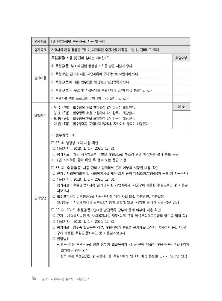86 경기도 사회복지관 평가지표 개발 연구 평가지표 F3. (전체공통) 후원금(품) 사용 및 관리 평가목표 지역사회 자원 활용을 위하여 체계적인 후원개발 계획을 수립 및 관리하고 있다. 평가내용 후원금(품) 사용 및 관리 상태는 어떠한가? 해당여부 ① 후원금(품) 부조리 관련 행정상 조치를 받은 사실이 없다. ② 후원개발, 관리에 대한 사업계획이 구체적으로 수립되어 있다. ③ 후원금(품)에 대한 영수증을 발급하고 발급목록이 있다. ④ 후원금(품)의 수입 및 사용내역을 후원자에게 연1회 이상 통보하고 있다. ⑤ 후원자를 위한 프로그램이 연 1회 이상 실시되고 있다. 배점기준 · 우 수 (4점) : 필수항목 ①을 포함하여 5개 항목이 해당된다. · 양 호 (3점) : 필수항목 ①을 포함하여 4개 항목이 해당된다. · 보 통 (2점) : 필수항목 ①을 포함하여 3개 항목이 해당된다. · 미 흡 (1점) : 필수항목을 포함하지 않거나, 2개 이하 항목이 해당된다. 점 수 평가방법 ※ 필수항목 : ① □ F3-① 행정상 조치 사항 확인 ○ 대상기간 : 2018. 1. 1 ~ 2020. 12. 31 ○ 평가자료 : 해당 지자체로부터 받은 후원금(품) 부조리 관련 행정처분 결과 통보 공문 ※ 소관 지자체를 통해 확인 후 점수 또는 등급 조정 □ F3-②, 후원금(품) 사용・관리 사업계획서 존재 여부와 시행한 내용 확인 ○ 근거 : 사회복지법인 및 사회복지시설 재무・회계 규칙 제41조의7(후원금의 용도 외 사용금지) ○ 대상기간 : 2018. 1. 1 ~ 2020. 12. 31 ○ 평가자료 : 후원금(품) 사용・관리에 대한 사업계획서, 시군구에 제출한 후원금수입 및 사용결 과보고서 ○ 필수포함사항 : 후원금(품) 사용・관리에 대한 사업내용, 추진방안, 추진일정 ○ 인정범위 : 사업계획서에 필수포함사항이 포함해 있고, 시행한 결과가 있는 경우 인정 □ F3-③, F3-④ 후원금(품) 영수증 발급목록 장부의 존재 여부와 내용 확인 ○ 근거 : 사회복지법인 및 사회복지시설 재무・회계 규칙 제41조의4(후원금의 영수증 발급 등) ○ 대상기간 : 2018. 1. 1 ~ 2020. 12. 31 ○ 평가자료 : 영수증 발급목록 장부, 후원자에게 통보한 근거자료(소식지, 홈페이지 등), 시・군・ 구에 제출한 후원금(품) 수입 및 사용결과보고서 ○ 인정범위 - 항목 ③은 후원금(품) 관련 장부의 발급목록과 시・군・구에 제출한 후원금(품) 수입내역이 일치하는 경우 인정 - 항목 ④는 후원금(품) 및 사용내역을 후원자에게 연 1회 이상 통보한 근거가 있으면 인정