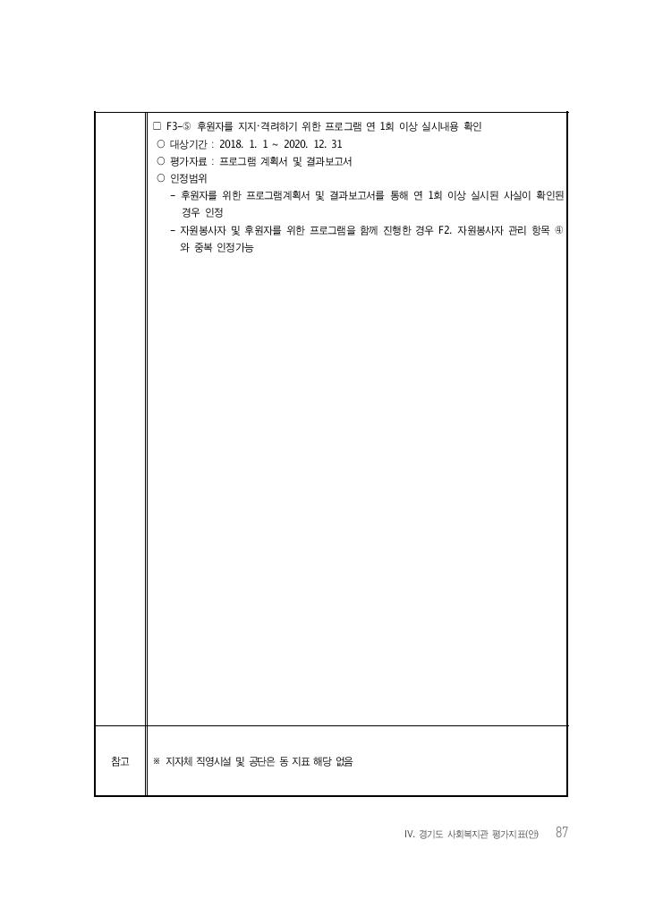 Ⅳ. 경기도 사회복지관 평가지표(안) 87 □ F3-⑤ 후원자를 지지・격려하기 위한 프로그램 연 1회 이상 실시내용 확인 ○ 대상기간 : 2018. 1. 1 ~ 2020. 12. 31 ○ 평가자료 : 프로그램 계획서 및 결과보고서 ○ 인정범위 - 후원자를 위한 프로그램계획서 및 결과보고서를 통해 연 1회 이상 실시된 사실이 확인된 경우 인정 - 자원봉사자 및 후원자를 위한 프로그램을 함께 진행한 경우 F2. 자원봉사자 관리 항목 ④ 와 중복 인정가능 참고 ※ 지자체 직영시설 및 공단은 동 지표 해당 없음