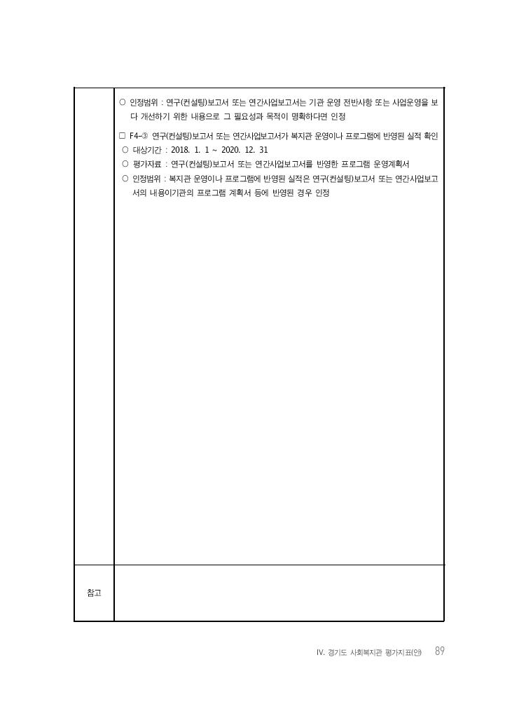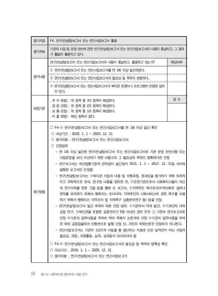 Ⅳ. 경기도 사회복지관 평가지표(안) 89 ○ 인정범위 : 연구(컨설팅)보고서 또는 연간사업보고서는 기관 운영 전반사항 또는 사업운영을 보 다 개선하기 위한 내용으로 그 필요성과 목적이 명확하다면 인정 □ F4-③ 연구(컨설팅)보고서 또는 연간사업보고서가 복지관 운영이나 프로그램에 반영된 실적 확인 ○ 대상기간 : 2018. 1. 1 ~ 2020. 12. 31 ○ 평가자료 : 연구(컨설팅)보고서 또는 연간사업보고서를 반영한 프로그램 운영계획서 ○ 인정범위 : 복지관 운영이나 프로그램에 반영된 실적은 연구(컨설팅)보고서 또는 연간사업보고 서의 내용이기관의 프로그램 계획서 등에 반영된 경우 인정 참고