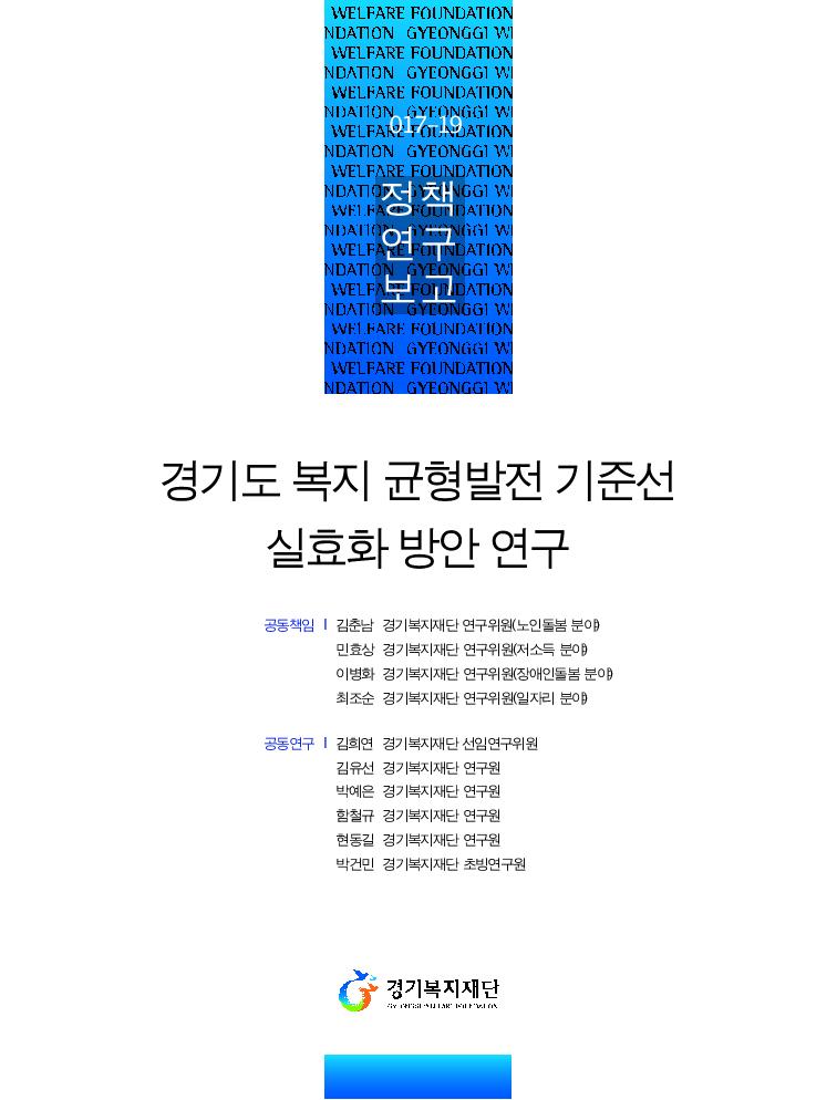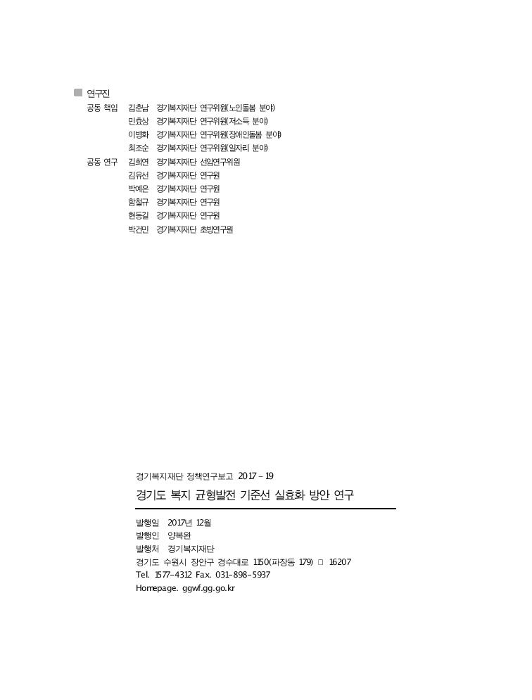 연구진 공동 책임 김춘남 경기복지재단 연구위원(노인돌봄 분야) 민효상 경기복지재단 연구위원(저소득 분야) 이병화 경기복지재단 연구위원(장애인돌봄 분야) 최조순 경기복지재단 연구위원(일자리 분야) 공동 연구 김희연 경기복지재단 선임연구위원 김유선 경기복지재단 연구원 박예은 경기복지재단 연구원 함철규 경기복지재단 연구원 현동길 경기복지재단 연구원 박건민 경기복지재단 초빙연구원 경기복지재단 정책연구보고 2017-19 경기도 복지 균형발전 기준선 실효화 방안 연구 발행일 2017년 12월 발행인 양복완 발행처 경기복지재단 경기도 수원시 장안구 경수대로 1150(파장동 179)  16207 Tel. 1577-4312 Fax. 031-898-5937 Homepage. ggwf.gg.go.kr