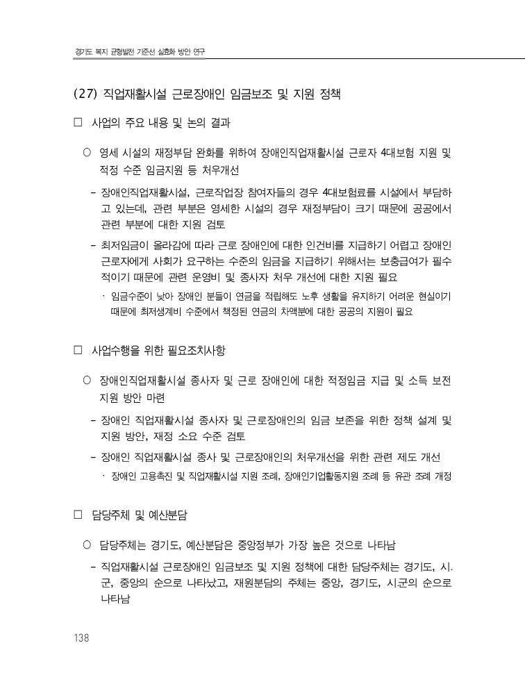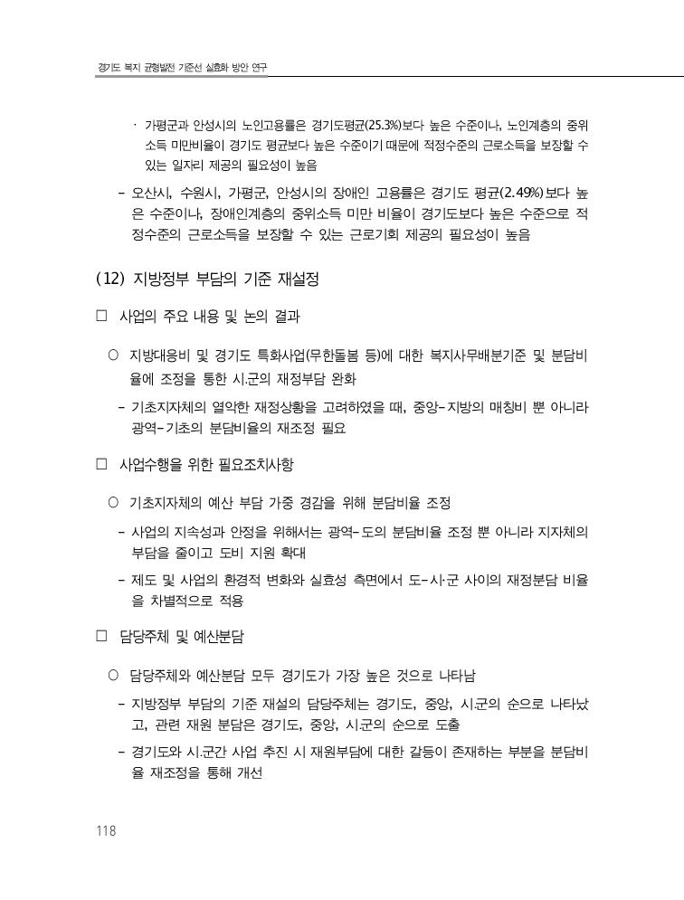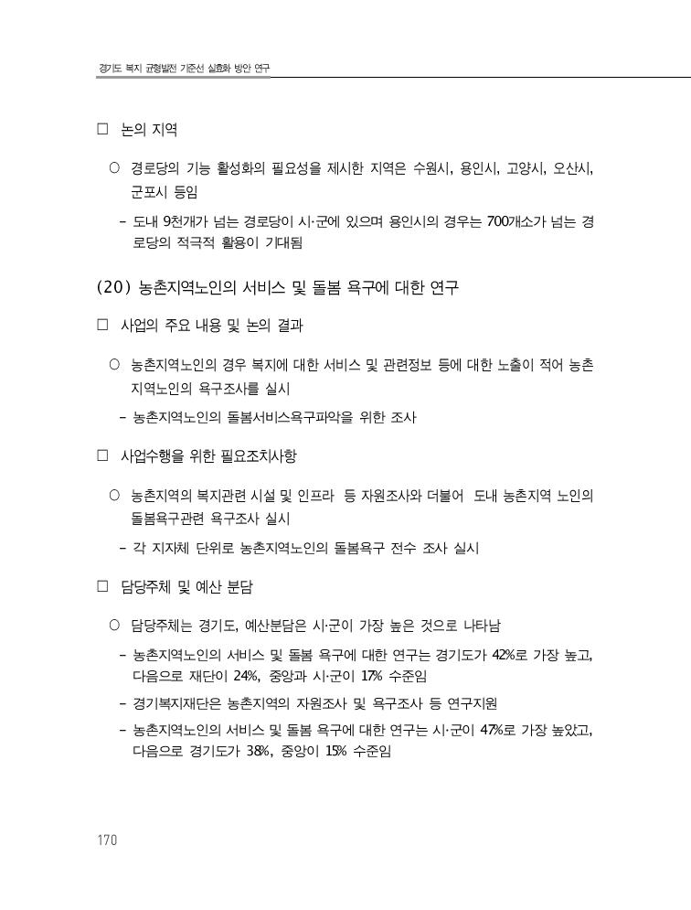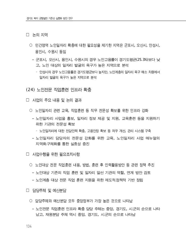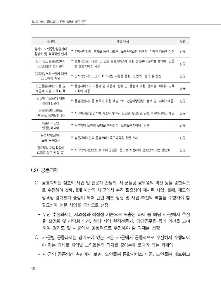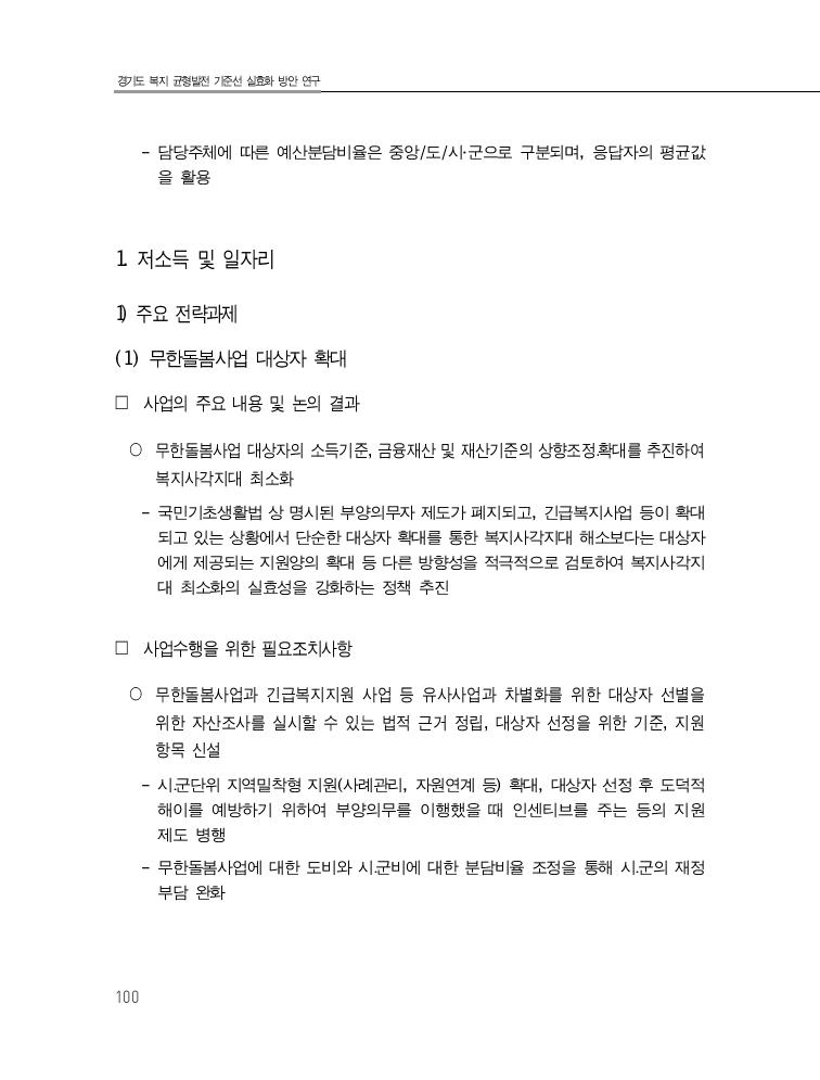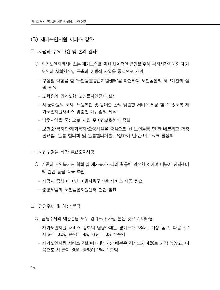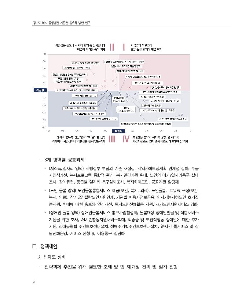 경기도 복지 균형발전 기준선 실효화 방안 연구 vi - 3개 영역별 공통과제 ・ (저소득/일자리 영역) 지방정부 부담의 기준 재설정, 지역사회보장계획 연계성 강화, 수급 자인식개선, 복지프로그램 통합적 관리, 복지민간가원 확대, 노인의 여가/일자리욕구 실태 조사, 장애유형, 등급별 일자리 욕구실태조사, 복지화폐도입, 공공기관 할당제 ・ (노인 돌봄 영역) 노인돌봄통합서비스 제공(보건, 복지, 의료), 노인돌봄네트워크 구성(보건, 복지, 의료), 장기요양탈락노인자원연계, 기관별 이용자정보공유, 인지기능저하노인 초기집 중지원, 치매에 대한 홍보와 인식개선, 독거노인신체활동 지원, 재가노인지원서비스 강화 ・ (장애인 돌봄 영역) 장애인돌봄서비스 홍보사업활성화, 돌봄대상 장애인발굴 및 적합서비스 지원을 위한 조사, 24시간활동지원서비스확대, 최중증 및 도전적행동 장애인에 대한 추가 지원, 장애유형별 주간보호센터설치, 생애주기별주간보호센터설치, 24시간 콜서비스 및 상 담전화운영, 서비스 신청 및 이용창구 일원화 □ 정책제언 ○ 법제도 정비 - 전략과제 추진을 위해 필요한 조례 및 법 제․개정 건의 및 절차 진행