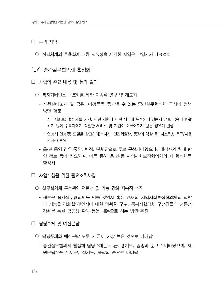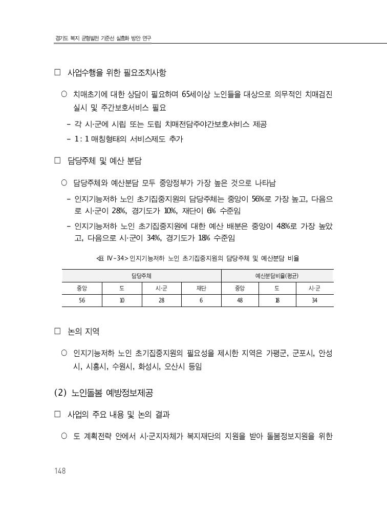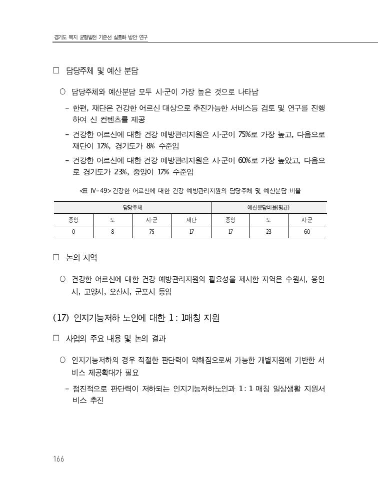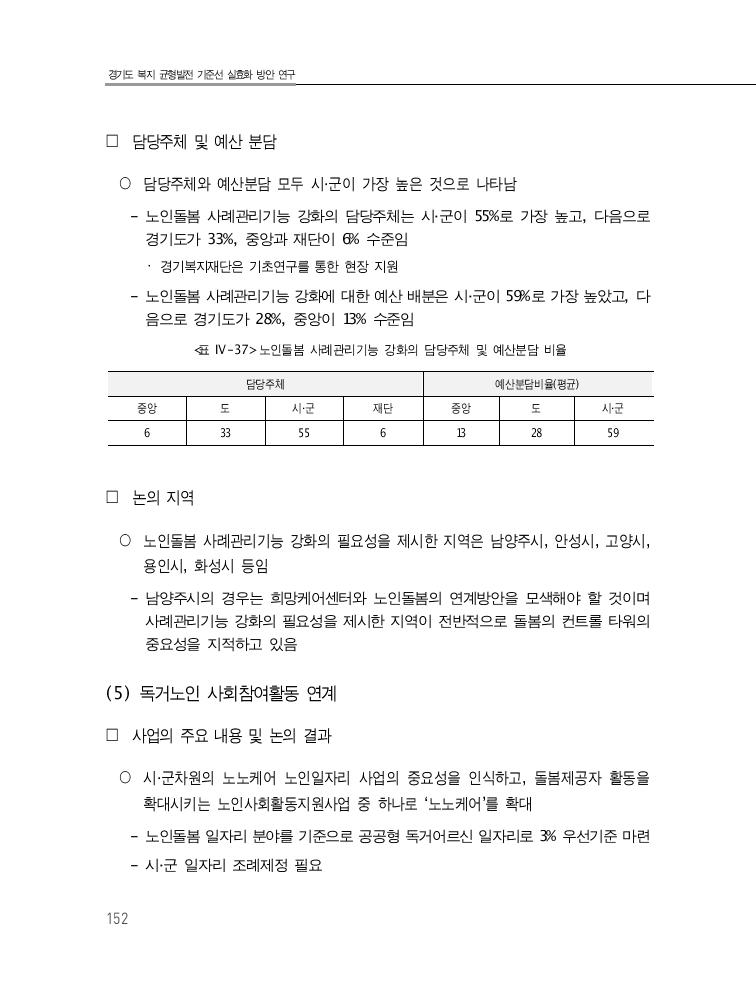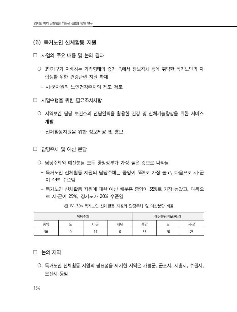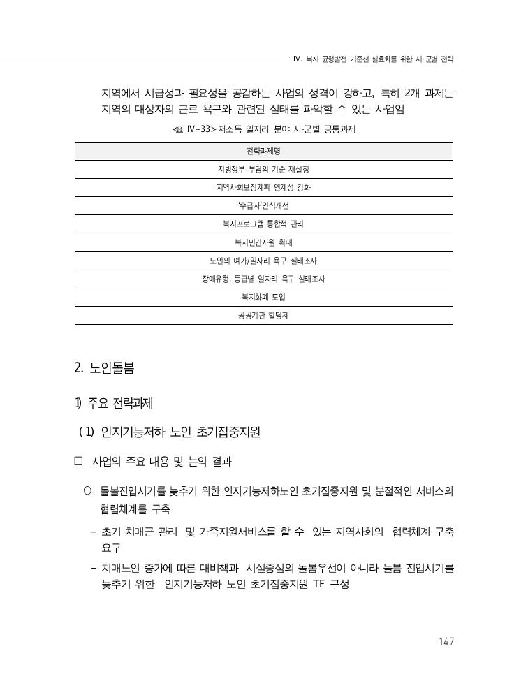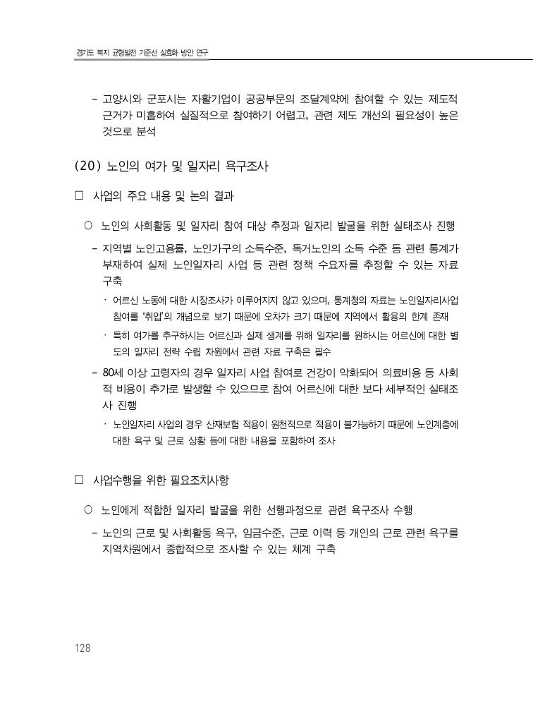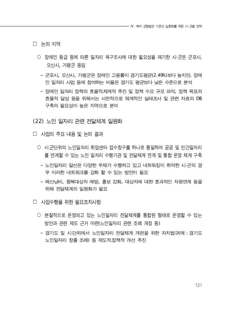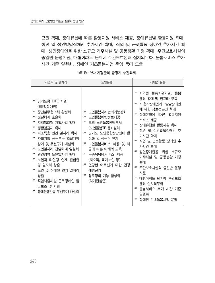 경기도 복지 균형발전 기준선 실효화 방안 연구 vi - 3개 영역별 공통과제 ・ (저소득/일자리 영역) 지방정부 부담의 기준 재설정, 지역사회보장계획 연계성 강화, 수급 자인식개선, 복지프로그램 통합적 관리, 복지민간가원 확대, 노인의 여가/일자리욕구 실태 조사, 장애유형, 등급별 일자리 욕구실태조사, 복지화폐도입, 공공기관 할당제 ・ (노인 돌봄 영역) 노인돌봄통합서비스 제공(보건, 복지, 의료), 노인돌봄네트워크 구성(보건, 복지, 의료), 장기요양탈락노인자원연계, 기관별 이용자정보공유, 인지기능저하노인 초기집 중지원, 치매에 대한 홍보와 인식개선, 독거노인신체활동 지원, 재가노인지원서비스 강화 ・ (장애인 돌봄 영역) 장애인돌봄서비스 홍보사업활성화, 돌봄대상 장애인발굴 및 적합서비스 지원을 위한 조사, 24시간활동지원서비스확대, 최중증 및 도전적행동 장애인에 대한 추가 지원, 장애유형별 주간보호센터설치, 생애주기별주간보호센터설치, 24시간 콜서비스 및 상 담전화운영, 서비스 신청 및 이용창구 일원화 □ 정책제언 ○ 법제도 정비 - 전략과제 추진을 위해 필요한 조례 및 법 제․개정 건의 및 절차 진행