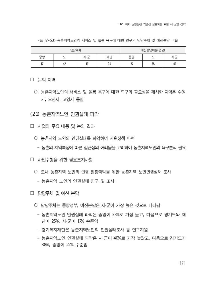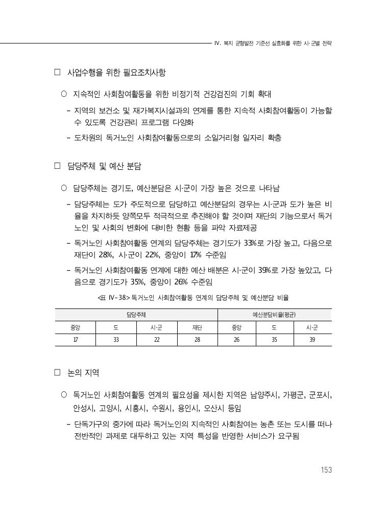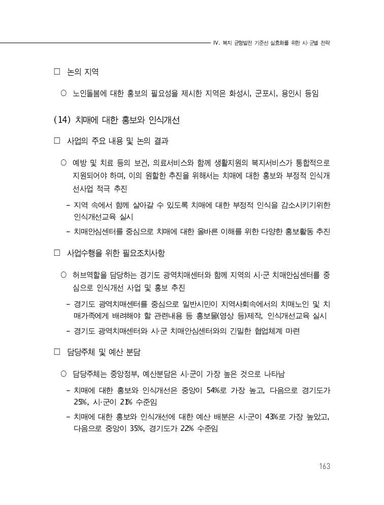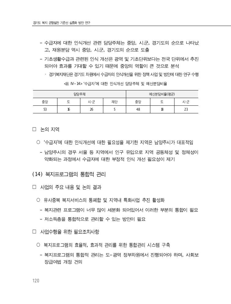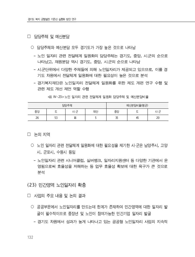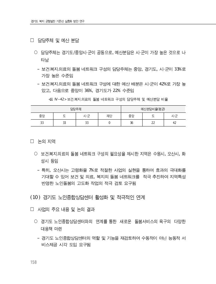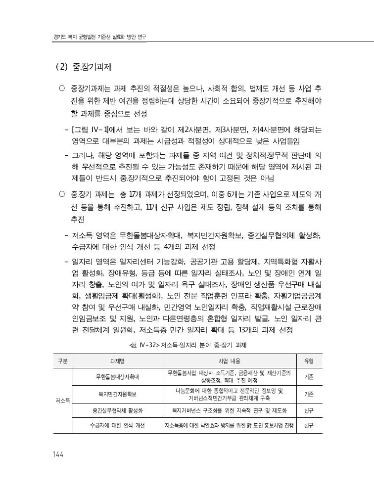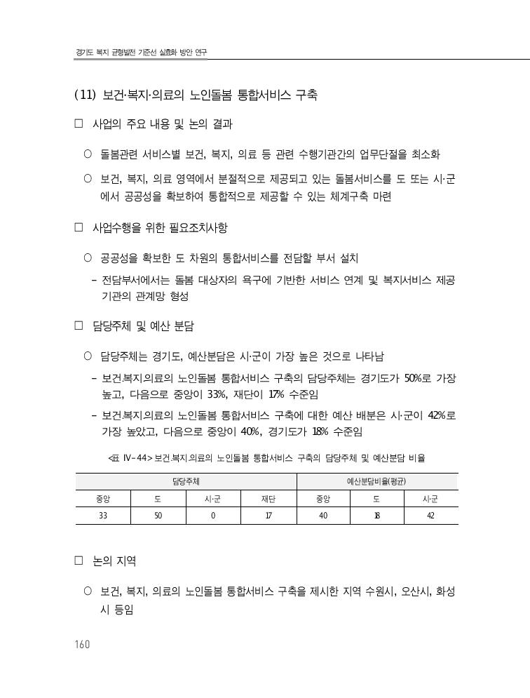 경기도 복지 균형발전 기준선 실효화 방안 연구 vi - 3개 영역별 공통과제 ・ (저소득/일자리 영역) 지방정부 부담의 기준 재설정, 지역사회보장계획 연계성 강화, 수급 자인식개선, 복지프로그램 통합적 관리, 복지민간가원 확대, 노인의 여가/일자리욕구 실태 조사, 장애유형, 등급별 일자리 욕구실태조사, 복지화폐도입, 공공기관 할당제 ・ (노인 돌봄 영역) 노인돌봄통합서비스 제공(보건, 복지, 의료), 노인돌봄네트워크 구성(보건, 복지, 의료), 장기요양탈락노인자원연계, 기관별 이용자정보공유, 인지기능저하노인 초기집 중지원, 치매에 대한 홍보와 인식개선, 독거노인신체활동 지원, 재가노인지원서비스 강화 ・ (장애인 돌봄 영역) 장애인돌봄서비스 홍보사업활성화, 돌봄대상 장애인발굴 및 적합서비스 지원을 위한 조사, 24시간활동지원서비스확대, 최중증 및 도전적행동 장애인에 대한 추가 지원, 장애유형별 주간보호센터설치, 생애주기별주간보호센터설치, 24시간 콜서비스 및 상 담전화운영, 서비스 신청 및 이용창구 일원화 □ 정책제언 ○ 법제도 정비 - 전략과제 추진을 위해 필요한 조례 및 법 제․개정 건의 및 절차 진행