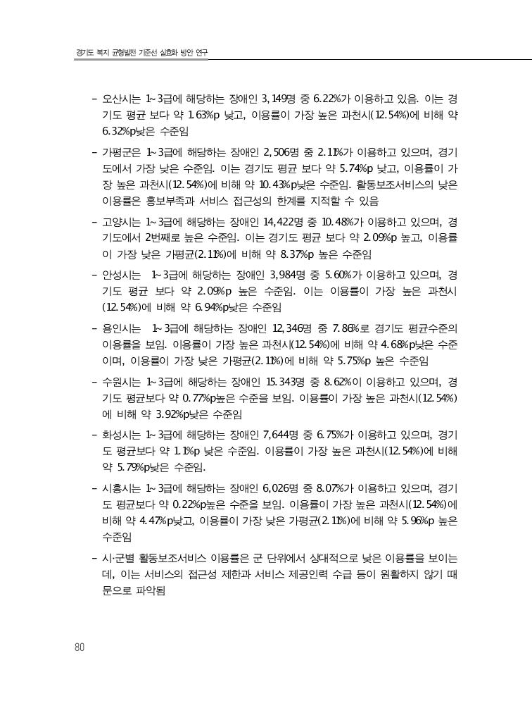 경기도 복지 균형발전 기준선 실효화 방안 연구 80 - 오산시는 1~3급에 해당하는 장애인 3,149명 중 6.22%가 이용하고 있음. 이는 경 기도 평균 보다 약 1.63%p 낮고, 이용률이 가장 높은 과천시(12.54%)에 비해 약 6.32%p낮은 수준임 - 가평군은 1~3급에 해당하는 장애인 2,506명 중 2.11%가 이용하고 있으며, 경기 도에서 가장 낮은 수준임. 이는 경기도 평균 보다 약 5.74%p 낮고, 이용률이 가 장 높은 과천시(12.54%)에 비해 약 10.43%p낮은 수준임. 활동보조서비스의 낮은 이용률은 홍보부족과 서비스 접근성의 한계를 지적할 수 있음 - 고양시는 1~3급에 해당하는 장애인 14,422명 중 10.48%가 이용하고 있으며, 경 기도에서 2번째로 높은 수준임. 이는 경기도 평균 보다 약 2.09%p 높고, 이용률 이 가장 낮은 가평균(2.11%)에 비해 약 8.37%p 높은 수준임 - 안성시는 1~3급에 해당하는 장애인 3,984명 중 5.60%가 이용하고 있으며, 경 기도 평균 보다 약 2.09%p 높은 수준임. 이는 이용률이 가장 높은 과천시 (12.54%)에 비해 약 6.94%p낮은 수준임 - 용인시는 1~3급에 해당하는 장애인 12,346명 중 7.86%로 경기도 평균수준의 이용률을 보임. 이용률이 가장 높은 과천시(12.54%)에 비해 약 4.68%p낮은 수준 이며, 이용률이 가장 낮은 가평균(2.11%)에 비해 약 5.75%p 높은 수준임 - 수원시는 1~3급에 해당하는 장애인 15.343명 중 8.62%이 이용하고 있으며, 경 기도 평균보다 약 0.77%p높은 수준을 보임. 이용률이 가장 높은 과천시(12.54%) 에 비해 약 3.92%p낮은 수준임 - 화성시는 1~3급에 해당하는 장애인 7,644명 중 6.75%가 이용하고 있으며, 경기 도 평균보다 약 1.1%p 낮은 수준임. 이용률이 가장 높은 과천시(12.54%)에 비해 약 5.79%p낮은 수준임. - 시흥시는 1~3급에 해당하는 장애인 6,026명 중 8.07%가 이용하고 있으며, 경기 도 평균보다 약 0.22%p높은 수준을 보임. 이용률이 가장 높은 과천시(12.54%)에 비해 약 4.47%p낮고, 이용률이 가장 낮은 가평균(2.11%)에 비해 약 5.96%p 높은 수준임 - 시·군별 활동보조서비스 이용률은 군 단위에서 상대적으로 낮은 이용률을 보이는 데, 이는 서비스의 접근성 제한과 서비스 제공인력 수급 등이 원활하지 않기 때 문으로 파악됨