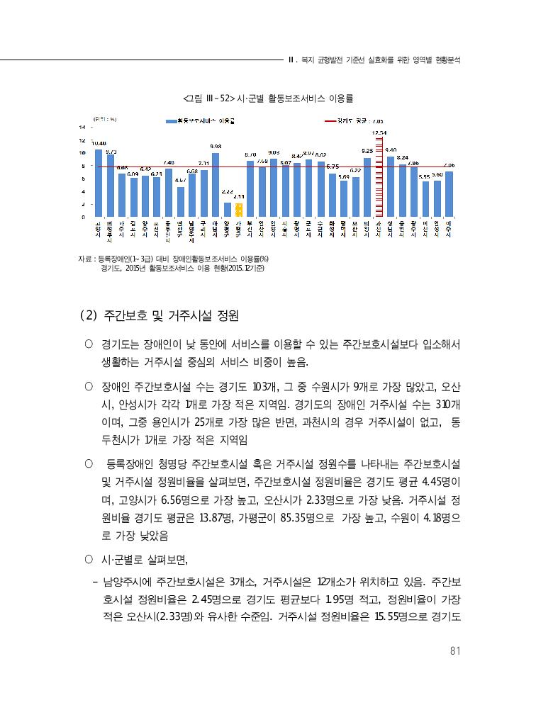Ⅲ. 복지 균형발전 기준선 실효화를 위한 영역별 현황분석 81 <그림 Ⅲ-52> 시·군별 활동보조서비스 이용률 자료:등록장애인(1~3급) 대비 장애인활동보조서비스 이용률(%) 경기도, 2015년 활동보조서비스 이용 현황(2015.12기준) (2) 주간보호 및 거주시설 정원 ○ 경기도는 장애인이 낮 동안에 서비스를 이용할 수 있는 주간보호시설보다 입소해서 생활하는 거주시설 중심의 서비스 비중이 높음. ○ 장애인 주간보호시설 수는 경기도 103개, 그 중 수원시가 9개로 가장 많았고, 오산 시, 안성시가 각각 1개로 가장 적은 지역임. 경기도의 장애인 거주시설 수는 310개 이며, 그중 용인시가 25개로 가장 많은 반면, 과천시의 경우 거주시설이 없고, 동 두천시가 1개로 가장 적은 지역임 ○ 등록장애인 청명당 주간보호시설 혹은 거주시설 정원수를 나타내는 주간보호시설 및 거주시설 정원비율을 살펴보면, 주간보호시설 정원비율은 경기도 평균 4.45명이 며, 고양시가 6.56명으로 가장 높고, 오산시가 2.33명으로 가장 낮음. 거주시설 정 원비율 경기도 평균은 13.87명, 가평군이 85.35명으로 가장 높고, 수원이 4.18명으 로 가장 낮았음 ○ 시·군별로 살펴보면, - 남양주시에 주간보호시설은 3개소, 거주시설은 12개소가 위치하고 있음. 주간보 호시설 정원비율은 2.45명으로 경기도 평균보다 1.95명 적고, 정원비율이 가장 적은 오산시(2.33명)와 유사한 수준임. 거주시설 정원비율은 15.55명으로 경기도