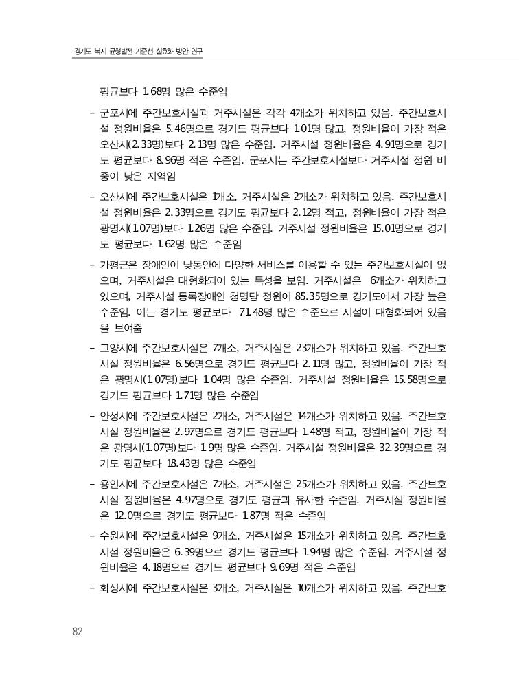 경기도 복지 균형발전 기준선 실효화 방안 연구 82 평균보다 1.68명 많은 수준임 - 군포시에 주간보호시설과 거주시설은 각각 4개소가 위치하고 있음. 주간보호시 설 정원비율은 5.46명으로 경기도 평균보다 1.01명 많고, 정원비율이 가장 적은 오산시(2.33명)보다 2.13명 많은 수준임. 거주시설 정원비율은 4.91명으로 경기 도 평균보다 8.96명 적은 수준임. 군포시는 주간보호시설보다 거주시설 정원 비 중이 낮은 지역임 - 오산시에 주간보호시설은 1개소, 거주시설은 2개소가 위치하고 있음. 주간보호시 설 정원비율은 2.33명으로 경기도 평균보다 2.12명 적고, 정원비율이 가장 적은 광명시(1.07명)보다 1.26명 많은 수준임. 거주시설 정원비율은 15.01명으로 경기 도 평균보다 1.62명 많은 수준임 - 가평군은 장애인이 낮동안에 다양한 서비스를 이용할 수 있는 주간보호시설이 없 으며, 거주시설은 대형화되어 있는 특성을 보임. 거주시설은 6개소가 위치하고 있으며, 거주시설 등록장애인 청명당 정원이 85.35명으로 경기도에서 가장 높은 수준임. 이는 경기도 평균보다 71.48명 많은 수준으로 시설이 대형화되어 있음 을 보여줌 - 고양시에 주간보호시설은 7개소, 거주시설은 23개소가 위치하고 있음. 주간보호 시설 정원비율은 6.56명으로 경기도 평균보다 2.11명 많고, 정원비율이 가장 적 은 광명시(1.07명)보다 1.04명 많은 수준임. 거주시설 정원비율은 15.58명으로 경기도 평균보다 1.71명 많은 수준임 - 안성시에 주간보호시설은 2개소, 거주시설은 14개소가 위치하고 있음. 주간보호 시설 정원비율은 2.97명으로 경기도 평균보다 1.48명 적고, 정원비율이 가장 적 은 광명시(1.07명)보다 1.9명 많은 수준임. 거주시설 정원비율은 32.39명으로 경 기도 평균보다 18.43명 많은 수준임 - 용인시에 주간보호시설은 7개소, 거주시설은 25개소가 위치하고 있음. 주간보호 시설 정원비율은 4.97명으로 경기도 평균과 유사한 수준임. 거주시설 정원비율 은 12.0명으로 경기도 평균보다 1.87명 적은 수준임 - 수원시에 주간보호시설은 9개소, 거주시설은 15개소가 위치하고 있음. 주간보호 시설 정원비율은 6.39명으로 경기도 평균보다 1.94명 많은 수준임. 거주시설 정 원비율은 4.18명으로 경기도 평균보다 9.69명 적은 수준임 - 화성시에 주간보호시설은 3개소, 거주시설은 10개소가 위치하고 있음. 주간보호