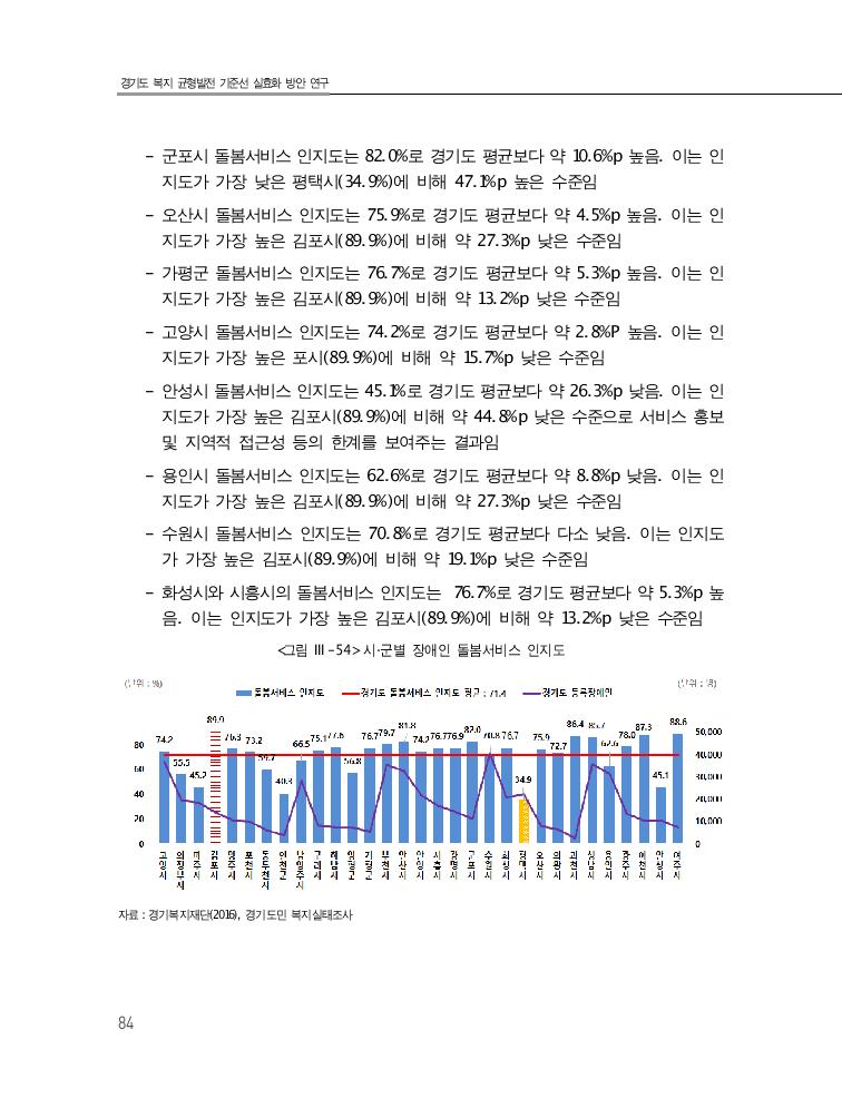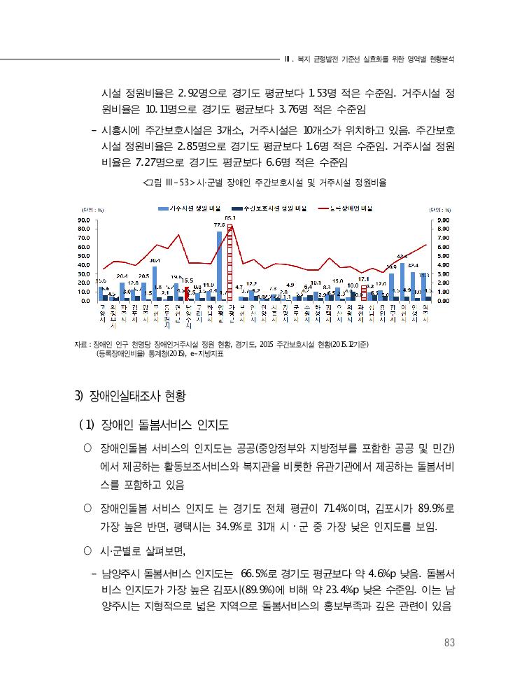 Ⅲ. 복지 균형발전 기준선 실효화를 위한 영역별 현황분석 83 시설 정원비율은 2.92명으로 경기도 평균보다 1.53명 적은 수준임. 거주시설 정 원비율은 10.11명으로 경기도 평균보다 3.76명 적은 수준임 - 시흥시에 주간보호시설은 3개소, 거주시설은 10개소가 위치하고 있음. 주간보호 시설 정원비율은 2.85명으로 경기도 평균보다 1.6명 적은 수준임. 거주시설 정원 비율은 7.27명으로 경기도 평균보다 6.6명 적은 수준임 <그림 Ⅲ-53> 시·군별 장애인 주간보호시설 및 거주시설 정원비율 자료:장애인 인구 천명당 장애인거주시설 정원 현황, 경기도, 2015 주간보호시설 현황(2015.12기준) (등록장애인비율) 통계청(2015), e-지방지표 3) 장애인실태조사 현황 (1) 장애인 돌봄서비스 인지도 ○ 장애인돌봄 서비스의 인지도는 공공(중앙정부와 지방정부를 포함한 공공 및 민간) 에서 제공하는 활동보조서비스와 복지관을 비롯한 유관기관에서 제공하는 돌봄서비 스를 포함하고 있음 ○ 장애인돌봄 서비스 인지도 는 경기도 전체 평균이 71.4%이며, 김포시가 89.9%로 가장 높은 반면, 평택시는 34.9%로 31개 시・군 중 가장 낮은 인지도를 보임. ○ 시·군별로 살펴보면, - 남양주시 돌봄서비스 인지도는 66.5%로 경기도 평균보다 약 4.6%p 낮음. 돌봄서 비스 인지도가 가장 높은 김포시(89.9%)에 비해 약 23.4%p 낮은 수준임. 이는 남 양주시는 지형적으로 넓은 지역으로 돌봄서비스의 홍보부족과 깊은 관련이 있음