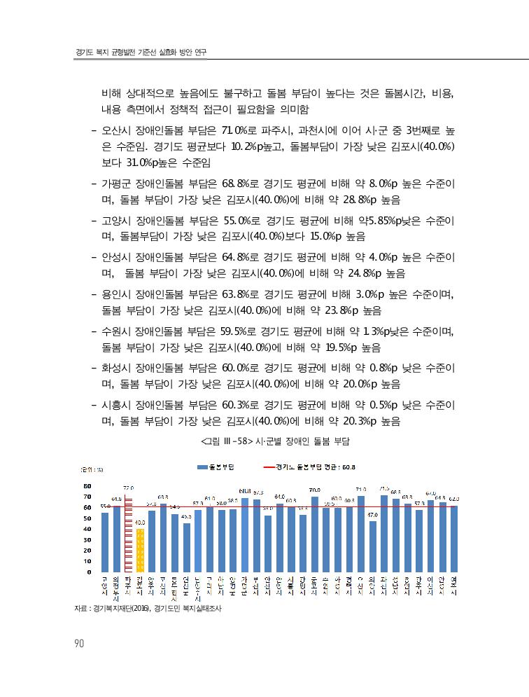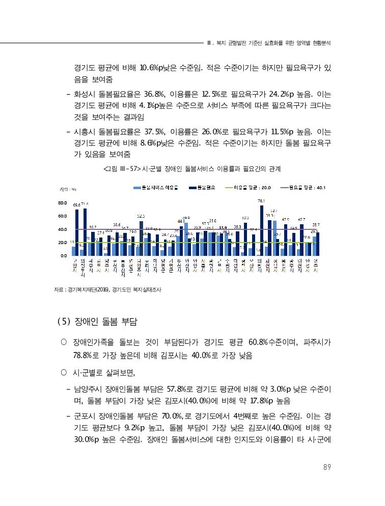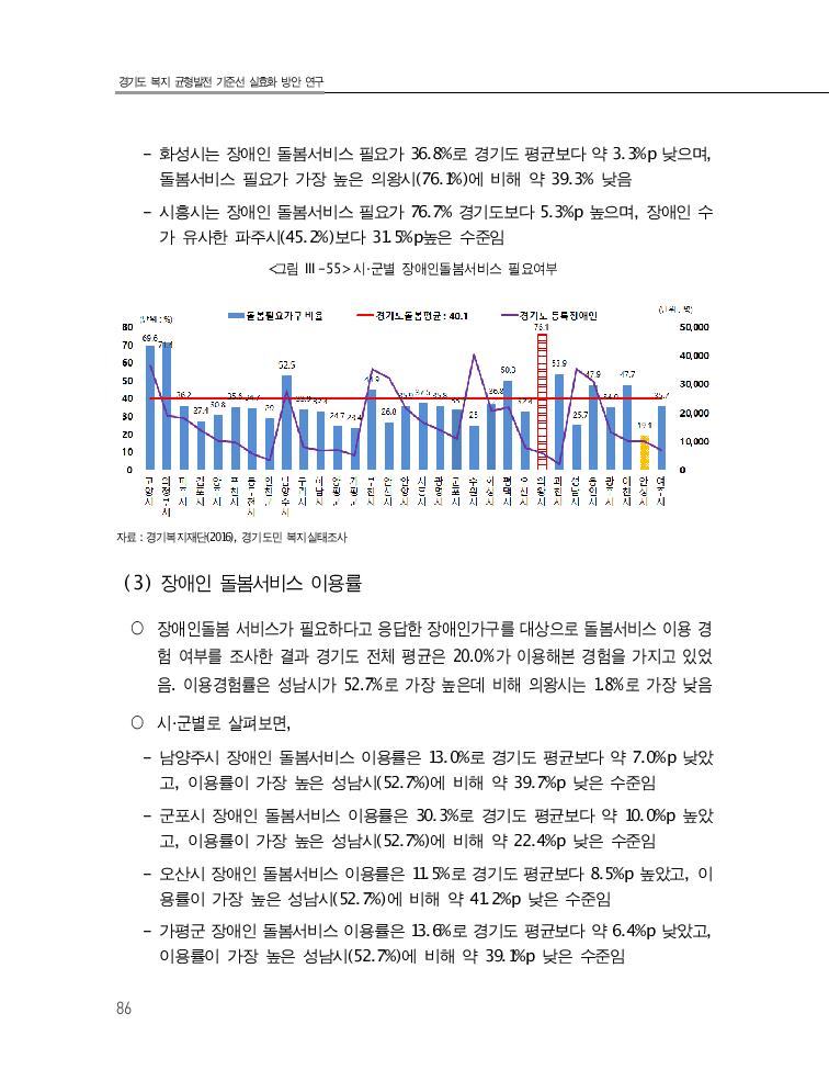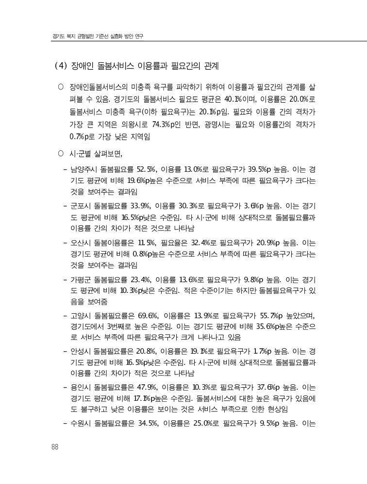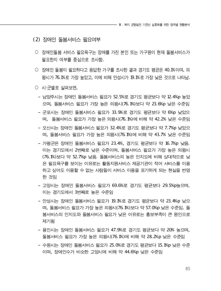 Ⅲ. 복지 균형발전 기준선 실효화를 위한 영역별 현황분석 85 (2) 장애인 돌봄서비스 필요여부 ○ 장애인돌봄 서비스 필요욕구는 장애를 가진 본인 또는 가구원이 현재 돌봄서비스가 필요한지 여부를 중심으로 조사함. ○ 장애인 돌봄이 필요하다고 응답한 가구를 조사한 결과 경기도 평균은 40.1%이며, 의 왕시가 76.1%로 가장 높았고, 이에 비해 안성시가 19.1%로 가장 낮은 것으로 나타남. ○ 시·군별로 살펴보면, - 남양주시는 장애인 돌봄서비스 필요가 52.5%로 경기도 평균보다 약 12.4%p 높았 으며, 돌봄서비스 필요가 가장 높은 의왕시(76.1%)보다 약 23.6%p 낮은 수준임 - 군포시는 장애인 돌봄서비스 필요가 33.9%로 경기도 평균보다 약 6%p 낮았으 며, 돌봄서비스 필요가 가장 높은 의왕시(76.1%)에 비해 약 42.2% 낮은 수준임 - 오산시는 장애인 돌봄서비스 필요가 32.4%로 경기도 평균보다 약 7.7%p 낮았으 며, 돌봄서비스 필요가 가장 높은 의왕시(76.1%)에 비해 약 43.7% 낮은 수준임 - 가평군은 장애인 돌봄서비스 필요가 23.4%, 경기도 평균보다 약 16.7%p 낮음. 이는 경기도에서 2번째로 낮은 수준이며, 돌봄서비스 필요가 가장 높은 의왕시 (76.1%)보다 약 52.7%p 낮음. 돌봄서비스의 높은 인지도에 비해 상대적으로 낮 은 필요욕구를 보이는 이유로는 활동지원서비스 제공기관이 적어 서비스를 이용 하고 싶어도 이용할 수 없는 사람들이 서비스 이용을 포기하게 되는 현실을 반영 한 것임 - 고양시는 장애인 돌봄서비스 필요가 69.6%로 경기도 평균보다 29.5%p높으며, 이는 경기도에서 3번째로 높은 수준임 - 안성시는 장애인 돌봄서비스 필요가 19.1%로 경기도 평균보다 약 23.4%p 낮으 며, 돌봄서비스 필요가 가장 높은 의왕시(76.1%)보다 약 57.0%p 낮은 수준임. 돌 봄서비스의 인지도와 돌봄서비스 필요가 낮은 이유로는 홍보부족이 큰 원인으로 제기됨 - 용인시는 장애인 돌봄서비스 필요가 47.9%로 경기도 평균보다 약 20% 높으며, 돌봄서비스 필요가 가장 높은 의왕시(76.1%)에 비해 약 28.2%p 낮은 수준임 - 수원시는 장애인 돌봄서비스 필요가 25.0%로 경기도 평균보다 15.1%p 낮은 수준 이며, 장애인수가 비슷한 고양시에 비해 약 44.6%p 낮은 수준임