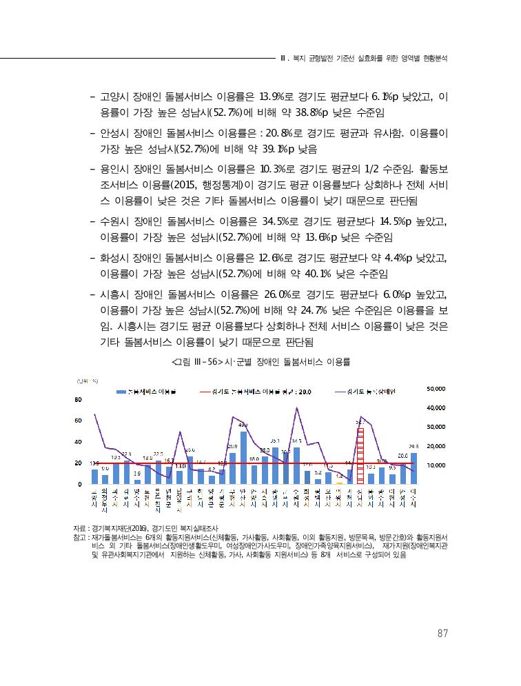 Ⅲ. 복지 균형발전 기준선 실효화를 위한 영역별 현황분석 87 - 고양시 장애인 돌봄서비스 이용률은 13.9%로 경기도 평균보다 6.1%p 낮았고, 이 용률이 가장 높은 성남시(52.7%)에 비해 약 38.8%p 낮은 수준임 - 안성시 장애인 돌봄서비스 이용률은:20.8%로 경기도 평균과 유사함. 이용률이 가장 높은 성남시(52.7%)에 비해 약 39.1%p 낮음 - 용인시 장애인 돌봄서비스 이용률은 10.3%로 경기도 평균의 1/2 수준임. 활동보 조서비스 이용률(2015, 행정통계)이 경기도 평균 이용률보다 상회하나 전체 서비 스 이용률이 낮은 것은 기타 돌봄서비스 이용률이 낮기 때문으로 판단됨 - 수원시 장애인 돌봄서비스 이용률은 34.5%로 경기도 평균보다 14.5%p 높았고, 이용률이 가장 높은 성남시(52.7%)에 비해 약 13.6%p 낮은 수준임 - 화성시 장애인 돌봄서비스 이용률은 12.6%로 경기도 평균보다 약 4.4%p 낮았고, 이용률이 가장 높은 성남시(52.7%)에 비해 약 40.1% 낮은 수준임 - 시흥시 장애인 돌봄서비스 이용률은 26.0%로 경기도 평균보다 6.0%p 높았고, 이용률이 가장 높은 성남시(52.7%)에 비해 약 24.7% 낮은 수준임은 이용률을 보 임. 시흥시는 경기도 평균 이용률보다 상회하나 전체 서비스 이용률이 낮은 것은 기타 돌봄서비스 이용률이 낮기 때문으로 판단됨 <그림 Ⅲ-56> 시・군별 장애인 돌봄서비스 이용률 자료:경기복지재단(2016), 경기도민 복지실태조사 참고:재가돌봄서비스는 6개의 활동지원서비스(신체활동, 가사활동, 사회활동, 이외 활동지원, 방문목욕, 방문간호)와 활동지원서 비스 외 기타 돌봄서비스(장애인생활도우미, 여성장애인가사도우미, 장애인가족양육지원서비스), 재가지원(장애인복지관 및 유관사회복지기관에서 지원하는 신체활동, 가사, 사회활동 지원서비스) 등 8개 서비스로 구성되어 있음