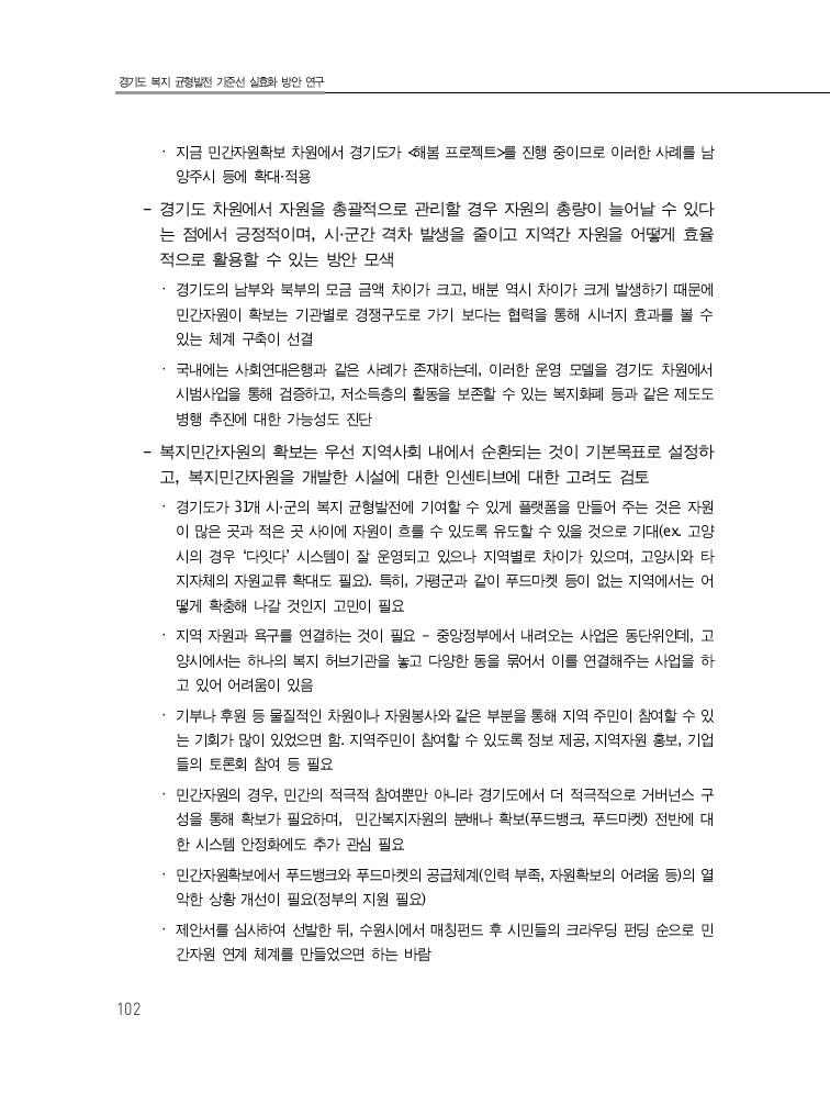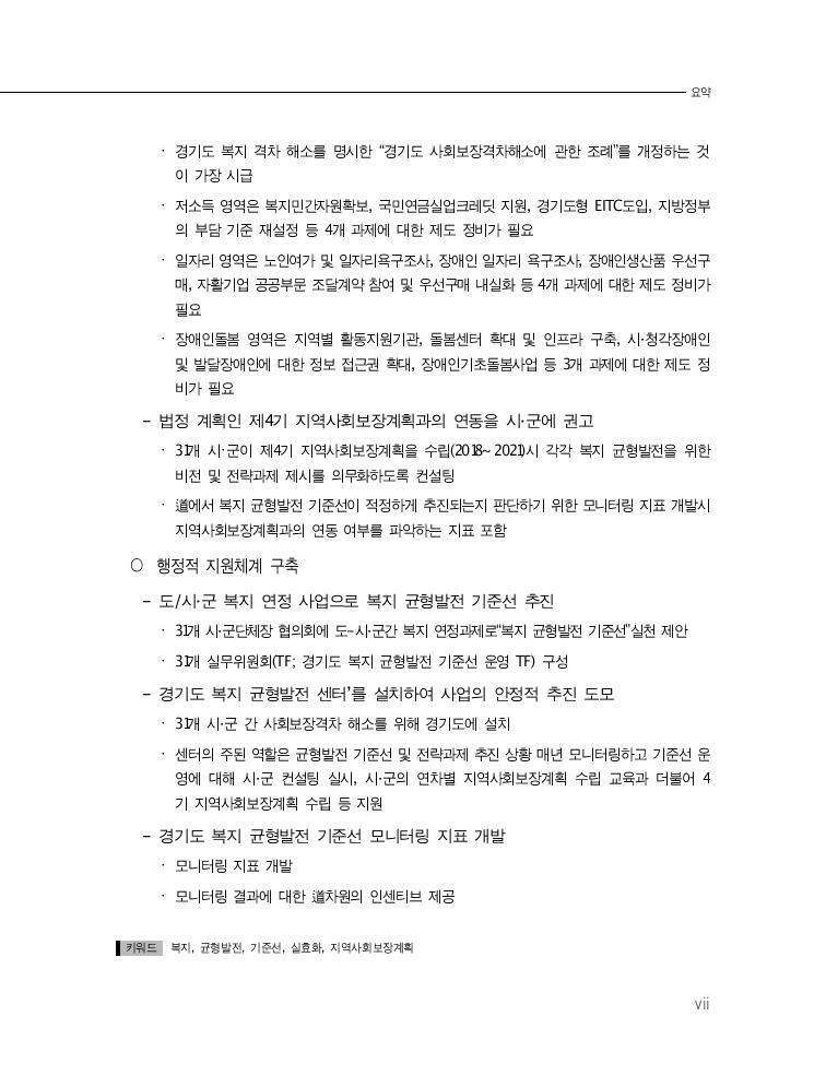 요약 vii ・ 경기도 복지 격차 해소를 명시한 “경기도 사회보장격차해소에 관한 조례”를 개정하는 것 이 가장 시급 ・ 저소득 영역은 복지민간자원확보, 국민연금실업크레딧 지원, 경기도형 EITC도입, 지방정부 의 부담 기준 재설정 등 4개 과제에 대한 제도 정비가 필요 ・ 일자리 영역은 노인여가 및 일자리욕구조사, 장애인 일자리 욕구조사, 장애인생산품 우선구 매, 자활기업 공공부문 조달계약 참여 및 우선구매 내실화 등 4개 과제에 대한 제도 정비가 필요 ・ 장애인돌봄 영역은 지역별 활동지원기관, 돌봄센터 확대 및 인프라 구축, 시·청각장애인 및 발달장애인에 대한 정보 접근권 확대, 장애인기초돌봄사업 등 3개 과제에 대한 제도 정 비가 필요 - 법정 계획인 제4기 지역사회보장계획과의 연동을 시·군에 권고 ・ 31개 시・군이 제4기 지역사회보장계획을 수립(2018~2021)시 각각 복지 균형발전을 위한 비전 및 전략과제 제시를 의무화하도록 컨설팅 ・ 道에서 복지 균형발전 기준선이 적정하게 추진되는지 판단하기 위한 모니터링 지표 개발시 지역사회보장계획과의 연동 여부를 파악하는 지표 포함 ○ 행정적 지원체계 구축 - 도/시·군 복지 연정 사업으로 복지 균형발전 기준선 추진 ・ 31개 시·군단체장 협의회에 도-시·군간 복지 연정과제로“복지 균형발전 기준선”실천 제안 ・ 31개 실무위원회(TF; 경기도 복지 균형발전 기준선 운영 TF) 구성 - 경기도 복지 균형발전 센터’를 설치하여 사업의 안정적 추진 도모 ・ 31개 시·군 간 사회보장격차 해소를 위해 경기도에 설치 ・ 센터의 주된 역할은 균형발전 기준선 및 전략과제 추진 상황 매년 모니터링하고 기준선 운 영에 대해 시·군 컨설팅 실시, 시·군의 연차별 지역사회보장계획 수립 교육과 더불어 4 기 지역사회보장계획 수립 등 지원 - 경기도 복지 균형발전 기준선 모니터링 지표 개발 ・ 모니터링 지표 개발 ・ 모니터링 결과에 대한 道차원의 인센티브 제공 키워드 복지, 균형발전, 기준선, 실효화, 지역사회보장계획