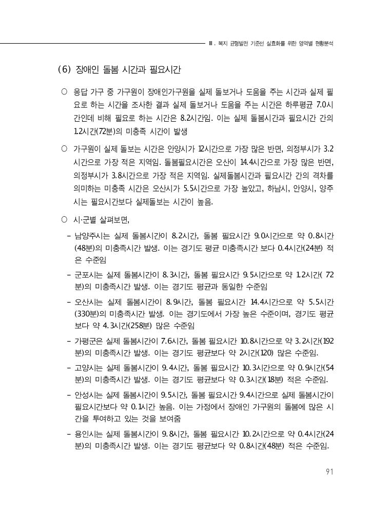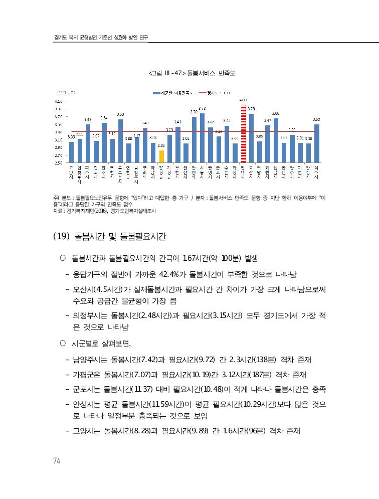 경기도 복지 균형발전 기준선 실효화 방안 연구 74 <그림 Ⅲ-47> 돌봄서비스 만족도 주) 분모:돌봄필요노인유무 문항에 “있다”라고 대답한 총 가구 / 분자:돌봄서비스 만족도 문항 중 지난 한해 이용여부에 “이 용”이라고 응답한 가구의 만족도 점수 자료:경기복지재단(2016), 경기도민복지실태조사 (19) 돌봄시간 및 돌봄필요시간 ○ 돌봄시간과 돌봄필요시간의 간극이 1.67시간(약 100분) 발생 - 응답가구의 절반에 가까운 42.4%가 돌봄시간이 부족한 것으로 나타남 - 오산시(4.5시간)가 실제돌봄시간과 필요시간 간 차이가 가장 크게 나타남으로써 수요와 공급간 불균형이 가장 큼 - 의정부시는 돌봄시간(2.48시간)과 필요시간(3.15시간) 모두 경기도에서 가장 적 은 것으로 나타남 ○ 시군별로 살펴보면, - 남양주시는 돌봄시간(7.42)과 필요시간(9.72) 간 2.3시간(138분) 격차 존재 - 가평군은 돌봄시간(7.07)과 필요시간(10.19)간 3.12시간(187분) 격차 존재 - 군포시는 돌봄시간(11.37) 대비 필요시간(10.48)이 적게 나타나 돌봄시간은 충족 - 안성시는 평균 돌봄시간(11.59시간)이 평균 필요시간(10.29시간)보다 많은 것으 로 나타나 일정부분 충족되는 것으로 보임 - 고양시는 돌봄시간(8.28)과 필요시간(9.89) 간 1.6시간(96분) 격차 존재