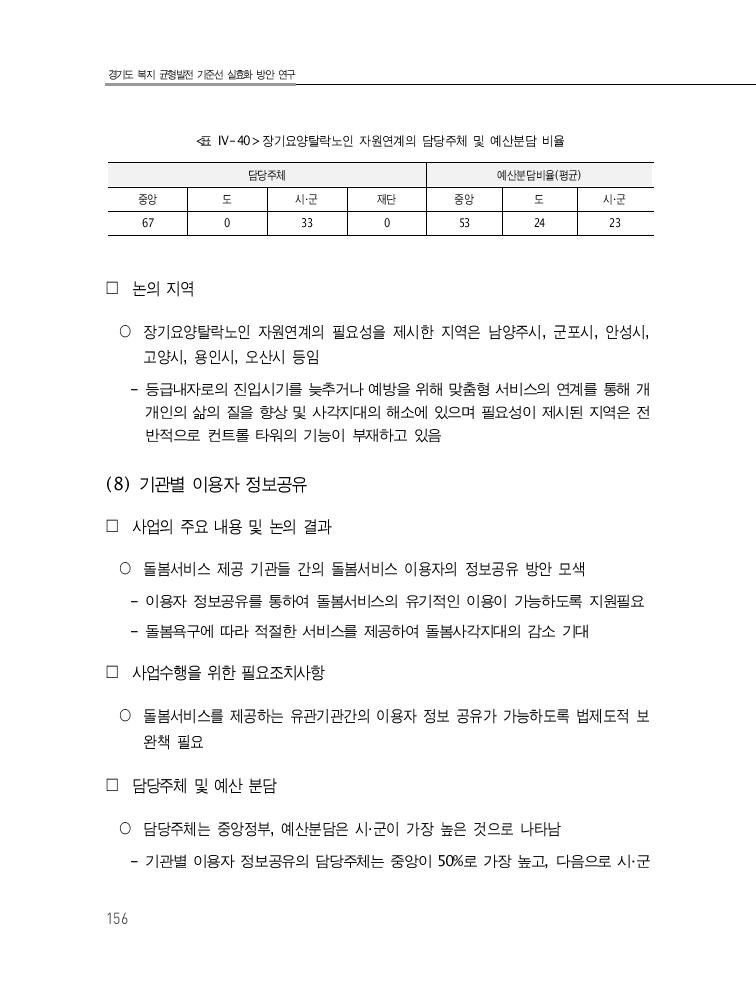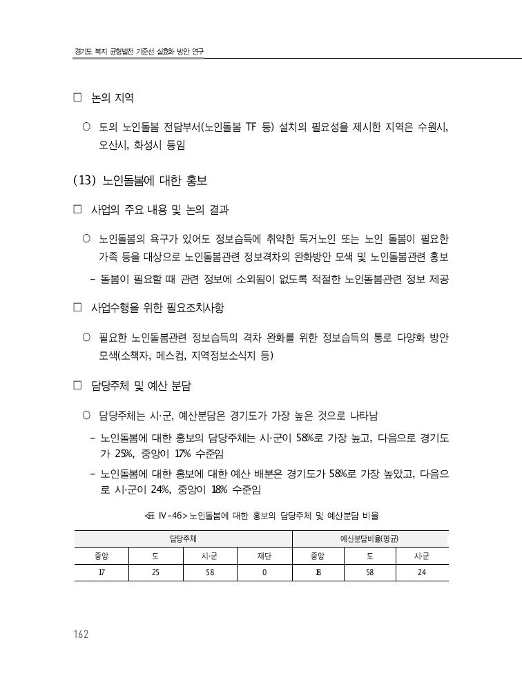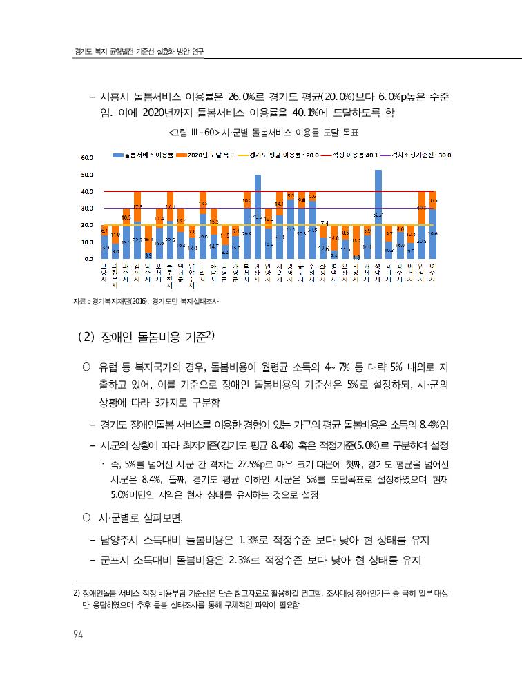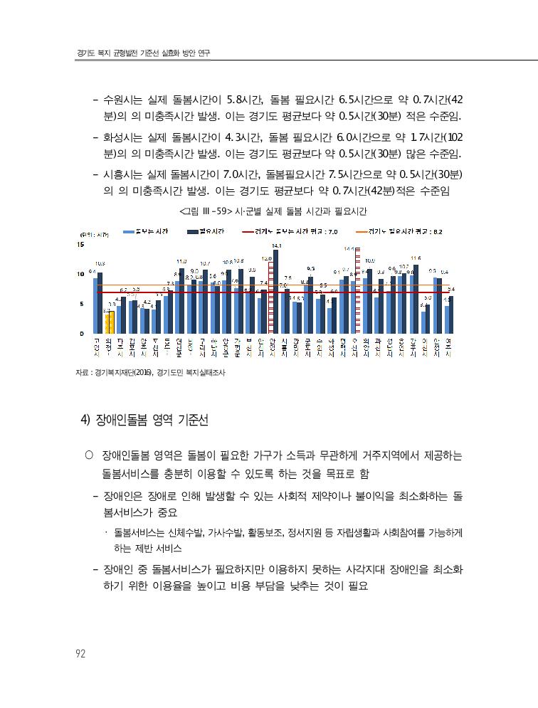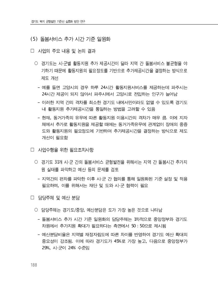 경기도 복지 균형발전 기준선 실효화 방안 연구 188 (5) 돌봄서비스 추가 시간 기준 일원화 □ 사업의 주요 내용 및 논의 결과 ○ 경기도는 시·군별 활동지원 추가 제공시간이 달라 지역 간 돌봄서비스 불균형을 야 기하기 때문에 활동지원의 필요정도를 기반으로 추가제공시간을 결정하는 방식으로 제도 개선 - 예를 들면 고양시의 경우 하루 24시간 활동지원서비스를 제공하는데 파주시는 24시간 제공이 되지 않아서 파주시에서 고양시로 전입하는 인구가 늘어남 - 이러한 지역 간의 격차를 최소한 경기도 내에서만이라도 없앨 수 있도록 경기도 내 활동지원 추가제공시간을 통일하는 방법을 고려할 수 있음 - 현재, 동거가족의 유무에 따른 활동지원 이용시간의 격차가 매우 큼. 이에 지자 체에서 추가로 활동지원을 제공할 때에는 동거가족유무에 관계없이 장애의 중증 도와 활동지원의 필요정도에 기반하여 추가제공시간을 결정하는 방식으로 제도 개선이 필요함 □ 사업수행을 위한 필요조치사항 ○ 경기도 31개 시·군 간의 돌봄서비스 균형발전을 위해서는 지역 간 돌봄시간 추가지 원 실태를 파악하고 예산 등의 문제를 검토 - 지역간의 편차를 파악한 이후 시·군 간 협의를 통해 일원화된 기준 설정 및 적용 필요하며, 이를 위해서는 재단 및 도와 시·군 협력이 필요 □ 담당주체 및 예산 분담 ○ 담당주체는 경기도/중앙, 예산분담은 도가 가장 높은 것으로 나타남 - 돌봄서비스 추가 시간 기준 일원화의 담당주체는 1차적으로 중앙정부와 경기도 차원에서 추가지원 확대가 필요하다는 측면에서 50:50으로 제시됨 - 예산분담비율은 지역별 재정자립도에 따른 차이를 반영하여 경기도 예산 확대의 중요성이 강조됨. 이에 따라 경기도가 45%로 가장 높고, 다음으로 중앙정부가 29%, 시·군이 24% 수준임