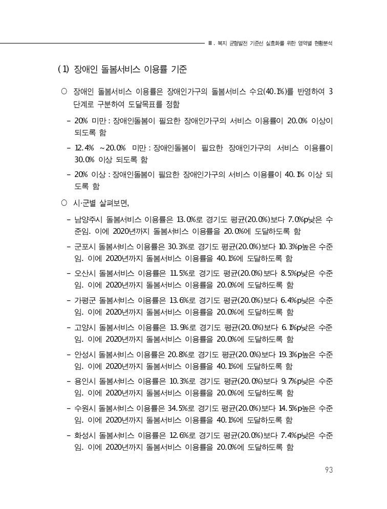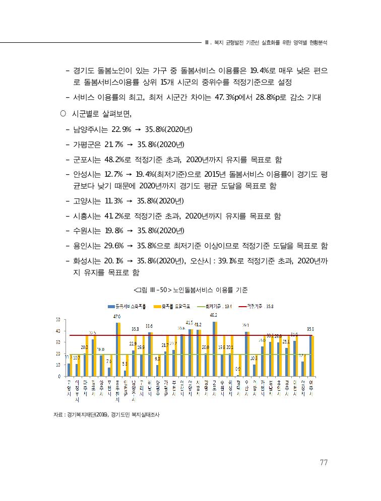 Ⅲ. 복지 균형발전 기준선 실효화를 위한 영역별 현황분석 77 - 경기도 돌봄노인이 있는 가구 중 돌봄서비스 이용률은 19.4%로 매우 낮은 편으 로 돌봄서비스이용률 상위 15개 시군의 중위수를 적정기준으로 설정 - 서비스 이용률의 최고, 최저 시군간 차이는 47.3%p에서 28.8%p로 감소 기대 ○ 시군별로 살펴보면, - 남양주시는 22.9% → 35.8%(2020년) - 가평군은 21.7% → 35.8%(2020년) - 군포시는 48.2%로 적정기준 초과, 2020년까지 유지를 목표로 함 - 안성시는 12.7% → 19.4%(최저기준)으로 2015년 돌봄서비스 이용률이 경기도 평 균보다 낮기 때문에 2020년까지 경기도 평균 도달을 목표로 함 - 고양시는 11.3% → 35.8%(2020년) - 시흥시는 41.2%로 적정기준 초과, 2020년까지 유지를 목표로 함 - 수원시는 19.8% → 35.8%(2020년) - 용인시는 29.6% → 35.8%으로 최저기준 이상이므로 적정기준 도달을 목표로 함 - 화성시는 20.1% → 35.8%(2020년), 오산시:39.1%로 적정기준 초과, 2020년까 지 유지를 목표로 함 <그림 Ⅲ-50> 노인돌봄서비스 이용률 기준 자료:경기복지재단(2016), 경기도민 복지실태조사