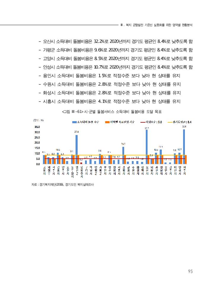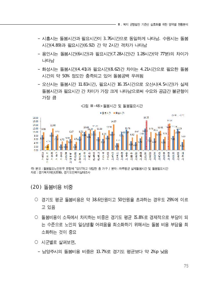 Ⅲ. 복지 균형발전 기준선 실효화를 위한 영역별 현황분석 75 - 시흥시는 돌봄시간과 필요시간이 3.76시간으로 동일하게 나타남. 수원시는 돌봄 시간(4.89)과 필요시간(6.92) 간 약 2시간 격차가 나타남 - 용인시는 돌봄시간(6시간)과 필요시간(7.28시간)간 1.28시간(약 77분)의 차이가 나타남 - 화성시는 돌봄시간(4.41)과 필요시간(8.62)간 차이는 4.21시간으로 필요한 돌봄 시간의 약 50% 정도만 충족되고 있어 돌봄공백 우려됨 - 오산시는 돌봄시간 11.83시간, 필요시간 16.35시간으로 오산시(4.5시간)가 실제 돌봄시간과 필요시간 간 차이가 가장 크게 나타남으로써 수요와 공급간 불균형이 가장 큼 <그림 Ⅲ-48> 돌봄시간 및 돌봄필요시간 주) 분모:돌봄필요노인유무 문항에 “있다”라고 대답한 총 가구 / 분자:하루평균 실제돌봄시간 및 돌봄필요시간 자료:경기복지재단(2016), 경기도민복지실태조사 (20) 돌봄비용 비중 ○ 경기도 평균 돌봄비용은 약 38.6만원이고 50만원을 초과하는 경우도 29%에 이르 고 있음 ○ 돌봄비용이 소득에서 차지하는 비중은 경기도 평균 15.8%로 경제적으로 부담이 되 는 수준으로 노인의 일상생활 어려움을 최소화하기 위해서는 돌봄 비용 부담을 최 소화하는 것이 중요 ○ 시군별로 살펴보면, - 남양주시의 돌봄비용 비중은 13.7%로 경기도 평균보다 약 2%p 낮음