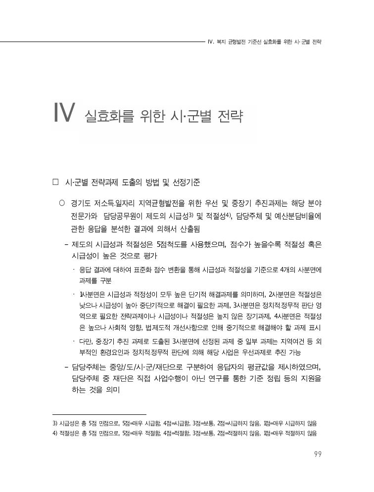 Ⅰ. 연구개요 7 - 기존 전략과제 및 현장에서 수렴된 추가과제를 정리한 후, 10개 시·군별로 우선 추진과제와 중장기과제, 공통과제를 제시하여 기준선의 실효성 제고 ・ 시·군별 우선 및 중장기 추진과제, 공통과제는 각 영역의 전문가와 담당공무원이 제도의 시급성과 적절성에 관한 응답을 분석한 결과에 의해서 산출 ・ 제도의 시급성과 적절성은 5점 척도를 사용했으며, 점수가 높을수록 적절성 혹은 시급성이 높은 것으로 평가 ○ (5장) 상기 내용이 법적 행정적으로 추진되기 위한 방안을 제언
