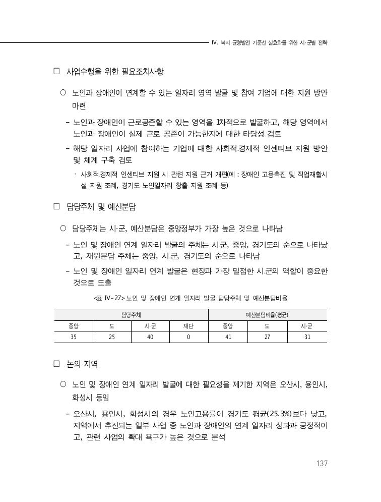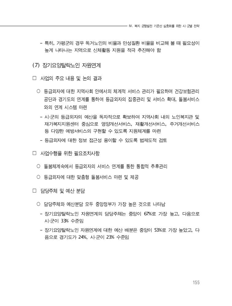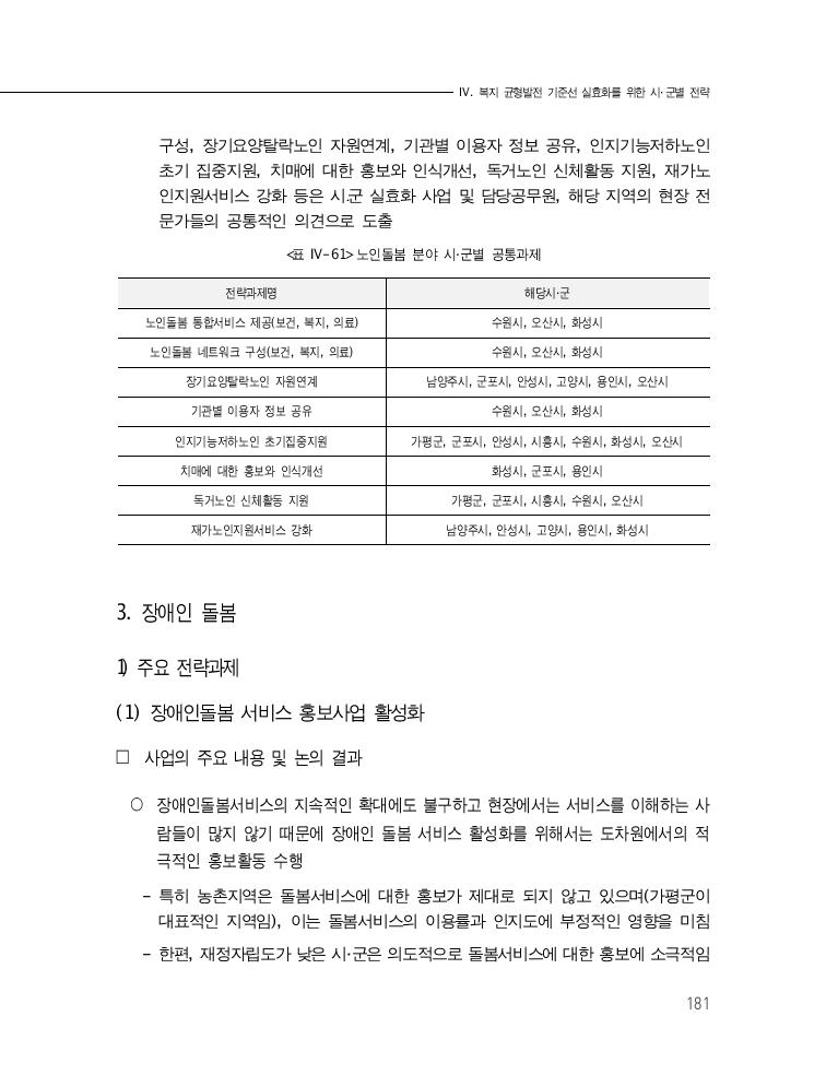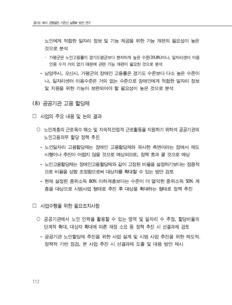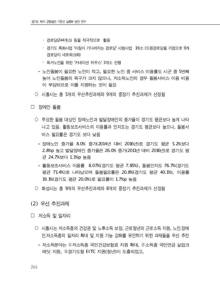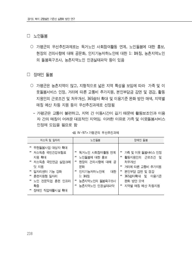 경기도 복지 균형발전 기준선 실효화 방안 연구 240 저소득 및 일자리 노인돌봄 장애인 돌봄  경기도형 EITC 지원 (청년/장애인)  중간실무협의체 활성화  전달체계 효율화  지역특화형 자활사업 확대  생활임금제 확대  저소득층 민간 일자리 확대  자활기업 공공부문 조달계약 참여 및 우선구매 내실화  노인일자리 전달체계 일원화  민간영역 노인일자리 확대  노인과 타연령 연계 혼합연 령 일자리 창출  노인 및 장애인 연계 일자리 창출  직업재활시설 근로장애인 임 금보조 및 지원  장애인생산품 우선구매 내실화  노인돌봄사례관리기능강화  노인돌봄예방정보제공  도의 노인돌봄전담부서 (노인돌봄TF 등) 설치  경기도 노인종합상담센터 활 성화 및 적극적 연계  노인돌봄서비스 이용 및 제 공에 따른 이해와 교육  공중목욕탕서비스 제공 (저소득, 독거노인 등)  건강한 어르신에 대한 건강 예방관리  경로당의 기능 활성화 (치매안심존)  지역별 활동지원기관, 돌봄 센터 확대 및 인프라 구축  시․청각장애인과 발달장애인 에 대한 정보접근권 확대  장애유형에 따른 활동지원 서비스 제공  장애유형별 활동지원 확대  청년 및 성인발달장애인 추 가시간 확대  직업 및 근로활동 장애인 추 가시간 확대  성인장애인을 위한 소규모 거주시설 및 공동생활 가정 확대  주간보호시설의 종일반 운영 지원  대형아파트 단지에 주간보호 센터 설치의무화  돌봄서비스 추가 시간 기준 일원화  장애인 기초돌봄사업 운영 <표 Ⅳ-98> 가평군의 중장기 추진과제 근권 확대, 장애유형에 따른 활동지원 서비스 제공, 장애유형별 활동지원 확대, 청년 및 성인발달장애인 추가시간 확대, 직업 및 근로활동 장애인 추가시간 확 대, 성인장애인을 위한 소규모 거주시설 및 공동생활 가정 확대, 주간보호시설의 종일반 운영지원, 대형아파트 단지에 주간보호센터 설치의무화, 돌봄서비스 추가 시간 기준 일원화, 장애인 기초돌봄사업 운영 등이 도출