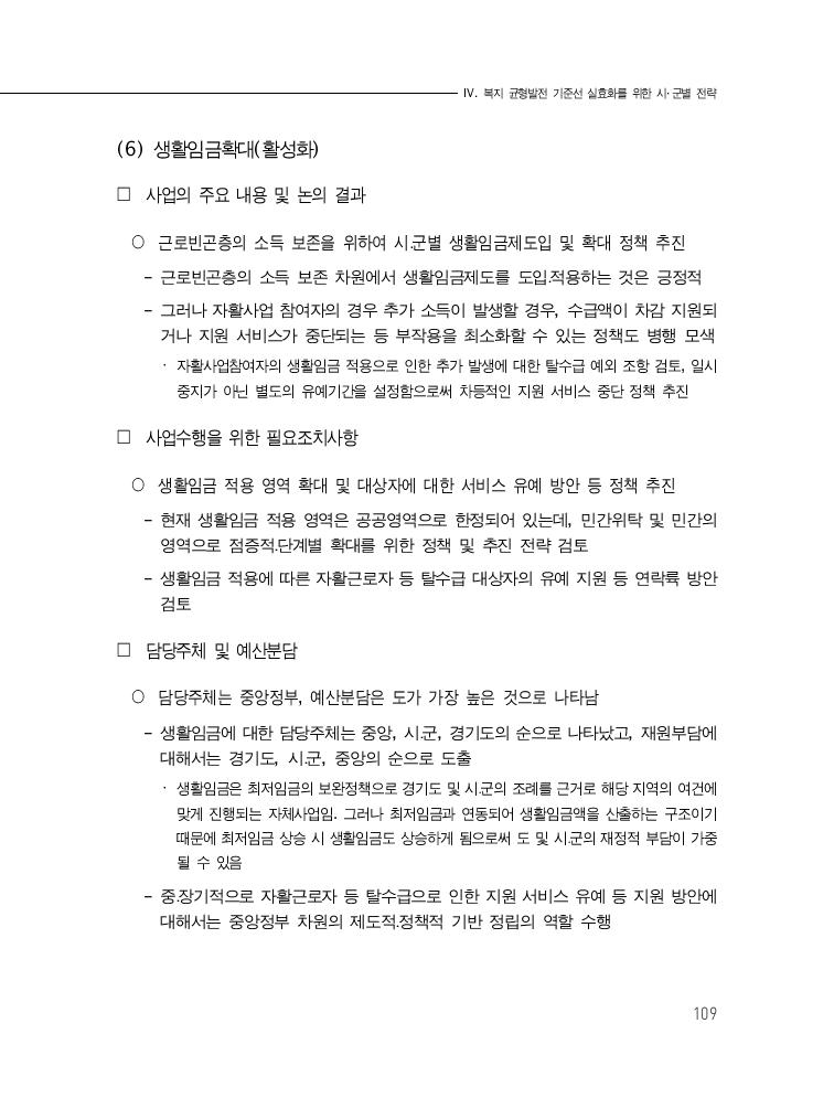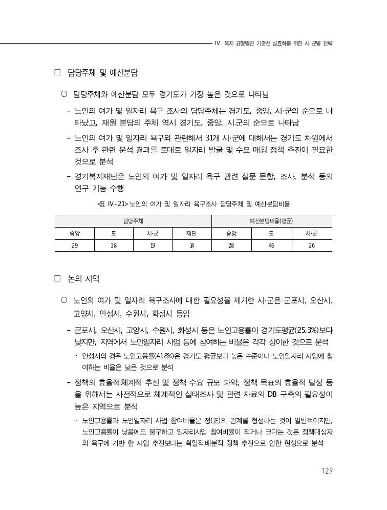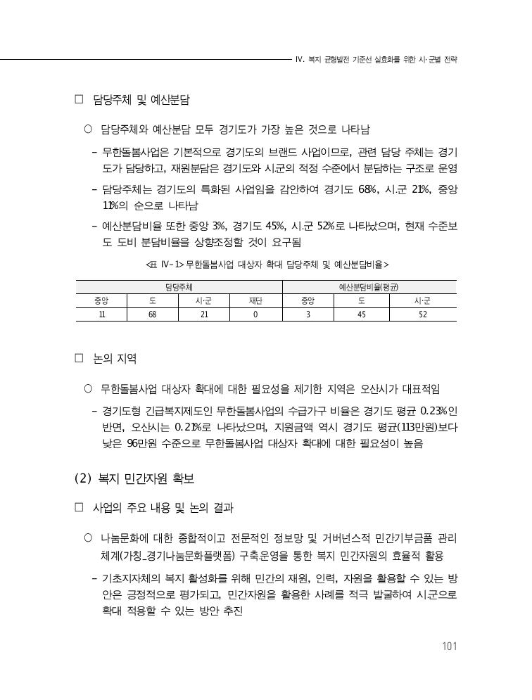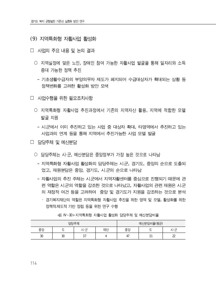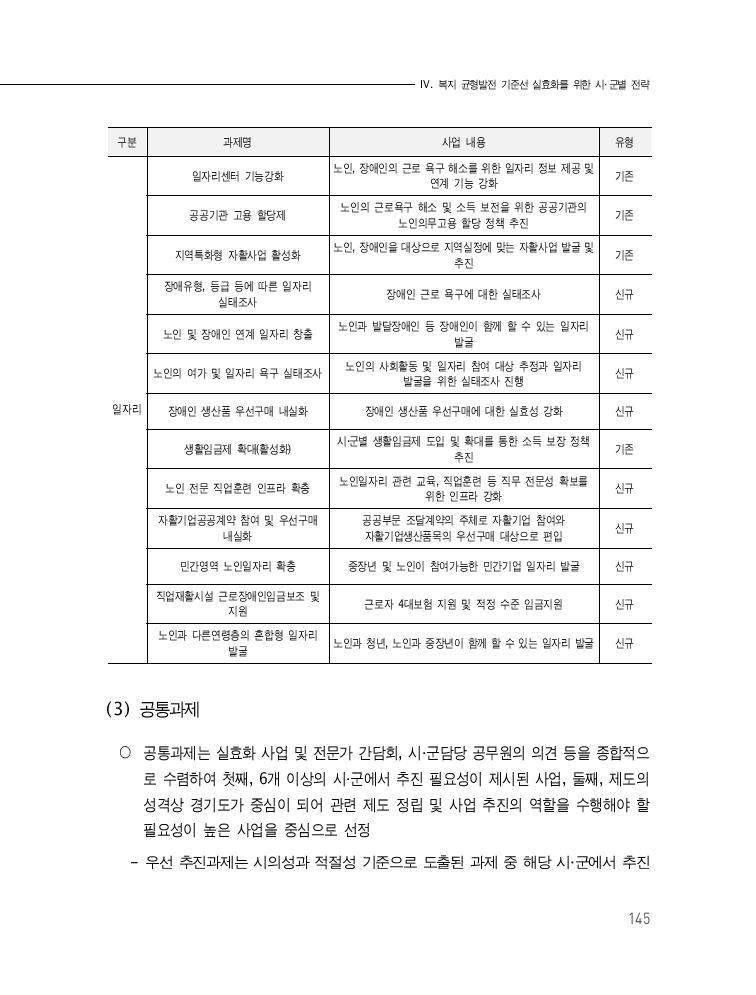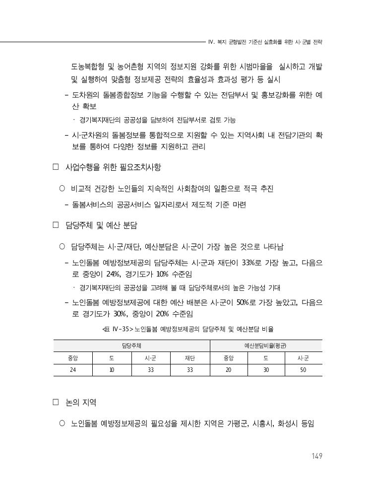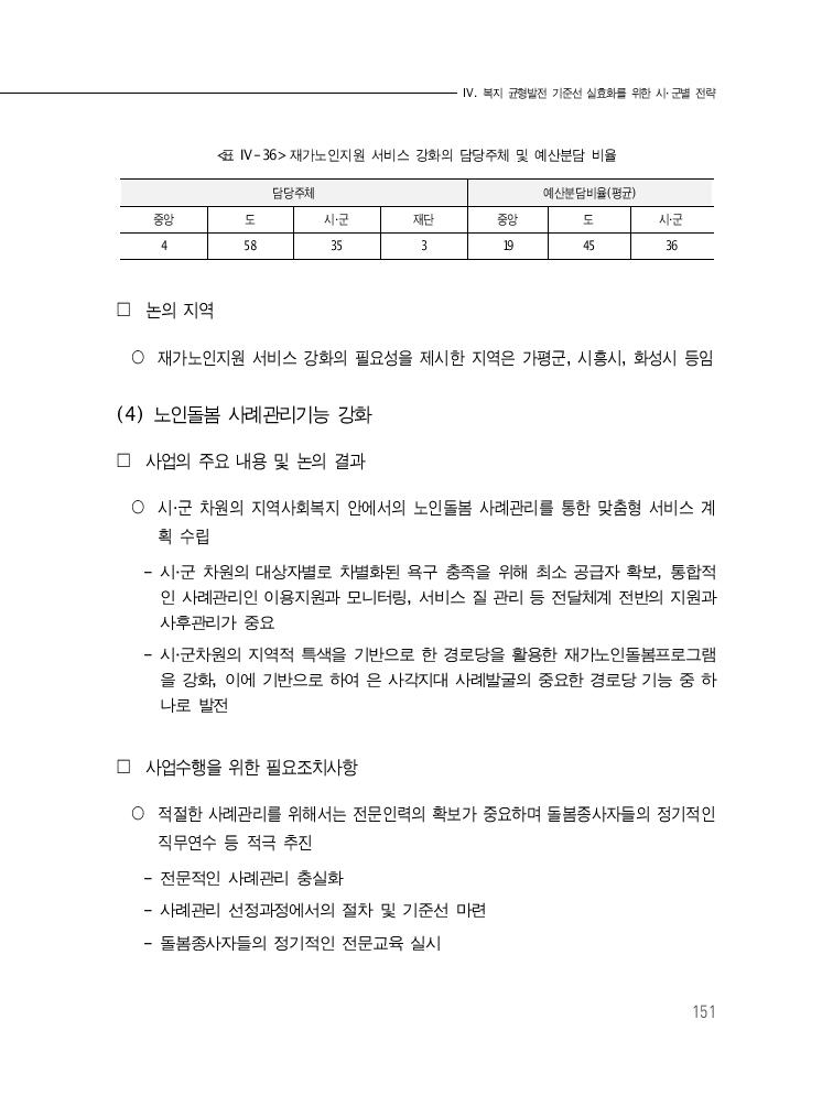 경기도 복지 균형발전 기준선 실효화 방안 연구 240 저소득 및 일자리 노인돌봄 장애인 돌봄  경기도형 EITC 지원 (청년/장애인)  중간실무협의체 활성화  전달체계 효율화  지역특화형 자활사업 확대  생활임금제 확대  저소득층 민간 일자리 확대  자활기업 공공부문 조달계약 참여 및 우선구매 내실화  노인일자리 전달체계 일원화  민간영역 노인일자리 확대  노인과 타연령 연계 혼합연 령 일자리 창출  노인 및 장애인 연계 일자리 창출  직업재활시설 근로장애인 임 금보조 및 지원  장애인생산품 우선구매 내실화  노인돌봄사례관리기능강화  노인돌봄예방정보제공  도의 노인돌봄전담부서 (노인돌봄TF 등) 설치  경기도 노인종합상담센터 활 성화 및 적극적 연계  노인돌봄서비스 이용 및 제 공에 따른 이해와 교육  공중목욕탕서비스 제공 (저소득, 독거노인 등)  건강한 어르신에 대한 건강 예방관리  경로당의 기능 활성화 (치매안심존)  지역별 활동지원기관, 돌봄 센터 확대 및 인프라 구축  시․청각장애인과 발달장애인 에 대한 정보접근권 확대  장애유형에 따른 활동지원 서비스 제공  장애유형별 활동지원 확대  청년 및 성인발달장애인 추 가시간 확대  직업 및 근로활동 장애인 추 가시간 확대  성인장애인을 위한 소규모 거주시설 및 공동생활 가정 확대  주간보호시설의 종일반 운영 지원  대형아파트 단지에 주간보호 센터 설치의무화  돌봄서비스 추가 시간 기준 일원화  장애인 기초돌봄사업 운영 <표 Ⅳ-98> 가평군의 중장기 추진과제 근권 확대, 장애유형에 따른 활동지원 서비스 제공, 장애유형별 활동지원 확대, 청년 및 성인발달장애인 추가시간 확대, 직업 및 근로활동 장애인 추가시간 확 대, 성인장애인을 위한 소규모 거주시설 및 공동생활 가정 확대, 주간보호시설의 종일반 운영지원, 대형아파트 단지에 주간보호센터 설치의무화, 돌봄서비스 추가 시간 기준 일원화, 장애인 기초돌봄사업 운영 등이 도출