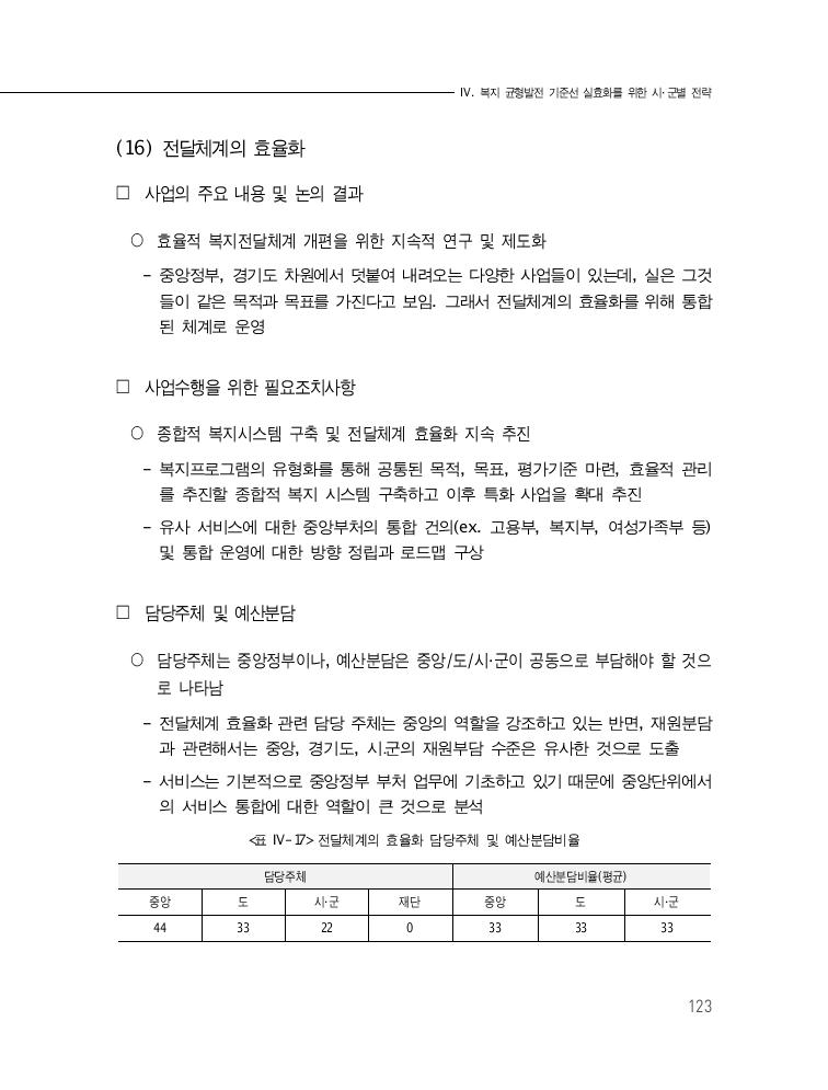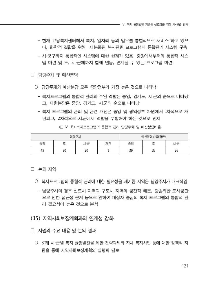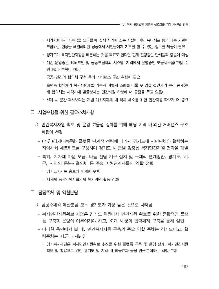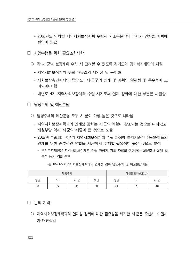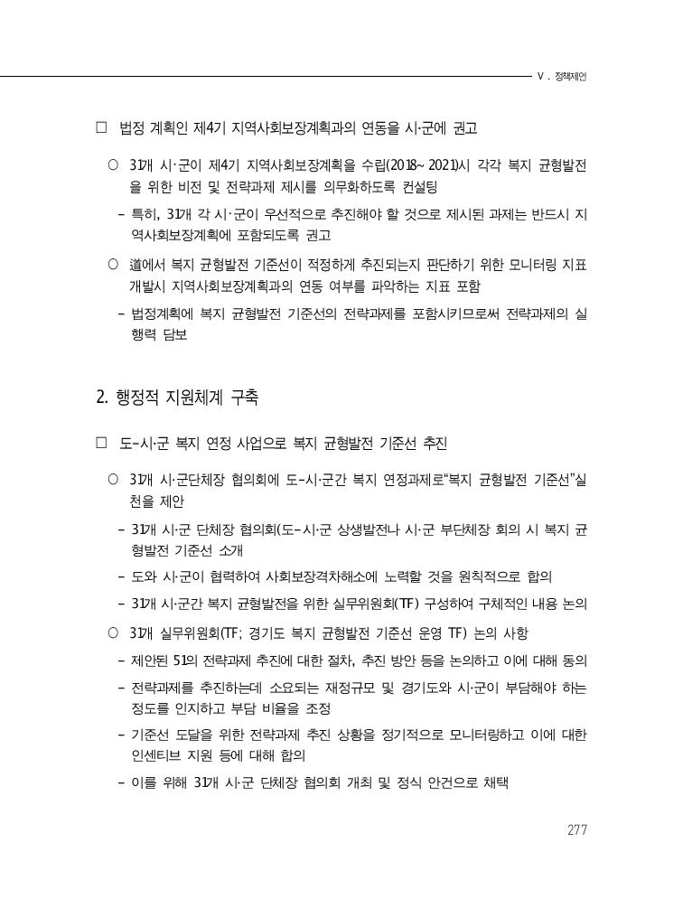 Ⅴ. 정책제언 277 □ 법정 계획인 제4기 지역사회보장계획과의 연동을 시·군에 권고 ○ 31개 시・군이 제4기 지역사회보장계획을 수립(2018~2021)시 각각 복지 균형발전 을 위한 비전 및 전략과제 제시를 의무화하도록 컨설팅 - 특히, 31개 각 시・군이 우선적으로 추진해야 할 것으로 제시된 과제는 반드시 지 역사회보장계획에 포함되도록 권고 ○ 道에서 복지 균형발전 기준선이 적정하게 추진되는지 판단하기 위한 모니터링 지표 개발시 지역사회보장계획과의 연동 여부를 파악하는 지표 포함 - 법정계획에 복지 균형발전 기준선의 전략과제를 포함시키므로써 전략과제의 실 행력 담보 2. 행정적 지원체계 구축 □ 도-시·군 복지 연정 사업으로 복지 균형발전 기준선 추진 ○ 31개 시·군단체장 협의회에 도-시·군간 복지 연정과제로“복지 균형발전 기준선”실 천을 제안 - 31개 시·군 단체장 협의회(도-시·군 상생발전나 시·군 부단체장 회의 시 복지 균 형발전 기준선 소개 - 도와 시·군이 협력하여 사회보장격차해소에 노력할 것을 원칙적으로 합의 - 31개 시·군간 복지 균형발전을 위한 실무위원회(TF) 구성하여 구체적인 내용 논의 ○ 31개 실무위원회(TF; 경기도 복지 균형발전 기준선 운영 TF) 논의 사항 - 제안된 51의 전략과제 추진에 대한 절차, 추진 방안 등을 논의하고 이에 대해 동의 - 전략과제를 추진하는데 소요되는 재정규모 및 경기도와 시·군이 부담해야 하는 정도를 인지하고 부담 비율을 조정 - 기준선 도달을 위한 전략과제 추진 상황을 정기적으로 모니터링하고 이에 대한 인센티브 지원 등에 대해 합의 - 이를 위해 31개 시·군 단체장 협의회 개최 및 정식 안건으로 채택