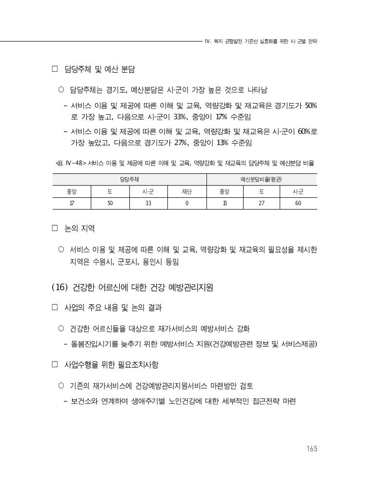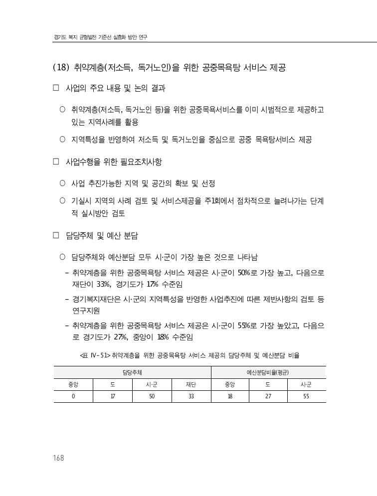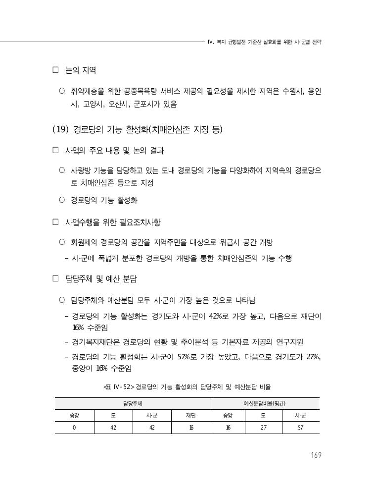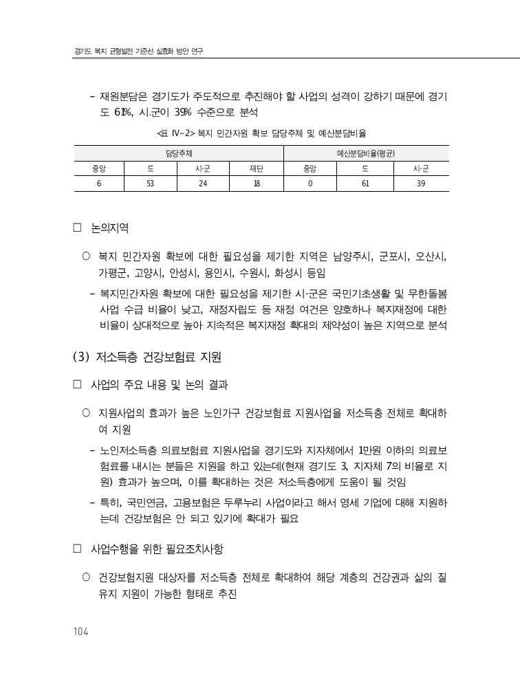 경기도 복지 균형발전 기준선 실효화 방안 연구 230 저소득 및 일자리 노인돌봄 장애인 돌봄  저소득층 국민건강보험료 지원 확대  무한돌봄사업 대상자 확대  중간실무협의체 활성화  전달체계 효율화  일자리센터 기능 강화  지역특화형 자활사업 활성화  훈련지원형 일자리  저소득층 민간 일자리 확대  노인과 타연령 연계 혼합연 령 일자리 창출  노인 및 장애인 연계 일자리 창출  공중목욕탕 서비스 제공 (저소득, 독거노인 등)  도의 노인돌봄전담부서 (노인돌봄TF등) 설치  경기도 노인종합상담센터 활 성화 및 적극적 연계  인지기능저하노인에 대한 1:1매칭 지원  건강한 어르신에 대한 건강 예방관리  경로당의 기능 활성화 (치매안심존)  지역별 활동지원기관, 돌봄 센터 확대 및 인프라 구축  시․청각, 장애인 및 발달장애 인에 대한 정보접근권 확대  활동지원인의 근로조건 및 처우개선  청년 및 성인발달장애인 추 가시간 확대  직업 및 근로활동 장애인 추 가시간 확대  거리에 따른 교통비 추가지원  성인장애인을 위한 소규모 <표 Ⅳ-94> 군포시의 중장기 추진과제 대, ⑤노인과 타연령 연계 혼합연령 일자리 창출, ⑥노인 및 장애인 연계 일자리 창출, ⑦직업재활시설 근로 장애인 임금보조 및 지원, ⑧장애인생산품 우선구매 내실화 등의 사업들이 도출 □ 노인돌봄 ○ 중장기 추진과제로 공중목욕탕 서비스 제공(저소득, 독거노인 등), 도의 노인돌봄 전담부서(노인돌봄TF등) 설치를 포함한 8개 과제가 선정됨 □ 장애인 돌봄 ○ 중․장기 추진과제는 군포시에서 필요하다고 제시하지는 않았지만 지역별 장애인돌 봄 서비스 불균형을 완화하기 위해 추진되어야 하는 과제를 제안 - 군포시가 중장기적으로 추진해야 할 과제 중 장애인돌봄분야는 지역별 활동지원 기관, 돌봄센터 확대 및 인프라 구축, 시․청각, 장애인 및 발달장애인에 대한 정 보접근권 확대, 활동지원인의 근로조건 및 처우개선, 청년 및 성인발달장애인 추 가시간 확대, 직업 및 근로활동 장애인 추가시간 확대, 거리에 따른 교통비 추가 지원, 성인장애인을 위한 소규모 거주시설 및 공동생활 가정 확대, 365쉼터확대 및 이용기준 완화 방안 모색, 주간보호시설의 종일반 운영지원, 대형아파트 단지 에 주간보호센터 설치의무화, 돌봄서비스 추가 시간 기준 일원화 등이 도출