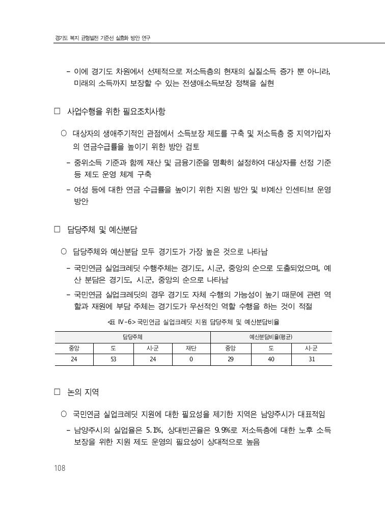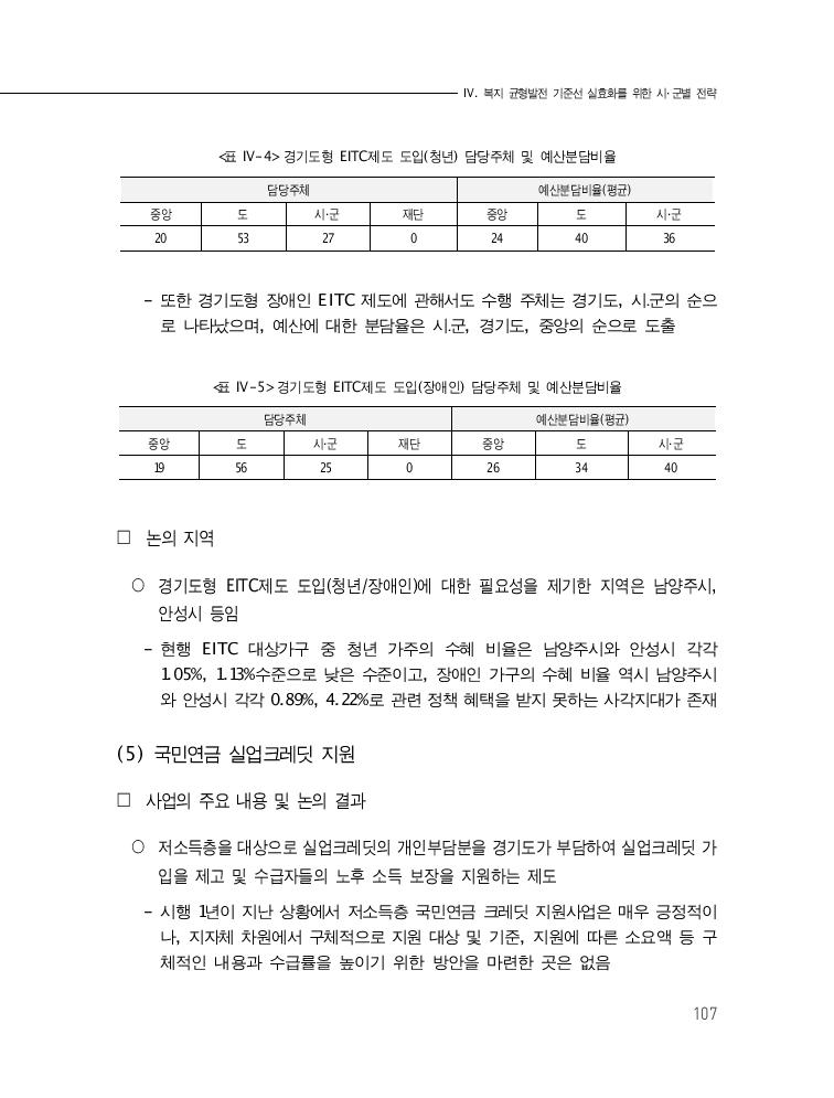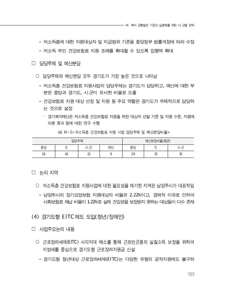 경기도 복지 균형발전 기준선 실효화 방안 연구 258 저소득 및 일자리 노인돌봄 장애인 돌봄  저소득층 국민건강보험료 지 원 확대  저소득층 국민연금 실업크레 딧 지원  장애인생산품 우선구매 내실화  훈련지원형 일자리  노인일자리 전달체계 일원화  민간영역 노인일자리 확대  저소득 민간일자리 확대  생활임금제 활성화  직업재활시설 근로 장애인 임금보조 및 지원  독거노인 사회참여활동 연계  노인돌봄에 대한 홍보  현장의 건의사항에 대해 공 문화  경기도 노인종합상담센터 활 성화 및 적극적 연계  노인돌봄예방정보제공  가족 및 이웃 돌봄서비스 인정  장애유형에 따른 활동지원 서비스 제공  활동지원인의 근로조건 및 처우개선  성인장애인을 위한 소규모 거주시설 및 공동생활 가정 확대  본인부담 감면 및 경감  거리에 따른 교통비 추가지원  돌봄서비스 추가 시간 기준 일원화 <표 Ⅳ-105> 수원시의 우선추진과제 (3) 중장기 추진과제 □ 저소득 및 일자리 ○ 수원시는 복지사각지대 최소화, 복지정책의 전달체계 효율화, 노인 계층 등의 일자 리 발굴, 장애인 근로기회 확대 등의 과업 추진 - 수원시가 중장기적으로 추진해야 하는 과제는 복지 사각지대 존재하는 대상자의 최소화, 지역 내 복지주요 이해관계자 간 협력 체계 강화, 전달체계 효율화, 저소 득 계층의 근로소득 간접지원등의 정책 이 추진되어야 하며, 일자리 분야에서는 노인과 타연령 간의 융합을 통한 일자리 발굴 등 직접적인 일자리 지원과 직업재 활시설 근로 장애인 임금보조 및 지원, 장애인생산품 우선구매 내실화, 장애인 근로기회 확대 등의 정책 추진의 필요성이 있는 것으로 나타남 - 수원시가 중장기적으로 추진해야 할 과제 중 저소득분야는 ①경기도형 EITC 지 원(청년/장애인), ②무한돌봄사업 대상자 확대, ③중간실무협의체 활성화, ④전 달체계 효율화가 도출되었으며, ①일자리센터 기능 강화, ②노인 및 장애인 연계 일자리 창출, ③지역특화형 자활사업 활성화, ④장애인 직업재활시설 확대, ⑤자