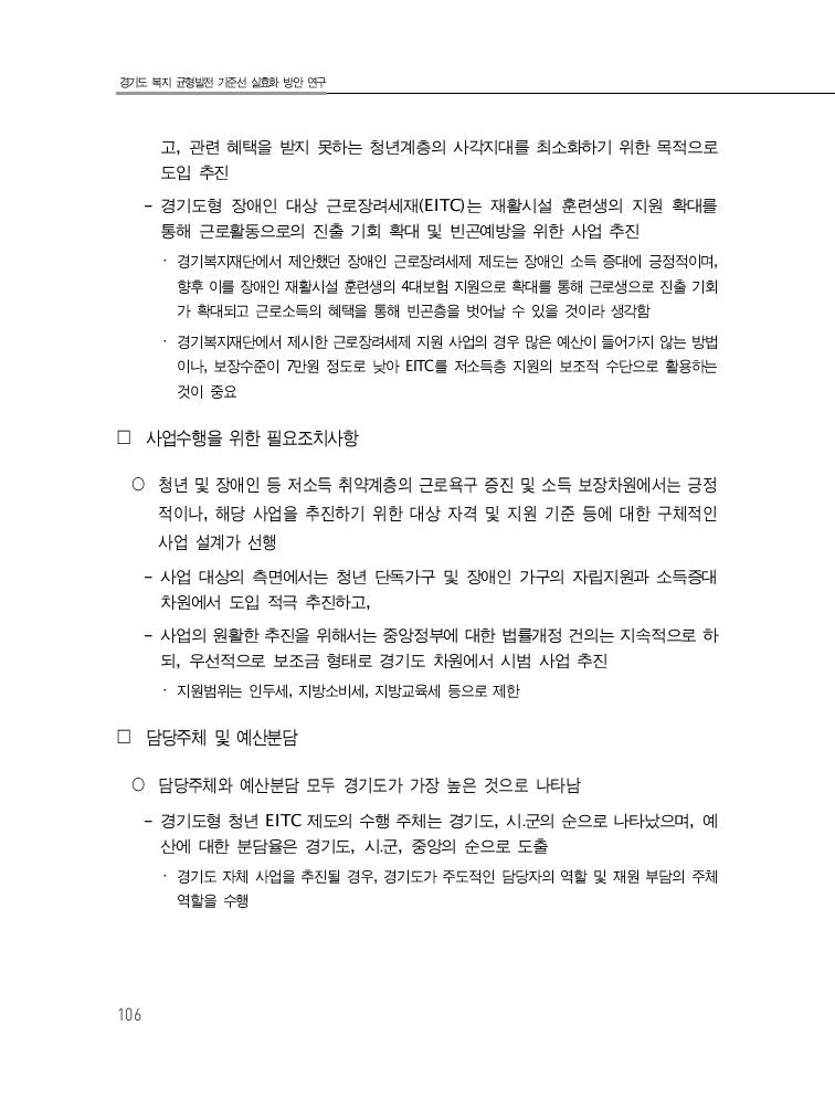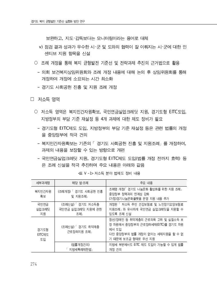 경기도 복지 균형발전 기준선 실효화 방안 연구 274 세부과제명 해당 법·조례 주요 내용 복지민간자원 확보 (조례개정) 「경기도 사회공헌 진흥 및 지원조례」 조례명 개정(「경기도 나눔문화 활성화를 위한 지원 조례」 중앙정부 정책과의 연계성 강화 (가칭)경기나눔문화플랫폼 운영 지원 내용 추가 국민연금 실업크레딧 지원 (조례신설) 「경기도 저소득층 국민연금 실업크레딧 지원에 관한 조례」 개정된 「저소득 주민 건강보험료 및 노인장기요양보험료 지원조례」와 유사하게 국민연금 실업크레딧을 지원할 수 있도록 조례 신설 경기도형 EITC제도 도입 (조례신설) 「경기도 취약계층 근로장려지원 조례」 청년/장애인 등 취약계층의 근로의욕 고취 및 실질소득 보 장 차원에서 중앙정부의 근로장려세제(EITC)를 경기도 차원 에서 도입 다만 중앙정부의 법률 개정이 없이는 세제지원을 할 수 없 기 때문에 보조금 형태로 우선 지원 (법률개정건의) 「지방세특례제한법」 지방세 부분에서도 EITC 제도 도입이 가능할 수 있게 법률 개정 건의 <표 Ⅴ-1> 저소득 분야 법제도 정비 내용 보완하고, 지도・감독보다는 모니터링이라는 용어로 대체 v) 점검 결과 성과가 우수한 시・군 및 도와의 협력이 잘 이뤄지는 시・군에 대한 인 센티브 지원 항목을 신설 ○ 조례 개정을 통해 복지 균형발전 기준선 및 전략과제 추진의 근거법으로 활용 - 의회 보건복지상임위원회와 조례 개정 내용에 대해 논의 후 상임위원회를 통해 개정하여 개정에 소요되는 시간 최소화 - 경기도 사회공헌 진흥 및 지원 조례 개정 □ 저소득 영역 ○ 저소득 영역은 복지민간자원확보, 국민연금실업크레딧 지원, 경기도형 EITC도입, 지방정부의 부담 기준 재설정 등 4개 과제에 대한 제도 정비가 필요 - 경기도형 EITC제도 도입, 지방정부의 부담 기준 재설정 등은 관련 법률의 개정 을 중앙정부에 적극 건의 - 복지민간자원확보는 기존의 「경기도 사회공헌 진흥 및 지원조례」를 개정하여, 과제의 내용을 보장할 수 있는 방향으로 개편 - 국민연금실업크레딧 지원, 경기도형 EITC제도 도입(법률 개정 전까지 효력) 등 은 조례 신설을 적극 추진하며 주요 내용은 아래와 같음