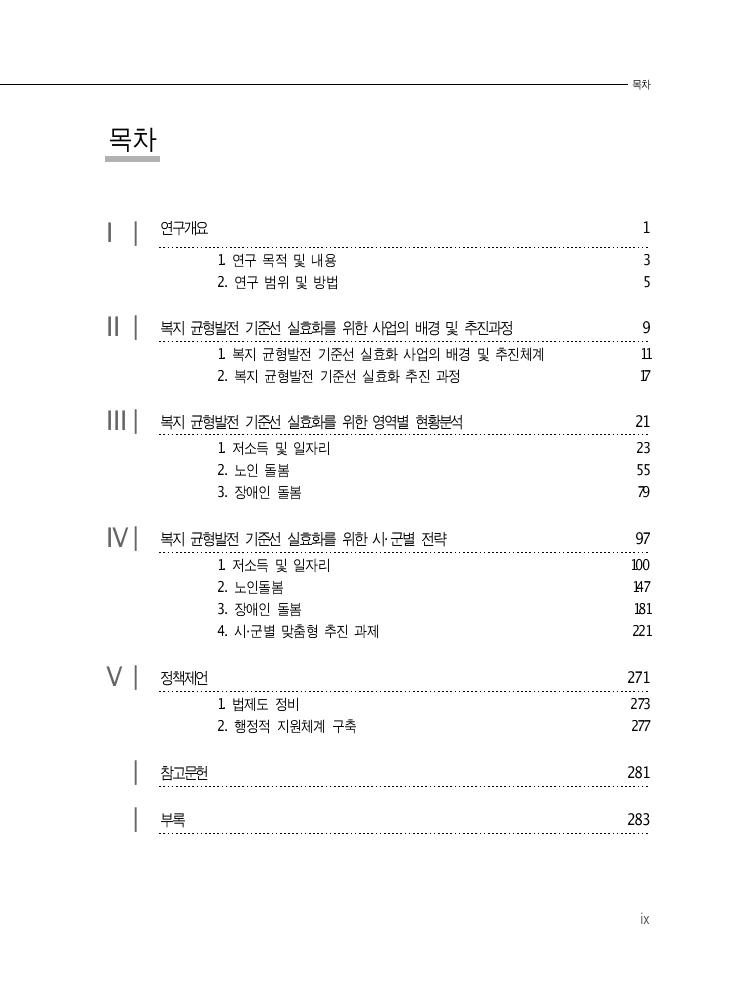목차 ix 목차 Ⅰ| 연구개요 1 1. 연구 목적 및 내용 3 2. 연구 범위 및 방법 5 Ⅱ| 복지 균형발전 기준선 실효화를 위한 사업의 배경 및 추진과정 9 1. 복지 균형발전 기준선 실효화 사업의 배경 및 추진체계 11 2. 복지 균형발전 기준선 실효화 추진 과정 17 Ⅲ| 복지 균형발전 기준선 실효화를 위한 영역별 현황분석 21 1. 저소득 및 일자리 23 2. 노인 돌봄 55 3. 장애인 돌봄 79 Ⅳ| 복지 균형발전 기준선 실효화를 위한 시·군별 전략 97 1. 저소득 및 일자리 100 2. 노인돌봄 147 3. 장애인 돌봄 181 4. 시·군별 맞춤형 추진 과제 221 Ⅴ| 정책제언 271 1. 법제도 정비 273 2. 행정적 지원체계 구축 277 | 참고문헌 281 | 부록 283