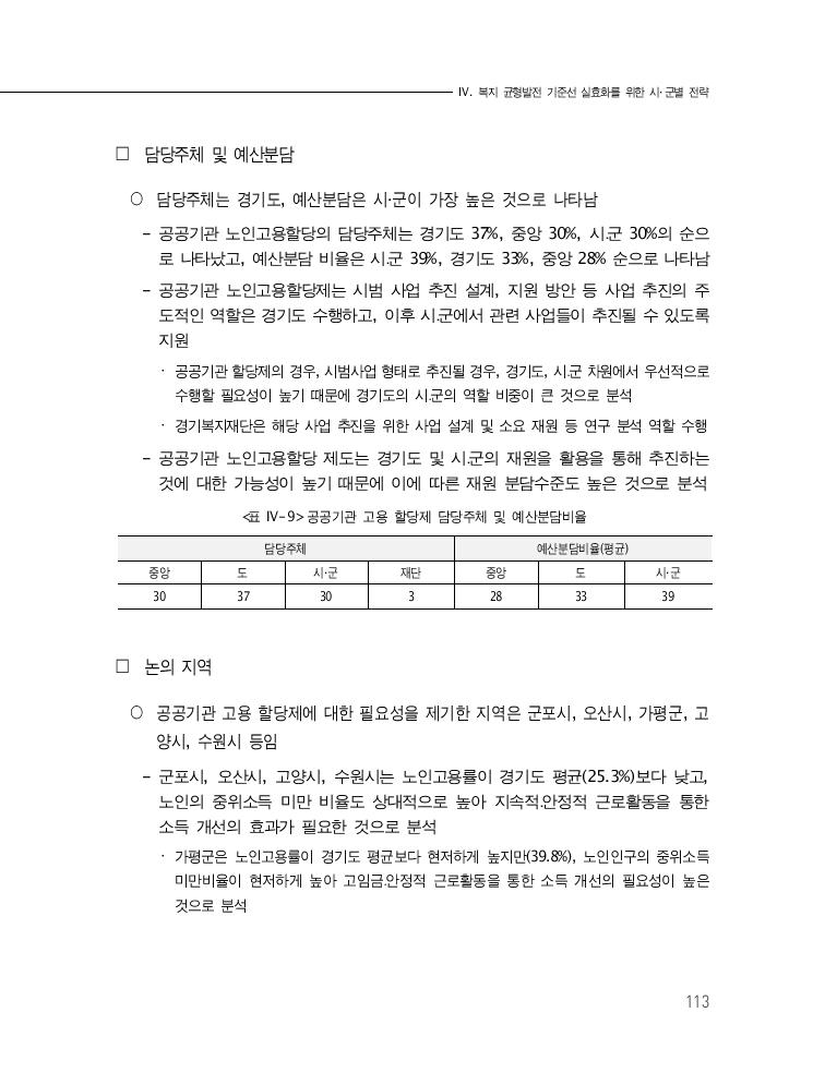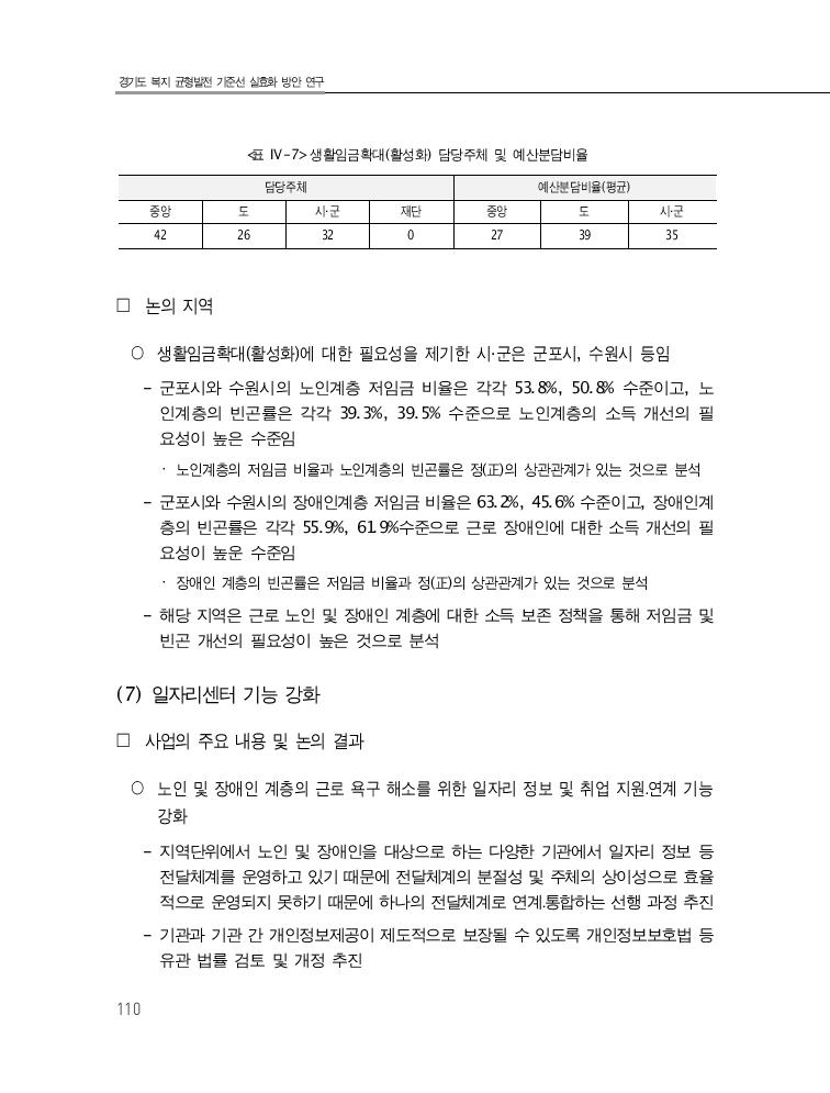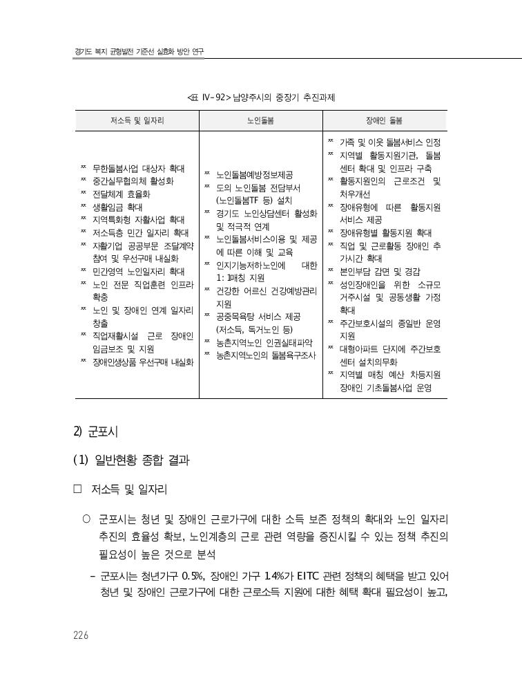 경기도 복지 균형발전 기준선 실효화 방안 연구 226 저소득 및 일자리 노인돌봄 장애인 돌봄  무한돌봄사업 대상자 확대  중간실무협의체 활성화  전달체계 효율화  생활임금 확대  지역특화형 자활사업 확대  저소득층 민간 일자리 확대  자활기업 공공부문 조달계약 참여 및 우선구매 내실화  민간영역 노인일자리 확대  노인 전문 직업훈련 인프라 확충  노인 및 장애인 연계 일자리 창출  직업재활시설 근로 장애인 임금보조 및 지원  장애인생상품 우선구매 내실화  노인돌봄예방정보제공  도의 노인돌봄 전담부서 (노인돌봄TF 등) 설치  경기도 노인상담센터 활성화 및 적극적 연계  노인돌봄서비스이용 및 제공 에 따른 이해 및 교육  인지기능저하노인에 대한 1:1매칭 지원  건강한 어르신 건강예방관리 지원  공중목욕탕 서비스 제공 (저소득, 독거노인 등)  농촌지역노인 인권실태파악  농촌지역노인의 돌봄욕구조사  가족 및 이웃 돌봄서비스 인정  지역별 활동지원기관, 돌봄 센터 확대 및 인프라 구축  활동지원인의 근로조건 및 처우개선  장애유형에 따른 활동지원 서비스 제공  장애유형별 활동지원 확대  직업 및 근로활동 장애인 추 가시간 확대  본인부담 감면 및 경감  성인장애인을 위한 소규모 거주시설 및 공동생활 가정 확대  주간보호시설의 종일반 운영 지원  대형아파트 단지에 주간보호 센터 설치의무화  지역별 매칭 예산 차등지원 장애인 기초돌봄사업 운영 <표 Ⅳ-92> 남양주시의 중장기 추진과제 2) 군포시 (1) 일반현황 종합 결과 □ 저소득 및 일자리 ○ 군포시는 청년 및 장애인 근로가구에 대한 소득 보존 정책의 확대와 노인 일자리 추진의 효율성 확보, 노인계층의 근로 관련 역량을 증진시킬 수 있는 정책 추진의 필요성이 높은 것으로 분석 - 군포시는 청년가구 0.5%, 장애인 가구 1.4%가 EITC 관련 정책의 혜택을 받고 있어 청년 및 장애인 근로가구에 대한 근로소득 지원에 대한 혜택 확대 필요성이 높고,