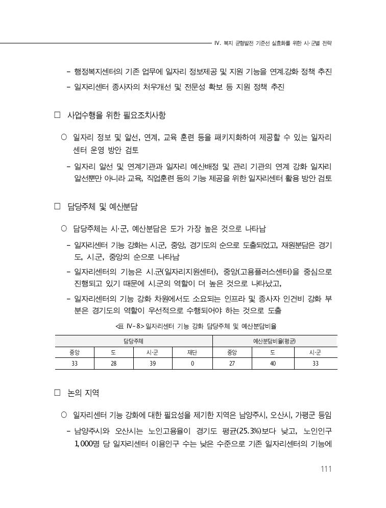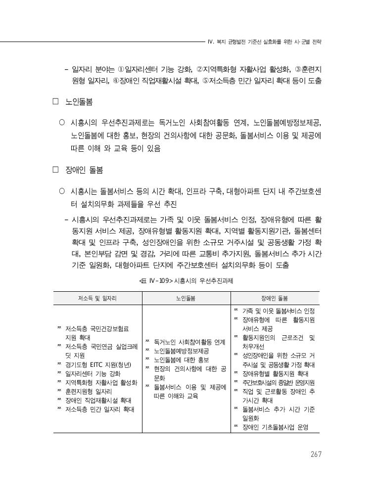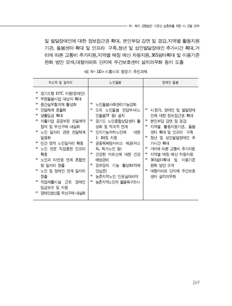 Ⅳ. 복지 균형발전 기준선 실효화를 위한 시·군별 전략 269 및 발달장애인에 대한 정보접근권 확대, 본인부담 감면 및 경감,지역별 활동지원 기관, 돌봄센터 확대 및 인프라 구축,청년 및 성인발달장애인 추가시간 확대,거 리에 따른 교통비 추가지원,지역별 매칭 예산 차등지원,365쉼터확대 및 이용기준 완화 방안 모색,대형아파트 단지에 주간보호센터 설치의무화 등이 도출 저소득 및 일자리 노인돌봄 장애인 돌봄  경기도형 EITC 지원(장애인)  무한돌봄사업 대상자 확대  중간실무협의체 활성화  전달체계 효율화  생활임금 확대  자활기업 공공부문 조달계약 참여 및 우선구매 내실화  노인 일자리 관련 전달체계 일원화  민간 영역 노인일자리 확충  노인 전문 직업훈련 인프라 확충  노인과 타연령 연계 혼합연 령 일자리 창출  노인 및 장애인 연계 일자리 창출  직업재활시설 근로 장애인 임금보조 및 지원  장애인생산품 우선구매 내실화  노인돌봄사례관리기능강화  도의 노인돌봄 전담부서(노 인돌봄TF 등) 설치  경기도 노인종합상담센터 활 성화 및 적극적 연계  인지기능저하노인에 대한 1:1매칭 지원  공중목욕탕서비스 제공(저소 득, 독거노인 등)  건강한 어르신에 대한 건강 예방관리  경로당의 기능 활성화(치매 안심존)  농촌지역노인 인권실태파악  농촌지역노인의 돌봄욕구조사  시․청각, 장애인 및 발달장애 인에 대한 정보접근권 확대  본인부담 감면 및 경감  지역별 활동지원기관, 돌봄 센터 확대 및 인프라 구축  청년 및 성인발달장애인 추 가시간 확대  거리에 따른 교통비 추가지원  지역별 매칭 예산 차등지원  365쉼터확대 및 이용기준 완화 방안 모색  대형아파트 단지에 주간보호 센터 설치의무화 <표 Ⅳ-110> 시흥시의 중장기 추진과제