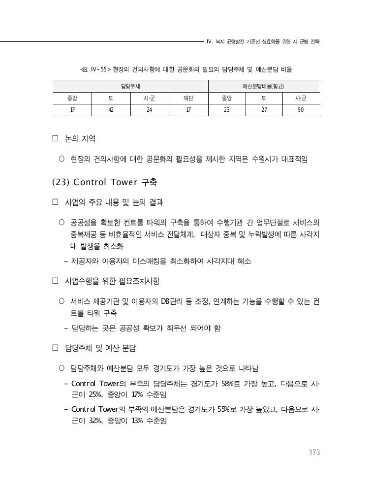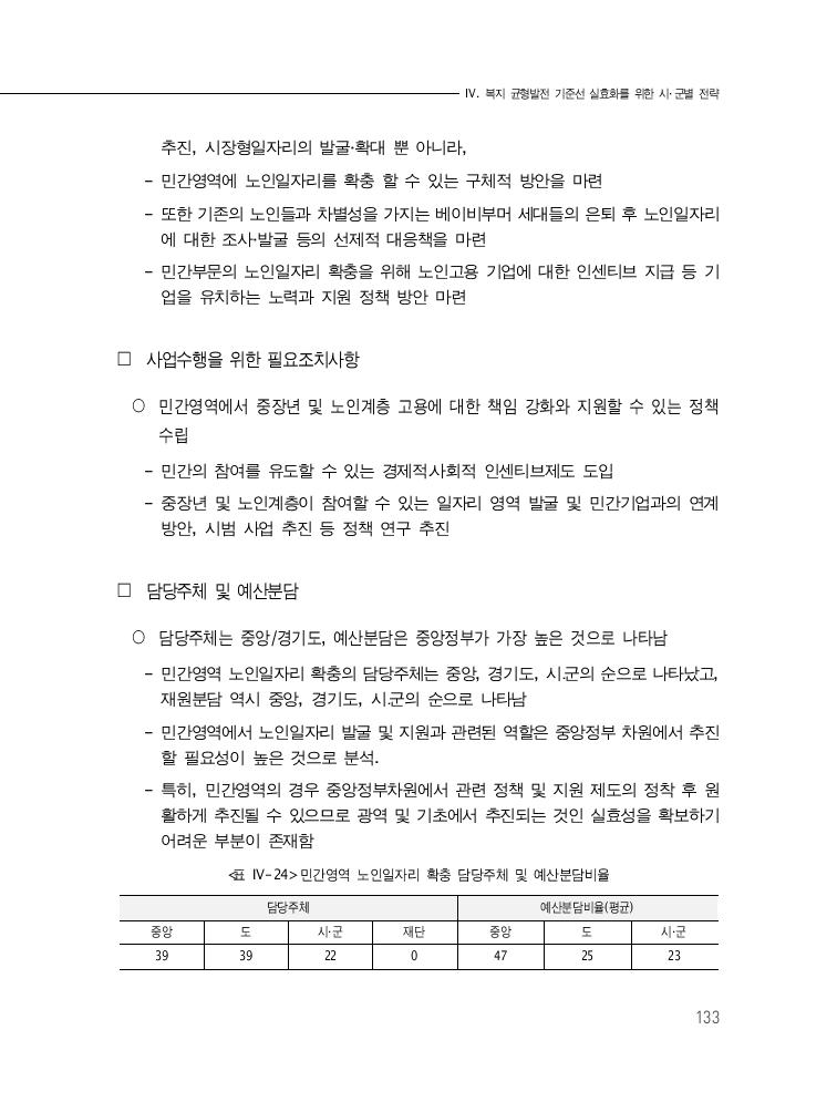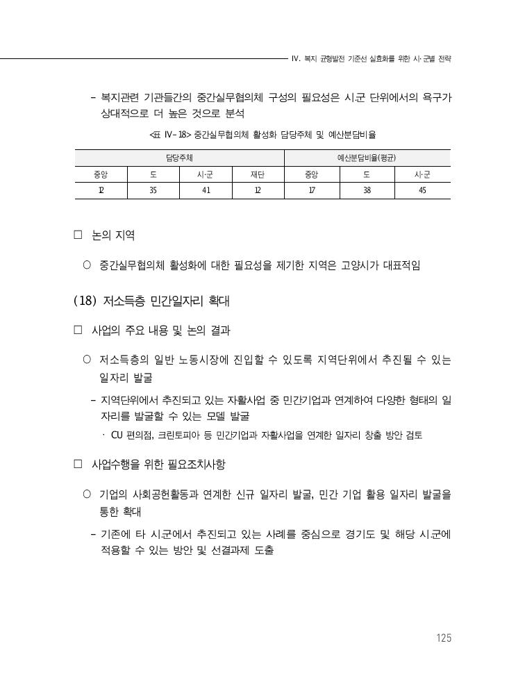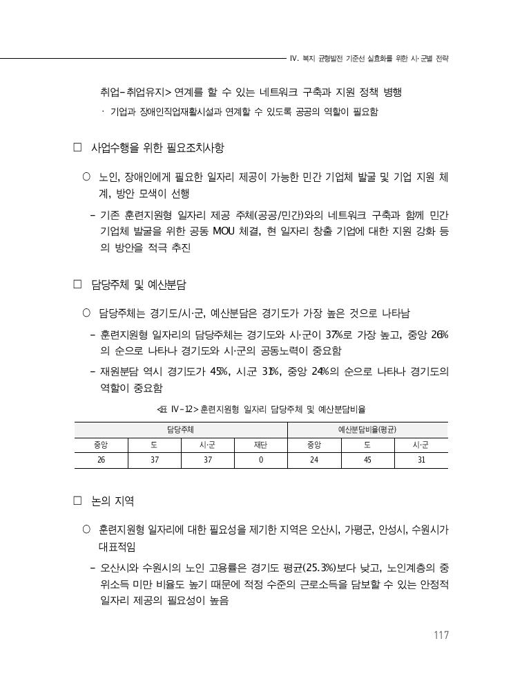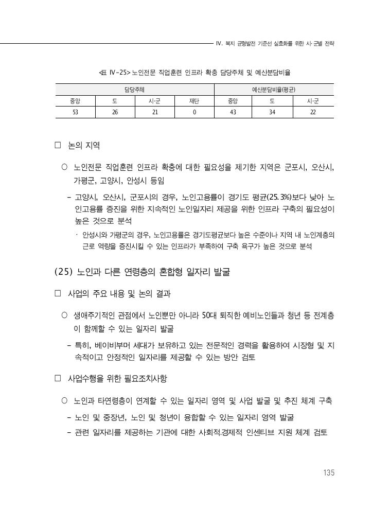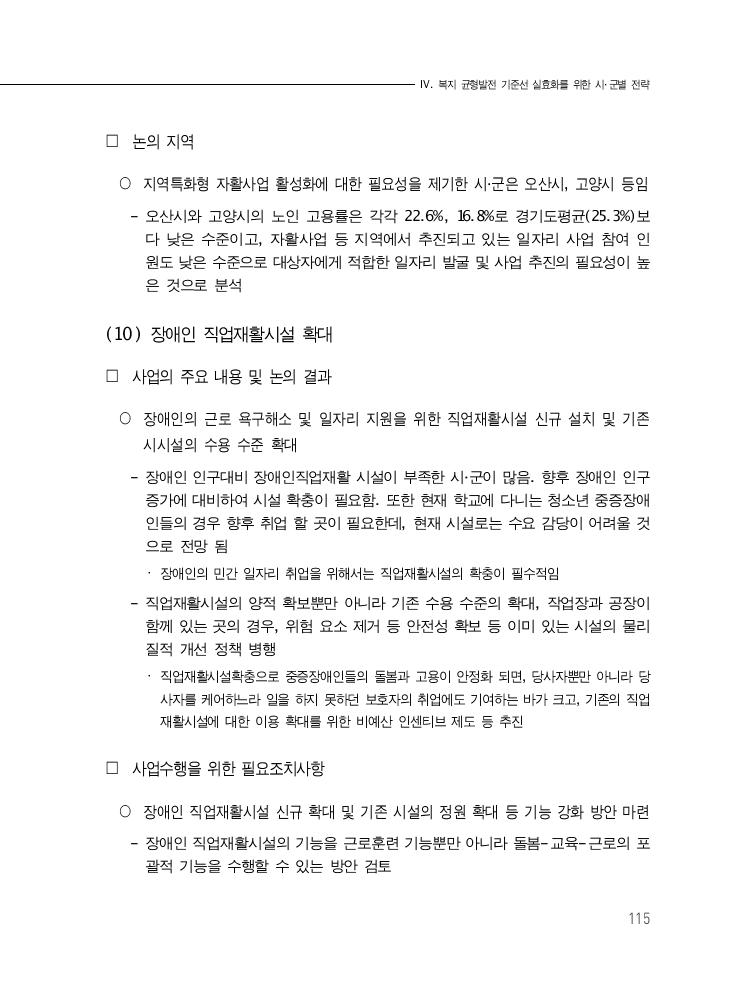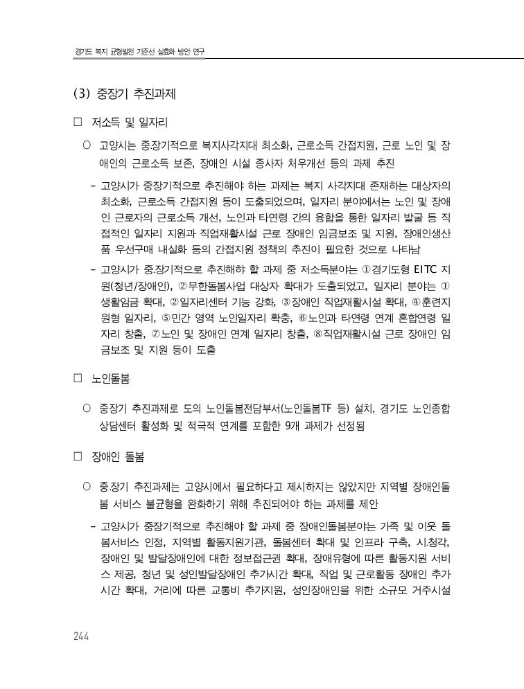 경기도 복지 균형발전 기준선 실효화 방안 연구 244 (3) 중장기 추진과제 □ 저소득 및 일자리 ○ 고양시는 중․장기적으로 복지사각지대 최소화, 근로소득 간접지원, 근로 노인 및 장 애인의 근로소득 보존, 장애인 시설 종사자 처우개선 등의 과제 추진 - 고양시가 중장기적으로 추진해야 하는 과제는 복지 사각지대 존재하는 대상자의 최소화, 근로소득 간접지원 등이 도출되었으며, 일자리 분야에서는 노인 및 장애 인 근로자의 근로소득 개선, 노인과 타연령 간의 융합을 통한 일자리 발굴 등 직 접적인 일자리 지원과 직업재활시설 근로 장애인 임금보조 및 지원, 장애인생산 품 우선구매 내실화 등의 간접지원 정책의 추진이 필요한 것으로 나타남 - 고양시가 중․장기적으로 추진해햐 할 과제 중 저소득분야는 ①경기도형 EITC 지 원(청년/장애인), ②무한돌봄사업 대상자 확대가 도출되었고, 일자리 분야는 ① 생활임금 확대, ②일자리센터 기능 강화, ③장애인 직업재활시설 확대, ④훈련지 원형 일자리, ⑤민간 영역 노인일자리 확충, ⑥노인과 타연령 연계 혼합연령 일 자리 창출, ⑦노인 및 장애인 연계 일자리 창출, ⑧직업재활시설 근로 장애인 임 금보조 및 지원 등이 도출 □ 노인돌봄 ○ 중장기 추진과제로 도의 노인돌봄전담부서(노인돌봄TF 등) 설치, 경기도 노인종합 상담센터 활성화 및 적극적 연계를 포함한 9개 과제가 선정됨 □ 장애인 돌봄 ○ 중․장기 추진과제는 고양시에서 필요하다고 제시하지는 않았지만 지역별 장애인돌 봄 서비스 불균형을 완화하기 위해 추진되어야 하는 과제를 제안 - 고양시가 중장기적으로 추진해야 할 과제 중 장애인돌봄분야는 가족 및 이웃 돌 봄서비스 인정, 지역별 활동지원기관, 돌봄센터 확대 및 인프라 구축, 시․청각, 장애인 및 발달장애인에 대한 정보접근권 확대, 장애유형에 따른 활동지원 서비 스 제공, 청년 및 성인발달장애인 추가시간 확대, 직업 및 근로활동 장애인 추가 시간 확대, 거리에 따른 교통비 추가지원, 성인장애인을 위한 소규모 거주시설