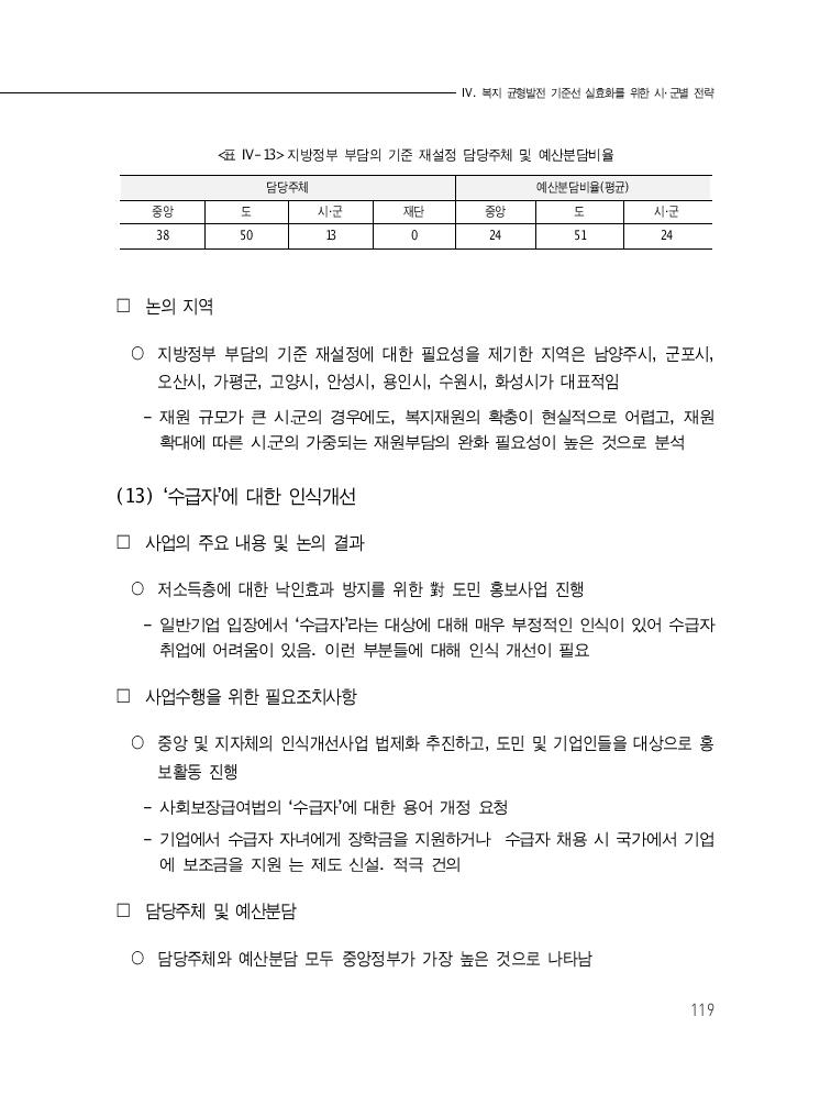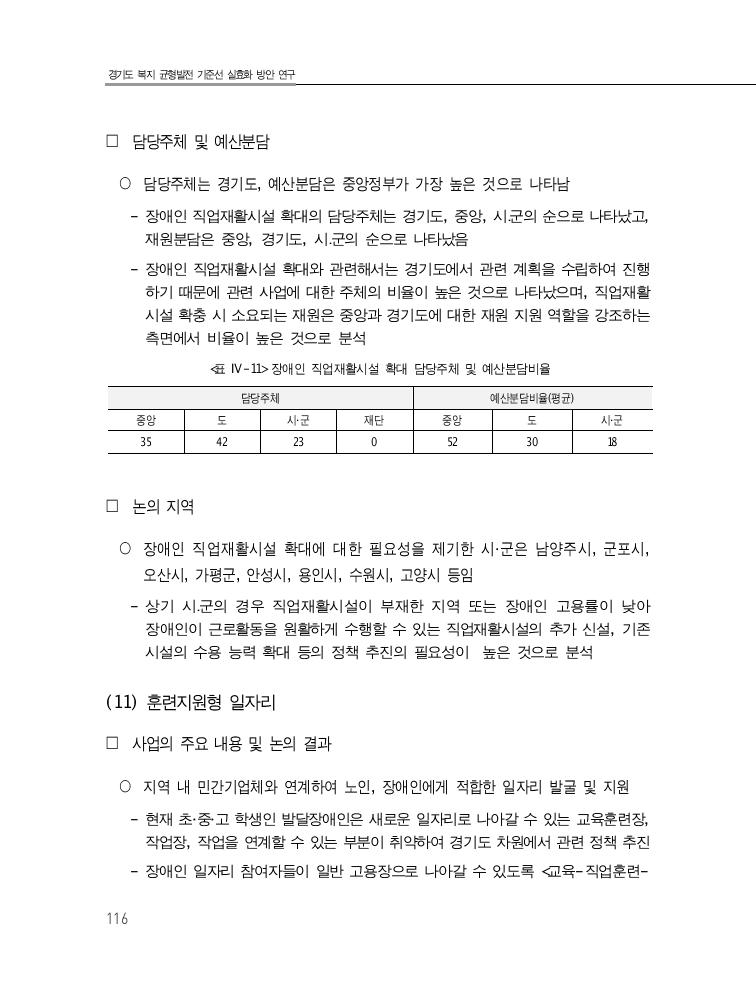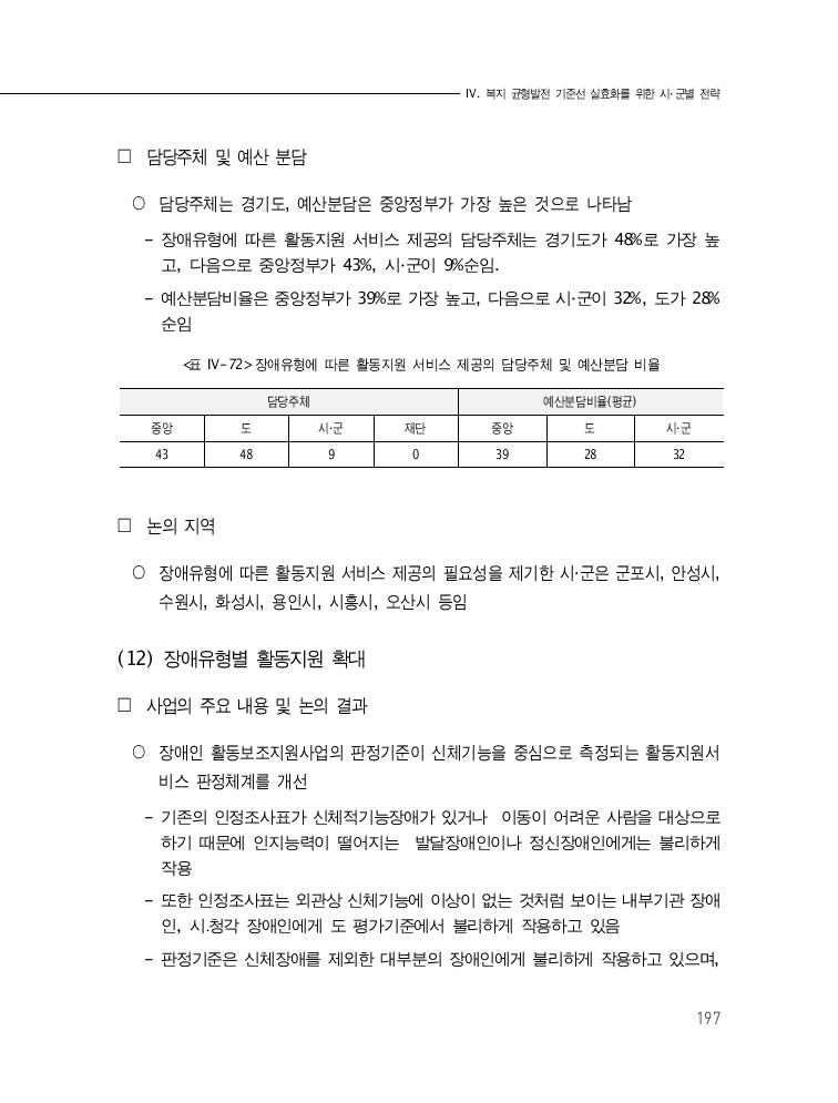 Ⅳ. 복지 균형발전 기준선 실효화를 위한 시·군별 전략 197 □ 담당주체 및 예산 분담 ○ 담당주체는 경기도, 예산분담은 중앙정부가 가장 높은 것으로 나타남 - 장애유형에 따른 활동지원 서비스 제공의 담당주체는 경기도가 48%로 가장 높 고, 다음으로 중앙정부가 43%, 시·군이 9%순임. - 예산분담비율은 중앙정부가 39%로 가장 높고, 다음으로 시·군이 32%, 도가 28% 순임 담당주체 예산분담비율(평균) 중앙 도 시·군 재단 중앙 도 시·군 43 48 9 0 39 28 32 <표 Ⅳ-72> 장애유형에 따른 활동지원 서비스 제공의 담당주체 및 예산분담 비율 □ 논의 지역 ○ 장애유형에 따른 활동지원 서비스 제공의 필요성을 제기한 시·군은 군포시, 안성시, 수원시, 화성시, 용인시, 시흥시, 오산시 등임 (12) 장애유형별 활동지원 확대 □ 사업의 주요 내용 및 논의 결과 ○ 장애인 활동보조지원사업의 판정기준이 신체기능을 중심으로 측정되는 활동지원서 비스 판정체계를 개선 - 기존의 인정조사표가 신체적기능장애가 있거나 이동이 어려운 사람을 대상으로 하기 때문에 인지능력이 떨어지는 발달장애인이나 정신장애인에게는 불리하게 작용 - 또한 인정조사표는 외관상 신체기능에 이상이 없는 것처럼 보이는 내부기관 장애 인, 시․청각 장애인에게 도 평가기준에서 불리하게 작용하고 있음 - 판정기준은 신체장애를 제외한 대부분의 장애인에게 불리하게 작용하고 있으며,