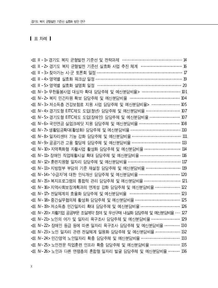 경기도 복지 균형발전 기준선 실효화 방안 연구 x 표 차례 <표 Ⅱ-1> 경기도 복지 균형발전 기준선 및 전략과제 ························································ 14 <표 Ⅱ-2> 경기도 복지 균형발전 기준선 실효화 사업 추진 체계 ······································· 16 <표 Ⅱ-3> 찾아가는 시·군 토론회 일정 ················································································ 17 <표 Ⅱ-4> 영역별 실효화 워크샵 일정 ················································································· 19 <표 Ⅱ-5> 영역별 실효화 설명회 일정 ··············································································· 20 <표 Ⅳ-1> 무한돌봄사업 대상자 확대 담당주체 및 예산분담비율> ···································· 101 <표 Ⅳ-2> 복지 민간자원 확보 담당주체 및 예산분담비율 ··············································· 104 <표 Ⅳ-3> 저소득층 건강보험료 지원 사업 담당주체 및 예산분담비율> ·························· 105 <표 Ⅳ-4> 경기도형 EITC제도 도입(청년) 담당주체 및 예산분담비율 ································ 107 <표 Ⅳ-5> 경기도형 EITC제도 도입(장애인) 담당주체 및 예산분담비율 ···························· 107 <표 Ⅳ-6> 국민연금 실업크레딧 지원 담당주체 및 예산분담비율 ······································ 108 <표 Ⅳ-7> 생활임금확대(활성화) 담당주체 및 예산분담비율 ··············································· 110 <표 Ⅳ-8> 일자리센터 기능 강화 담당주체 및 예산분담비율 ·············································· 111 <표 Ⅳ-9> 공공기관 고용 할당제 담당주체 및 예산분담비율 ·············································· 113 <표 Ⅳ-10> 지역특화형 자활사업 활성화 담당주체 및 예산분담비율 ·································· 114 <표 Ⅳ-11> 장애인 직업재활시설 확대 담당주체 및 예산분담비율 ······································ 116 <표 Ⅳ-12> 훈련지원형 일자리 담당주체 및 예산분담비율 ·················································· 117 <표 Ⅳ-13> 지방정부 부담의 기준 재설정 담당주체 및 예산분담비율 ································ 119 <표 Ⅳ-14> ‘수급자’에 대한 인식개선 담당주체 및 예산분담비율 ······································ 120 <표 Ⅳ-15> 복지프로그램의 통합적 관리 담당주체 및 예산분담비율 ·································· 121 <표 Ⅳ-16> 지역사회보장계획과의 연계성 강화 담당주체 및 예산분담비율 ······················· 122 <표 Ⅳ-17> 전달체계의 효율화 담당주체 및 예산분담비율 ··············································· 123 <표 Ⅳ-18> 중간실무협의체 활성화 담당주체 및 예산분담비율 ·········································· 125 <표 Ⅳ-19> 저소득층 민간일자리 확대 담당주체 및 예산분담비율 ····································· 126 <표 Ⅳ-20> 자활기업 공공부문 조달계약 참여 및 우선구매 내실화 담당주체 및 예산분담비율 ···· 127 <표 Ⅳ-21> 노인의 여가 및 일자리 욕구조사 담당주체 및 예산분담비율 ··························· 129 <표 Ⅳ-22> 장애인 등급 등에 따른 일자리 욕구조사 담당주체 및 예산분담비율 ·············· 130 <표 Ⅳ-23> 노인 일자리 관련 전달체계 일원화 담당주체 및 예산분담비율 ······················· 132 <표 Ⅳ-24> 민간영역 노인일자리 확충 담당주체 및 예산분담비율 ···································· 133 <표 Ⅳ-25> 노인전문 직업훈련 인프라 확충 담당주체 및 예산분담비율 ···························· 135 <표 Ⅳ-26> 노인과 다른 연령층의 혼합형 일자리 발굴 담당주체 및 예산분담비율 ··········· 136