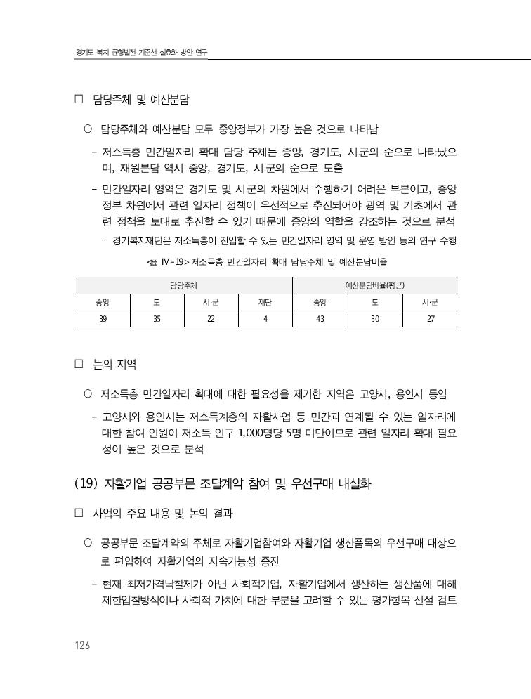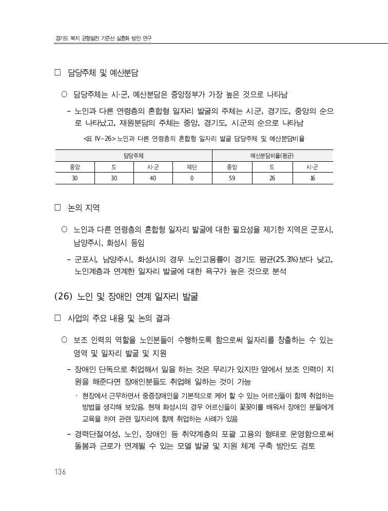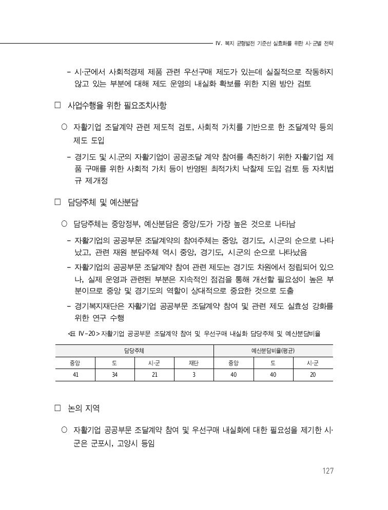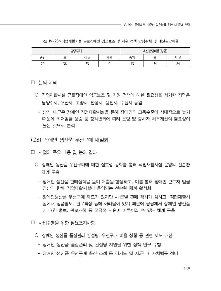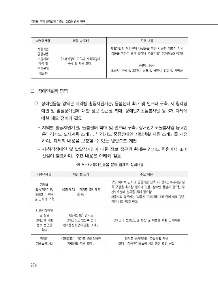 Ⅴ. 정책제언 275 세부과제명 해당 법·조례 주요 내용 지방정부 부담의 기준 재설정 (법률개정건의) 「보조금 관리에 관한 법률」 및 동법 시행령 현 시행령 별표 1에는 121개 사업을 대상으로 보조율을 적 용하고 있으며, 나머지는 모두 자의적 기준에 의해 보조율 이 결정되고 있음 또한 법률 상 지방정부의 부담이 증가하는 경우 협의를 할 수 있는 규정을 신설하는 것도 필요 세부과제명 해당 법·조례 주요 내용 노인여가 및 일자리 욕구 조사 (조례개정)「경기도 노인일자리 창출 지원 조례」 「경기도 노인일자리 창출 지원 조례」제4조 노인일자리 기본 계획 수립 내용 중 여가, 일자리 욕구 실태조사 내용 추가 장애인 일자리 욕구 실태조사 (조례개정)「경기도 장애인고용촉진 및 직업재활지원 조례」 「경기도 장애인고용촉진 및 직업재활지원 조례」(장애인 고용촉진 및 직업재활 기본계획) 관련 조항 신설 장애인 생산품 우선구매 (조례신설)「○○시 장애인생산품 우선구매 촉진 조례」 장애인 생산품 우선구매 제도적 근거 마련 및 우선구매 내실화를 위한 정책 추진을 위해 해당 시․군 차원에서 도입 (해당 시·군) 남양주시, 군포시, 가평군, 고양시, 안성시, 시흥시 <표 Ⅴ-2> 일자리 분야 분야 법제도 정비 내용 □ 일자리 영역 ○ 일자리 영역은 노인여가 및 일자리욕구조사, 장애인 일자리 욕구조사, 장애인생산 품 우선구매, 자활기업 공공부문 조달계약 참여 및 우선구매 내실화 등 4개 과제에 대한 제도 정비가 필요 - 노인여가 및 일자리 욕구조사, 장애인 일자리 욕구 실태조사, 자활기업 공공부문 조달계약 참여 및 우선구매 내실화 등 3건은 「경기도 노인일자리 창출 지원 조 례」, 「경기도 장애인고용촉진 및 직업재활지원 조례」, 「○○시 사회적경제 육성 및 지원 조례」를 개정하여 과제의 내용을 보장할 수 있는 방향으로 개편 - 장애인생산품 우선구매는 시·군이 적극적으로 조례를 신설할 것이 요구되며, 주 요 내용은 아래와 같음