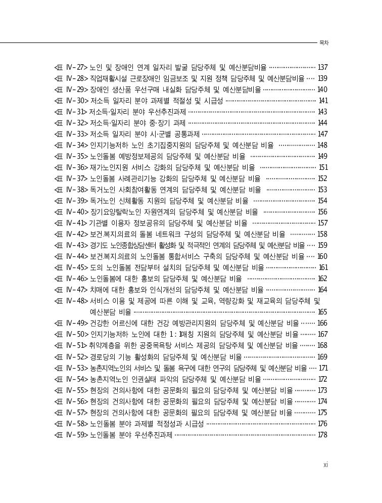 목차 xi <표 Ⅳ-27> 노인 및 장애인 연계 일자리 발굴 담당주체 및 예산분담비율 ························· 137 <표 Ⅳ-28> 직업재활시설 근로장애인 임금보조 및 지원 정책 담당주체 및 예산분담비율 ···· 139 <표 Ⅳ-29> 장애인 생산품 우선구매 내실화 담당주체 및 예산분담비율 ···························· 140 <표 Ⅳ-30> 저소득 일자리 분야 과제별 적절성 및 시급성 ················································· 141 <표 Ⅳ-31> 저소득·일자리 분야 우선추진과제 ···································································· 143 <표 Ⅳ-32> 저소득·일자리 분야 중·장기 과제 ···································································· 144 <표 Ⅳ-33> 저소득 일자리 분야 시·군별 공통과제 ····························································· 147 <표 Ⅳ-34> 인지기능저하 노인 초기집중지원의 담당주체 및 예산분담 비율 ··················· 148 <표 Ⅳ-35> 노인돌봄 예방정보제공의 담당주체 및 예산분담 비율 ··································· 149 <표 Ⅳ-36> 재가노인지원 서비스 강화의 담당주체 및 예산분담 비율 ······························ 151 <표 Ⅳ-37> 노인돌봄 사례관리기능 강화의 담당주체 및 예산분담 비율 ·························· 152 <표 Ⅳ-38> 독거노인 사회참여활동 연계의 담당주체 및 예산분담 비율 ·························· 153 <표 Ⅳ-39> 독거노인 신체활동 지원의 담당주체 및 예산분담 비율 ································· 154 <표 Ⅳ-40> 장기요양탈락노인 자원연계의 담당주체 및 예산분담 비율 ···························· 156 <표 Ⅳ-41> 기관별 이용자 정보공유의 담당주체 및 예산분담 비율 ·································· 157 <표 Ⅳ-42> 보건․복지․의료의 돌봄 네트워크 구성의 담당주체 및 예산분담 비율 ············· 158 <표 Ⅳ-43> 경기도 노인종합상담센터 활성화 및 적극적인 연계의 담당주체 및 예산분담 비율 ···· 159 <표 Ⅳ-44> 보건․복지․의료의 노인돌봄 통합서비스 구축의 담당주체 및 예산분담 비율 ···· 160 <표 Ⅳ-45> 도의 노인돌봄 전담부터 설치의 담당주체 및 예산분담 비율 ··························· 161 <표 Ⅳ-46> 노인돌봄에 대한 홍보의 담당주체 및 예산분담 비율 ···································· 162 <표 Ⅳ-47> 치매에 대한 홍보와 인식개선의 담당주체 및 예산분담 비율 ·························· 164 <표 Ⅳ-48> 서비스 이용 및 제공에 따른 이해 및 교육, 역량강화 및 재교육의 담당주체 및 예산분담 비율 ·································································································· 165 <표 Ⅳ-49> 건강한 어르신에 대한 건강 예방관리지원의 담당주체 및 예산분담 비율 ······· 166 <표 Ⅳ-50> 인지기능저하 노인에 대한 1:1매칭 지원의 담당주체 및 예산분담 비율 ········ 167 <표 Ⅳ-51> 취약계층을 위한 공중목욕탕 서비스 제공의 담당주체 및 예산분담 비율 ········ 168 <표 Ⅳ-52> 경로당의 기능 활성화의 담당주체 및 예산분담 비율 ······································ 169 <표 Ⅳ-53> 농촌지역노인의 서비스 및 돌봄 욕구에 대한 연구의 담당주체 및 예산분담 비율 ···· 171 <표 Ⅳ-54> 농촌지역노인 인권실태 파악의 담당주체 및 예산분담 비율 ···························· 172 <표 Ⅳ-55> 현장의 건의사항에 대한 공문화의 필요의 담당주체 및 예산분담 비율 ··········· 173 <표 Ⅳ-56> 현장의 건의사항에 대한 공문화의 필요의 담당주체 및 예산분담 비율 ··········· 174 <표 Ⅳ-57> 현장의 건의사항에 대한 공문화의 필요의 담당주체 및 예산분담 비율 ··········· 175 <표 Ⅳ-58> 노인돌봄 분야 과제별 적정성과 시급성 ··························································· 176 <표 Ⅳ-59> 노인돌봄 분야 우선추진과제 ············································································ 178