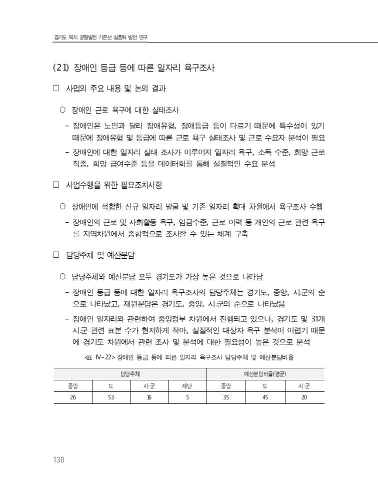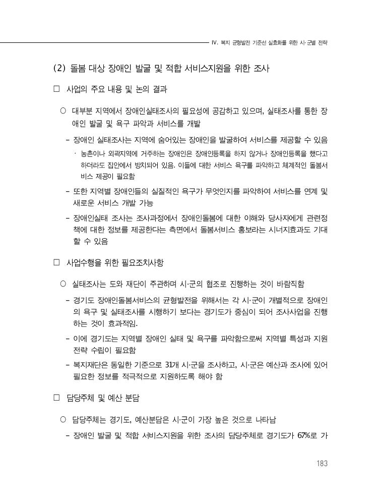 Ⅳ. 복지 균형발전 기준선 실효화를 위한 시·군별 전략 183 (2) 돌봄 대상 장애인 발굴 및 적합 서비스지원을 위한 조사 □ 사업의 주요 내용 및 논의 결과 ○ 대부분 지역에서 장애인실태조사의 필요성에 공감하고 있으며, 실태조사를 통한 장 애인 발굴 및 욕구 파악과 서비스를 개발 - 장애인 실태조사는 지역에 숨어있는 장애인을 발굴하여 서비스를 제공할 수 있음 ・ 농촌이나 외곽지역에 거주하는 장애인은 장애인등록을 하지 않거나 장애인등록을 했다고 하더라도 집안에서 방치되어 있음. 이들에 대한 서비스 욕구를 파악하고 체계적인 돌봄서 비스 제공이 필요함 - 또한 지역별 장애인들의 실질적인 욕구가 무엇인지를 파악하여 서비스를 연계 및 새로운 서비스 개발 가능 - 장애인실태 조사는 조사과정에서 장애인돌봄에 대한 이해와 당사자에게 관련정 책에 대한 정보를 제공한다는 측면에서 돌봄서비스 홍보라는 시너지효과도 기대 할 수 있음 □ 사업수행을 위한 필요조치사항 ○ 실태조사는 도와 재단이 주관하며 시·군의 협조로 진행하는 것이 바람직함 - 경기도 장애인돌봄서비스의 균형발전을 위해서는 각 시·군이 개별적으로 장애인 의 욕구 및 실태조사를 시행하기 보다는 경기도가 중심이 되어 조사사업을 진행 하는 것이 효과적임. - 이에 경기도는 지역별 장애인 실태 및 욕구를 파악함으로써 지역별 특성과 지원 전략 수립이 필요함 - 복지재단은 동일한 기준으로 31개 시·군을 조사하고, 시·군은 예산과 조사에 있어 필요한 정보를 적극적으로 지원하도록 해야 함 □ 담당주체 및 예산 분담 ○ 담당주체는 경기도, 예산분담은 시·군이 가장 높은 것으로 나타남 - 장애인 발굴 및 적합 서비스지원을 위한 조사의 담당주체로 경기도가 67%로 가
