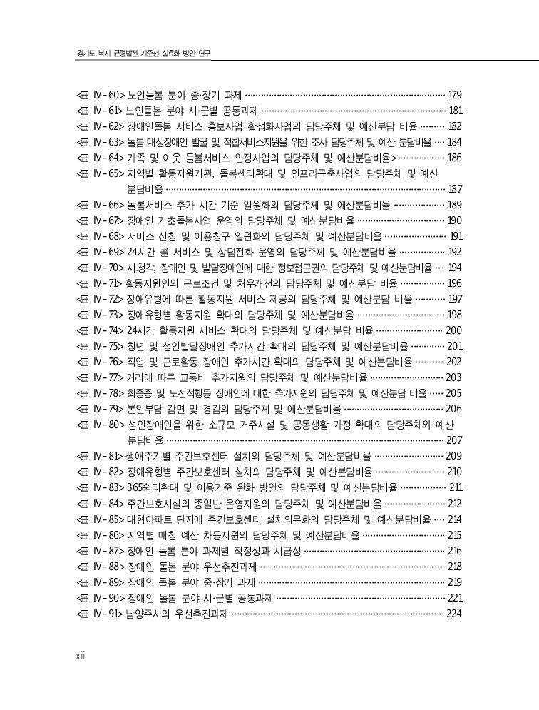 경기도 복지 균형발전 기준선 실효화 방안 연구 xii <표 Ⅳ-60> 노인돌봄 분야 중·장기 과제 ············································································ 179 <표 Ⅳ-61> 노인돌봄 분야 시·군별 공통과제 ······································································ 181 <표 Ⅳ-62> 장애인돌봄 서비스 홍보사업 활성화사업의 담당주체 및 예산분담 비율 ········· 182 <표 Ⅳ-63> 돌봄 대상장애인 발굴 및 적합서비스지원을 위한 조사 담당주체 및 예산 분담비율 ···· 184 <표 Ⅳ-64> 가족 및 이웃 돌봄서비스 인정사업의 담당주체 및 예산분담비율> ·················· 186 <표 Ⅳ-65> 지역별 활동지원기관, 돌봄센터확대 및 인프라구축사업의 담당주체 및 예산 분담비율 ·········································································································· 187 <표 Ⅳ-66> 돌봄서비스 추가 시간 기준 일원화의 담당주체 및 예산분담비율 ··················· 189 <표 Ⅳ-67> 장애인 기초돌봄사업 운영의 담당주체 및 예산분담비율 ································· 190 <표 Ⅳ-68> 서비스 신청 및 이용창구 일원화의 담당주체 및 예산분담비율 ······················· 191 <표 Ⅳ-69> 24시간 콜 서비스 및 상담전화 운영의 담당주체 및 예산분담비율 ················· 192 <표 Ⅳ-70> 시․청각, 장애인 및 발달장애인에 대한 정보접근권의 담당주체 및 예산분담비율 ··· 194 <표 Ⅳ-71> 활동지원인의 근로조건 및 처우개선의 담당주체 및 예산분담 비율 ················· 196 <표 Ⅳ-72> 장애유형에 따른 활동지원 서비스 제공의 담당주체 및 예산분담 비율 ··········· 197 <표 Ⅳ-73> 장애유형별 활동지원 확대의 담당주체 및 예산분담비율 ································· 198 <표 Ⅳ-74> 24시간 활동지원 서비스 확대의 담당주체 및 예산분담 비율 ························· 200 <표 Ⅳ-75> 청년 및 성인발달장애인 추가시간 확대의 담당주체 및 예산분담비율 ············· 201 <표 Ⅳ-76> 직업 및 근로활동 장애인 추가시간 확대의 담당주체 및 예산분담비율 ·········· 202 <표 Ⅳ-77> 거리에 따른 교통비 추가지원의 담당주체 및 예산분담비율 ···························· 203 <표 Ⅳ-78> 최중증 및 도전적행동 장애인에 대한 추가지원의 담당주체 및 예산분담 비율 ····· 205 <표 Ⅳ-79> 본인부담 감면 및 경감의 담당주체 및 예산분담비율 ······································ 206 <표 Ⅳ-80> 성인장애인을 위한 소규모 거주시설 및 공동생활 가정 확대의 담당주체와 예산 분담비율 ·········································································································· 207 <표 Ⅳ-81> 생애주기별 주간보호센터 설치의 담당주체 및 예산분담비율 ·························· 209 <표 Ⅳ-82> 장애유형별 주간보호센터 설치의 담당주체 및 예산분담비율 ·························· 210 <표 Ⅳ-83> 365쉼터확대 및 이용기준 완화 방안의 담당주체 및 예산분담비율 ················· 211 <표 Ⅳ-84> 주간보호시설의 종일반 운영지원의 담당주체 및 예산분담비율 ······················· 212 <표 Ⅳ-85> 대형아파트 단지에 주간보호센터 설치의무화의 담당주체 및 예산분담비율 ···· 214 <표 Ⅳ-86> 지역별 매칭 예산 차등지원의 담당주체 및 예산분담비율 ······························· 215 <표 Ⅳ-87> 장애인 돌봄 분야 과제별 적정성과 시급성 ······················································ 216 <표 Ⅳ-88> 장애인 돌봄 분야 우선추진과제 ······································································ 218 <표 Ⅳ-89> 장애인 돌봄 분야 중·장기 과제 ······································································· 219 <표 Ⅳ-90> 장애인 돌봄 분야 시·군별 공통과제 ································································ 221 <표 Ⅳ-91> 남양주시의 우선추진과제 ················································································· 224