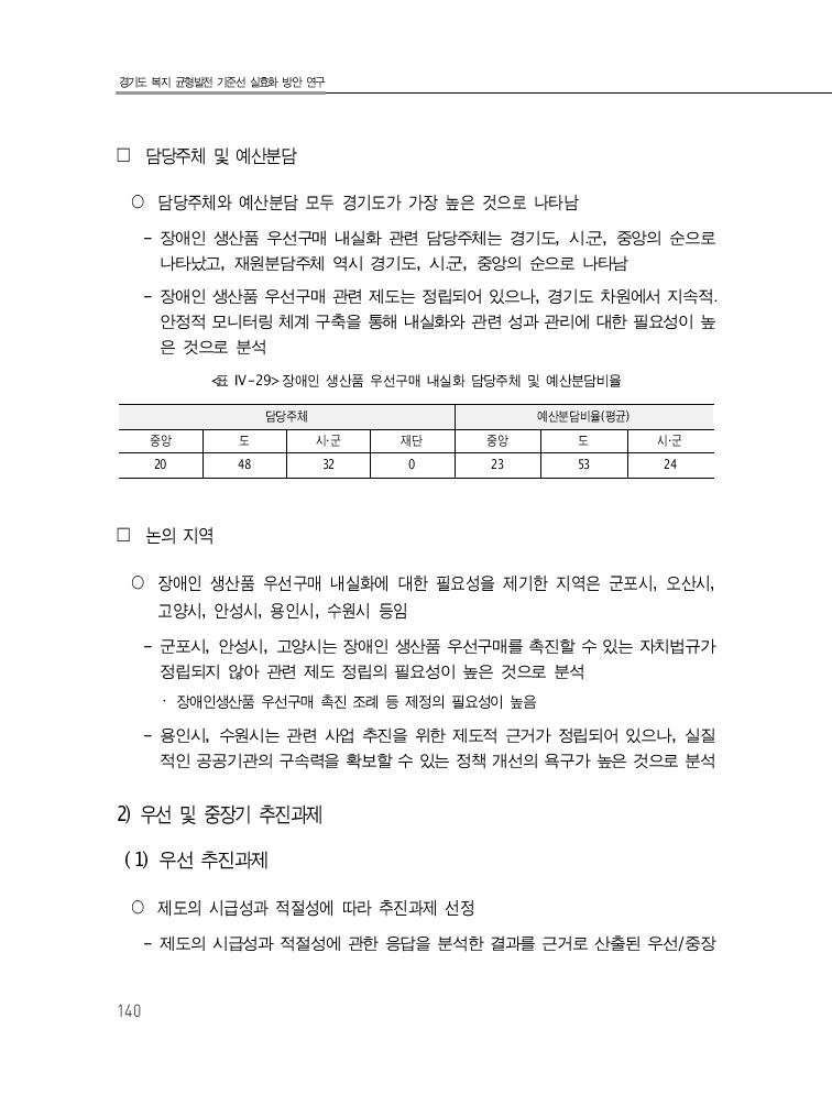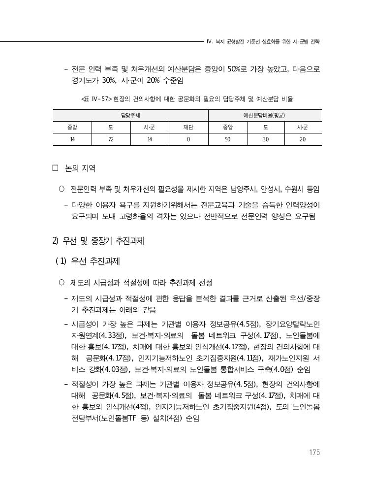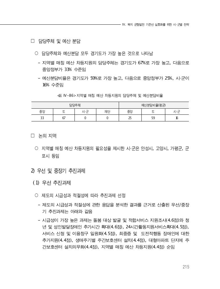 Ⅳ. 복지 균형발전 기준선 실효화를 위한 시·군별 전략 215 □ 담당주체 및 예산 분담 ○ 담당주체와 예산분담 모두 경기도가 가장 높은 것으로 나타남 - 지역별 매칭 예산 차등지원의 담당주체는 경기도가 67%로 가장 높고, 다음으로 중앙정부가 33% 수준임 - 예산분담비율은 경기도가 59%로 가장 높고, 다음으로 중앙정부가 25%, 시·군이 16% 수준임 담당주체 예산분담비율(평균) 중앙 도 시·군 재단 중앙 도 시·군 33 67 0 0 25 59 16 <표 Ⅳ-86> 지역별 매칭 예산 차등지원의 담당주체 및 예산분담비율 □ 논의 지역 ○ 지역별 매칭 예산 차등지원의 필요성을 제시한 시·군은 안성시, 고양시, 가평군, 군 포시 등임 2) 우선 및 중장기 추진과제 (1) 우선 추진과제 ○ 제도의 시급성과 적절성에 따라 추진과제 선정 - 제도의 시급성과 적절성에 관한 응답을 분석한 결과를 근거로 산출된 우선/중장 기 추진과제는 아래와 같음 - 시급성이 가장 높은 과제는 돌봄 대상 발굴 및 적합서비스 지원조사(4.6점)와 청 년 및 성인발달장애인 추가시간 확대(4.6점), 24시간활동지원서비스확대(4.5점), 서비스 신청 및 이용창구 일원화(4.5점), 최중증 및 도전적행동 장애인에 대한 추가지원(4.4점), 생애주기별 주간보호센터 설치(4.4점), 대형아파트 단지에 주 간보호센터 설치의무화(4.4점), 지역별 매칭 예산 차등지원(4.4점) 순임
