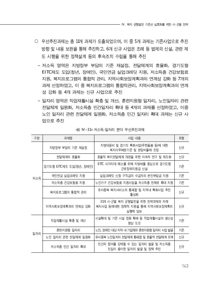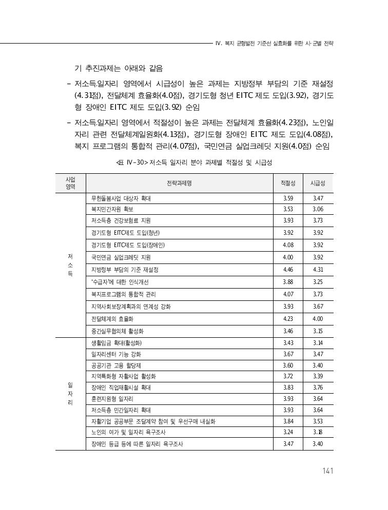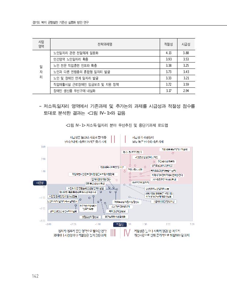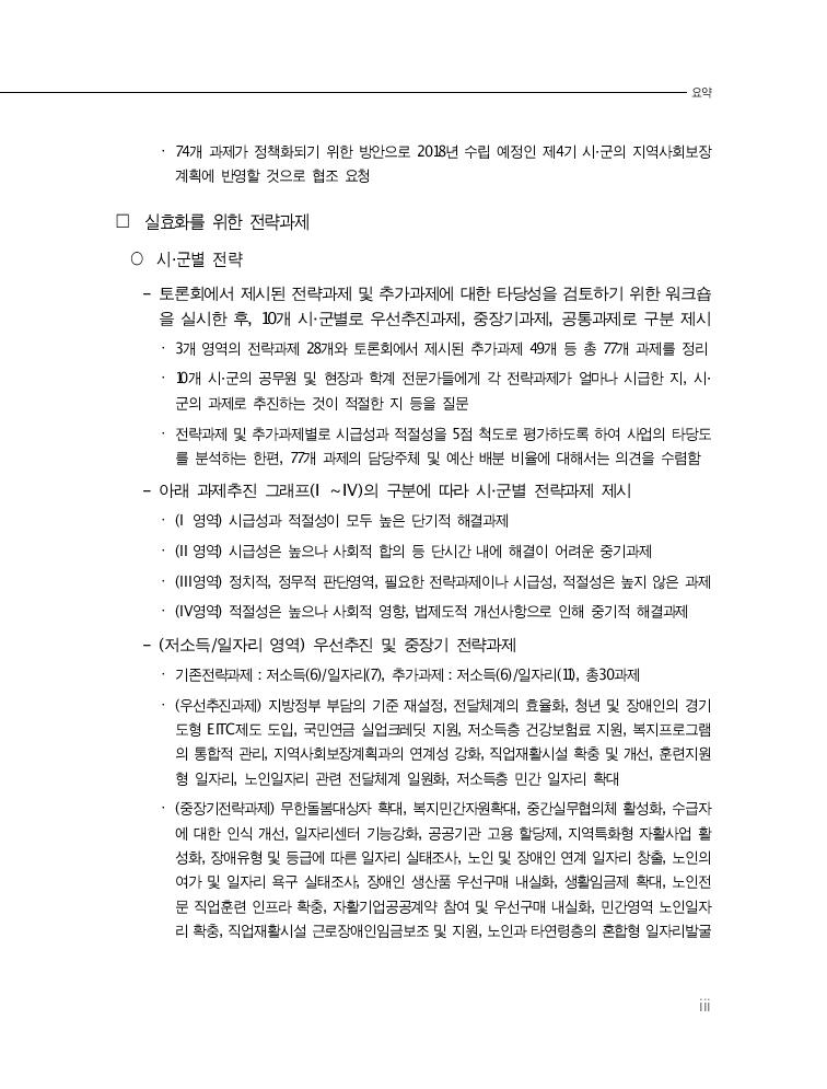 요약 iii ・ 74개 과제가 정책화되기 위한 방안으로 2018년 수립 예정인 제4기 시·군의 지역사회보장 계획에 반영할 것으로 협조 요청 □ 실효화를 위한 전략과제 ○ 시·군별 전략 - 토론회에서 제시된 전략과제 및 추가과제에 대한 타당성을 검토하기 위한 워크숍 을 실시한 후, 10개 시·군별로 우선추진과제, 중장기과제, 공통과제로 구분 제시 ・ 3개 영역의 전략과제 28개와 토론회에서 제시된 추가과제 49개 등 총 77개 과제를 정리 ・ 10개 시·군의 공무원 및 현장과 학계 전문가들에게 각 전략과제가 얼마나 시급한 지, 시· 군의 과제로 추진하는 것이 적절한 지 등을 질문 ・ 전략과제 및 추가과제별로 시급성과 적절성을 5점 척도로 평가하도록 하여 사업의 타당도 를 분석하는 한편, 77개 과제의 담당주체 및 예산 배분 비율에 대해서는 의견을 수렴함 - 아래 과제추진 그래프(Ⅰ~Ⅳ)의 구분에 따라 시·군별 전략과제 제시 ・ (Ⅰ영역) 시급성과 적절성이 모두 높은 단기적 해결과제 ・ (Ⅱ영역) 시급성은 높으나 사회적 합의 등 단시간 내에 해결이 어려운 중기과제 ・ (Ⅲ영역) 정치적, 정무적 판단영역, 필요한 전략과제이나 시급성, 적절성은 높지 않은 과제 ・ (Ⅳ영역) 적절성은 높으나 사회적 영향, 법제도적 개선사항으로 인해 중기적 해결과제 - (저소득/일자리 영역) 우선추진 및 중장기 전략과제 ・ 기존전략과제:저소득(6)/일자리(7), 추가과제:저소득(6)/일자리(11), 총30과제 ・ (우선추진과제) 지방정부 부담의 기준 재설정, 전달체계의 효율화, 청년 및 장애인의 경기 도형 EITC제도 도입, 국민연금 실업크레딧 지원, 저소득층 건강보험료 지원, 복지프로그램 의 통합적 관리, 지역사회보장계획과의 연계성 강화, 직업재활시설 확충 및 개선, 훈련지원 형 일자리, 노인일자리 관련 전달체계 일원화, 저소득층 민간 일자리 확대 ・ (중장기전략과제) 무한돌봄대상자 확대, 복지민간자원확대, 중간실무협의체 활성화, 수급자 에 대한 인식 개선, 일자리센터 기능강화, 공공기관 고용 할당제, 지역특화형 자활사업 활 성화, 장애유형 및 등급에 따른 일자리 실태조사, 노인 및 장애인 연계 일자리 창출, 노인의 여가 및 일자리 욕구 실태조사, 장애인 생산품 우선구매 내실화, 생활임금제 확대, 노인전 문 직업훈련 인프라 확충, 자활기업공공계약 참여 및 우선구매 내실화, 민간영역 노인일자 리 확충, 직업재활시설 근로장애인임금보조 및 지원, 노인과 타연령층의 혼합형 일자리발굴