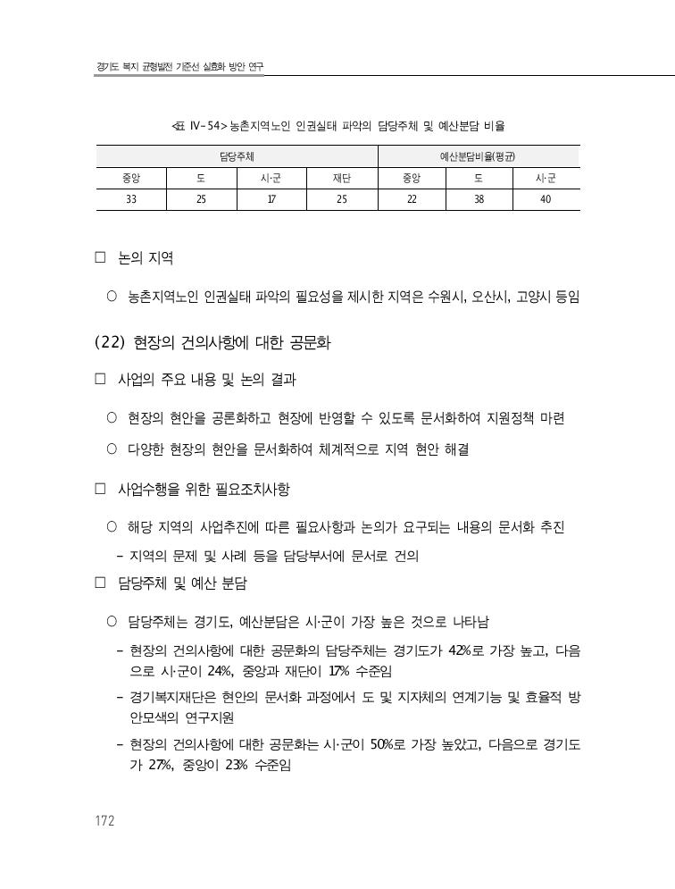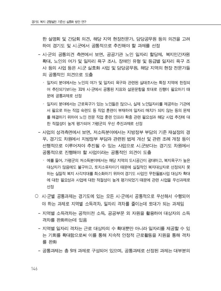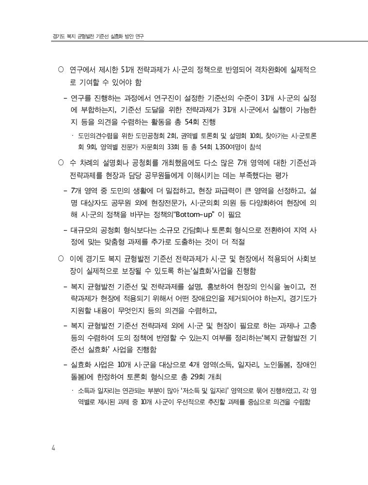 경기도 복지 균형발전 기준선 실효화 방안 연구 4 ○ 연구에서 제시한 51개 전략과제가 시·군의 정책으로 반영되어 격차완화에 실제적으 로 기여할 수 있어야 함 - 연구를 진행하는 과정에서 연구진이 설정한 기준선의 수준이 31개 시·군의 실정 에 부합하는지, 기준선 도달을 위한 전략과제가 31개 시·군에서 실행이 가능한 지 등을 의견을 수렴하는 활동을 총 54회 진행 ・ 도민의견수렴을 위한 도민공청회 2회, 권역별 토론회 및 설명회 10회, 찾아가는 시·군토론 회 9회, 영역별 전문가 자문회의 33회 등 총 54회 1,350여명이 참석 ○ 수 차례의 설명회나 공청회를 개최했음에도 다소 많은 7개 영역에 대한 기준선과 전략과제를 현장과 담당 공무원들에게 이해시키는 데는 부족했다는 평가 - 7개 영역 중 도민의 생활에 더 밀접하고, 현장 파급력이 큰 영역을 선정하고, 설 명 대상자도 공무원 외에 현장전문가, 시·군의회 의원 등 다양화하여 현장에 의 해 시·군의 정책을 바꾸는 정책의“Bottom-up" 이 필요 - 대규모의 공청회 형식보다는 소규모 간담회나 토론회 형식으로 전환하여 지역 사 정에 맞는 맞춤형 과제를 추가로 도출하는 것이 더 적절 ○ 이에 경기도 복지 균형발전 기준선 전략과제가 시·군 및 현장에서 적용되어 사회보 장이 실제적으로 보장될 수 있도록 하는‘실효화’사업을 진행함 - 복지 균형발전 기준선 및 전략과제를 설명, 홍보하여 현장의 인식을 높이고, 전 략과제가 현장에 적용되기 위해서 어떤 장애요인을 제거되어야 하는지, 경기도가 지원할 내용이 무엇인지 등의 의견을 수렴하고, - 복지 균형발전 기준선 전략과제 외에 시·군 및 현장이 필요로 하는 과제나 고충 등의 수렴하여 도의 정책에 반영할 수 있는지 여부를 정리하는‘복지 균형발전 기 준선 실효화’ 사업을 진행함 - 실효화 사업은 10개 시·군을 대상으로 4개 영역(소득, 일자리, 노인돌봄, 장애인 돌봄)에 한정하여 토론회 형식으로 총 29회 개최 ・ 소득과 일자리는 연관되는 부분이 많아 ‘저소득 및 일자리’ 영역으로 묶어 진행하였고, 각 영 역별로 제시된 과제 중 10개 시·군이 우선적으로 추진할 과제를 중심으로 의견을 수렴함