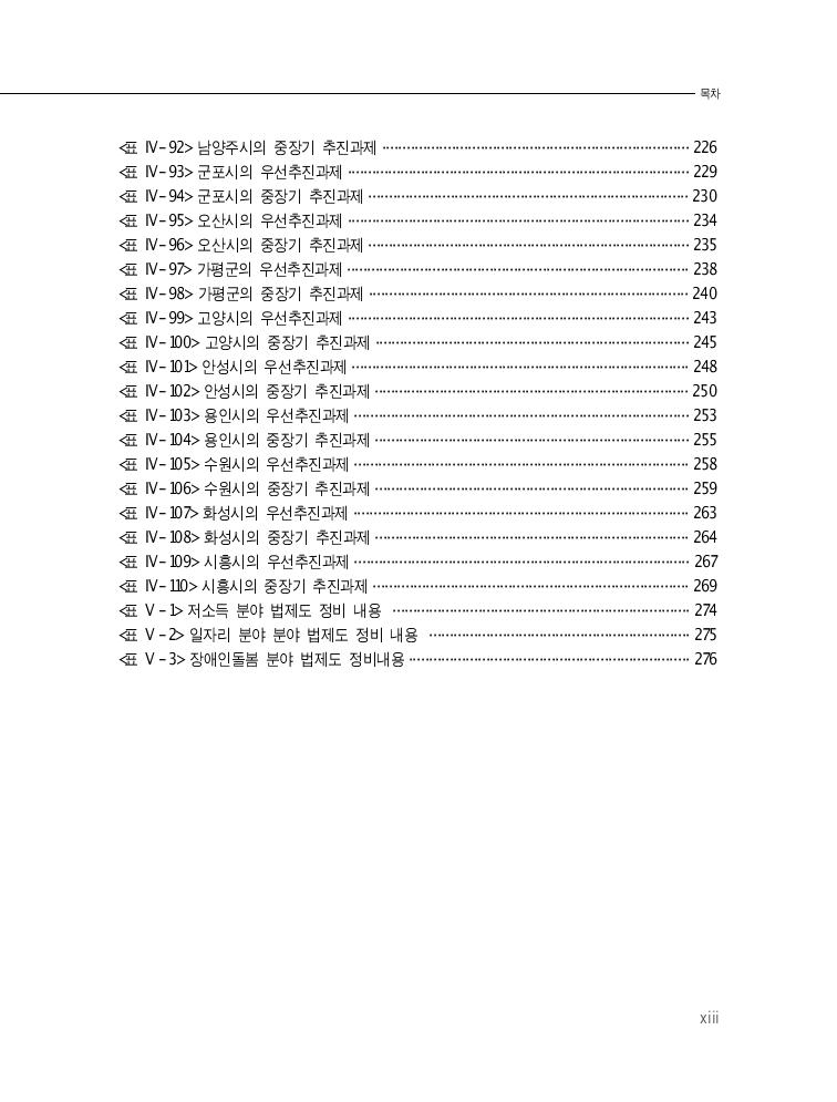 목차 xiii <표 Ⅳ-92> 남양주시의 중장기 추진과제 ··········································································· 226 <표 Ⅳ-93> 군포시의 우선추진과제 ···················································································· 229 <표 Ⅳ-94> 군포시의 중장기 추진과제 ·············································································· 230 <표 Ⅳ-95> 오산시의 우선추진과제 ···················································································· 234 <표 Ⅳ-96> 오산시의 중장기 추진과제 ··············································································· 235 <표 Ⅳ-97> 가평군의 우선추진과제 ···················································································· 238 <표 Ⅳ-98> 가평군의 중장기 추진과제 ·············································································· 240 <표 Ⅳ-99> 고양시의 우선추진과제 ···················································································· 243 <표 Ⅳ-100> 고양시의 중장기 추진과제 ············································································· 245 <표 Ⅳ-101> 안성시의 우선추진과제 ··················································································· 248 <표 Ⅳ-102> 안성시의 중장기 추진과제 ············································································· 250 <표 Ⅳ-103> 용인시의 우선추진과제 ·················································································· 253 <표 Ⅳ-104> 용인시의 중장기 추진과제 ············································································· 255 <표 Ⅳ-105> 수원시의 우선추진과제 ·················································································· 258 <표 Ⅳ-106> 수원시의 중장기 추진과제 ············································································· 259 <표 Ⅳ-107> 화성시의 우선추진과제 ·················································································· 263 <표 Ⅳ-108> 화성시의 중장기 추진과제 ············································································· 264 <표 Ⅳ-109> 시흥시의 우선추진과제 ·················································································· 267 <표 Ⅳ-110> 시흥시의 중장기 추진과제 ············································································· 269 <표 Ⅴ-1> 저소득 분야 법제도 정비 내용 ········································································· 274 <표 Ⅴ-2> 일자리 분야 분야 법제도 정비 내용 ································································ 275 <표 Ⅴ-3> 장애인돌봄 분야 법제도 정비내용 ····································································· 276