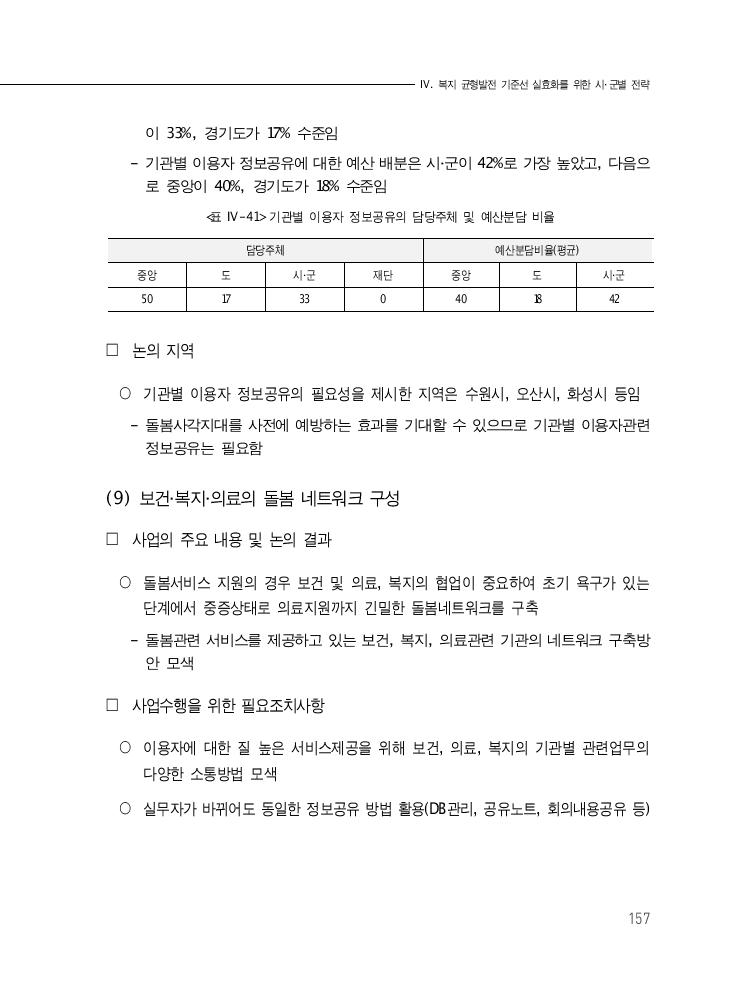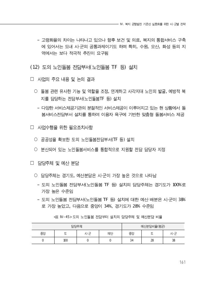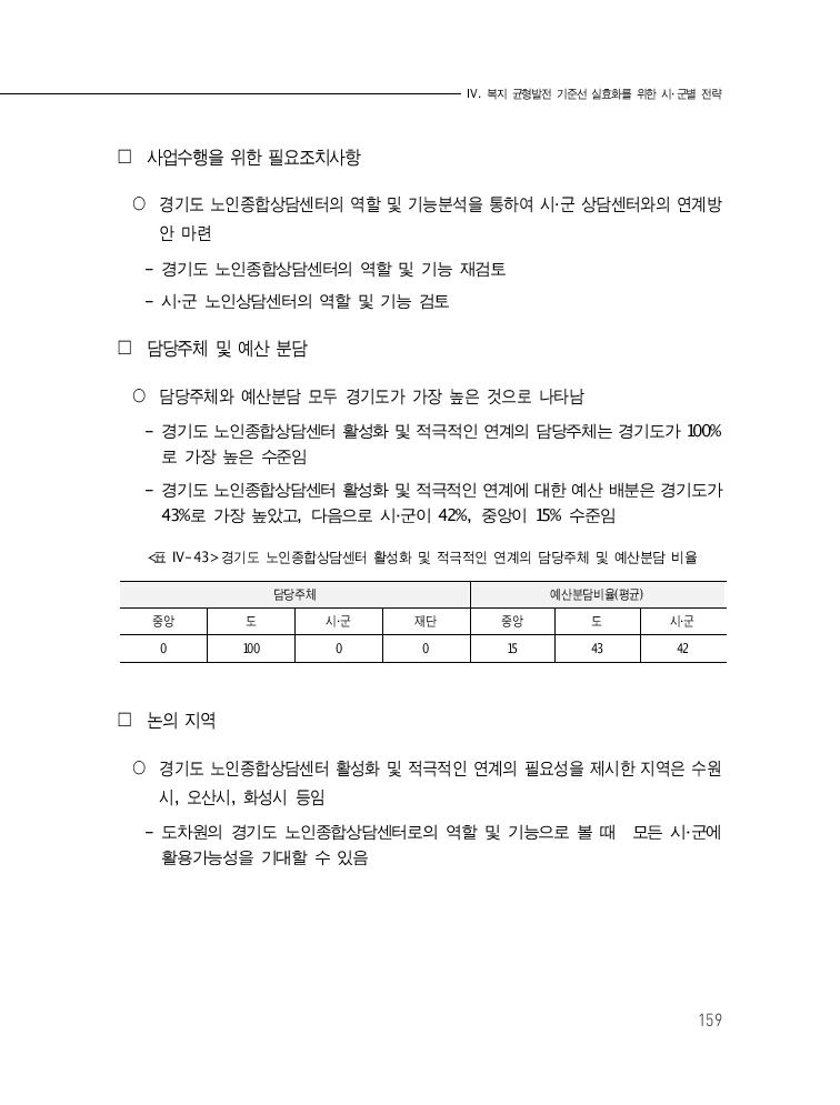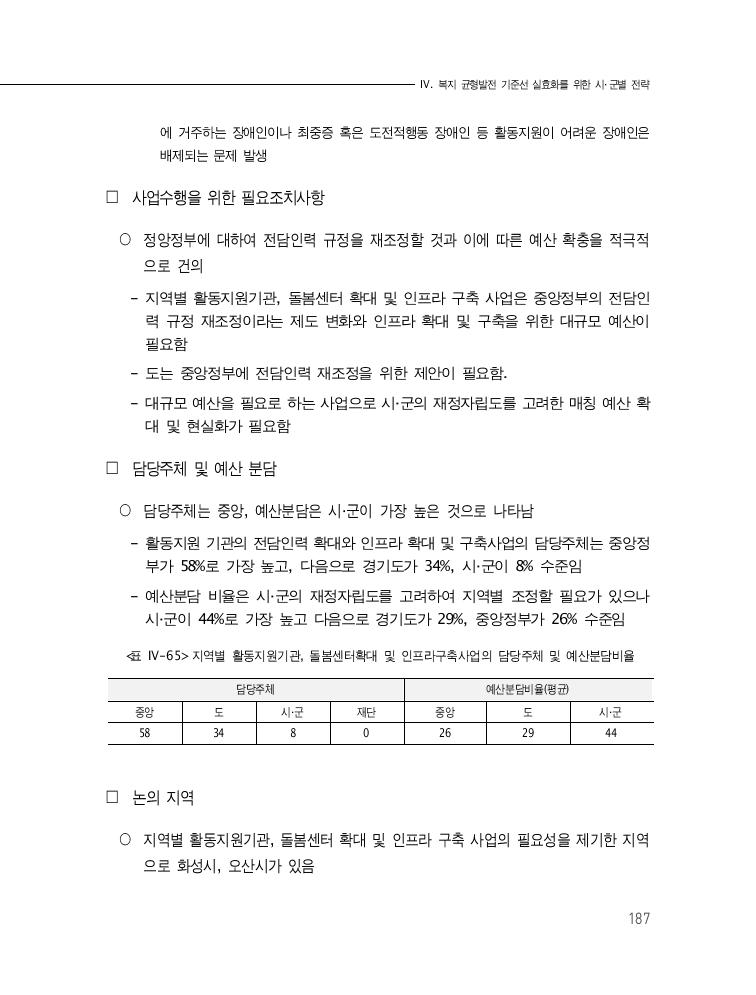 Ⅳ. 복지 균형발전 기준선 실효화를 위한 시·군별 전략 187 에 거주하는 장애인이나 최중증 혹은 도전적행동 장애인 등 활동지원이 어려운 장애인은 배제되는 문제 발생 □ 사업수행을 위한 필요조치사항 ○ 정앙정부에 대하여 전담인력 규정을 재조정할 것과 이에 따른 예산 확충을 적극적 으로 건의 - 지역별 활동지원기관, 돌봄센터 확대 및 인프라 구축 사업은 중앙정부의 전담인 력 규정 재조정이라는 제도 변화와 인프라 확대 및 구축을 위한 대규모 예산이 필요함 - 도는 중앙정부에 전담인력 재조정을 위한 제안이 필요함. - 대규모 예산을 필요로 하는 사업으로 시·군의 재정자립도를 고려한 매칭 예산 확 대 및 현실화가 필요함 □ 담당주체 및 예산 분담 ○ 담당주체는 중앙, 예산분담은 시·군이 가장 높은 것으로 나타남 - 활동지원 기관의 전담인력 확대와 인프라 확대 및 구축사업의 담당주체는 중앙정 부가 58%로 가장 높고, 다음으로 경기도가 34%, 시·군이 8% 수준임 - 예산분담 비율은 시·군의 재정자립도를 고려하여 지역별 조정할 필요가 있으나 시·군이 44%로 가장 높고 다음으로 경기도가 29%, 중앙정부가 26% 수준임 담당주체 예산분담비율(평균) 중앙 도 시·군 재단 중앙 도 시·군 58 34 8 0 26 29 44 <표 Ⅳ-65> 지역별 활동지원기관, 돌봄센터확대 및 인프라구축사업의 담당주체 및 예산분담비율 □ 논의 지역 ○ 지역별 활동지원기관, 돌봄센터 확대 및 인프라 구축 사업의 필요성을 제기한 지역 으로 화성시, 오산시가 있음