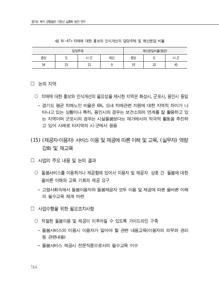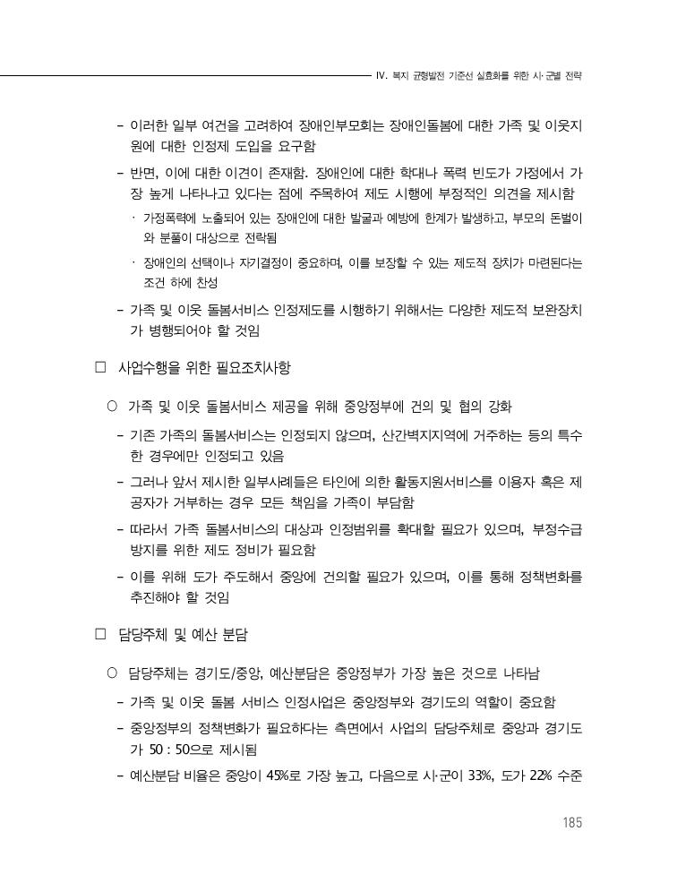 Ⅳ. 복지 균형발전 기준선 실효화를 위한 시·군별 전략 185 - 이러한 일부 여건을 고려하여 장애인부모회는 장애인돌봄에 대한 가족 및 이웃지 원에 대한 인정제 도입을 요구함 - 반면, 이에 대한 이견이 존재함. 장애인에 대한 학대나 폭력 빈도가 가정에서 가 장 높게 나타나고 있다는 점에 주목하여 제도 시행에 부정적인 의견을 제시함 ・ 가정폭력에 노출되어 있는 장애인에 대한 발굴과 예방에 한계가 발생하고, 부모의 돈벌이 와 분풀이 대상으로 전락됨 ・ 장애인의 선택이나 자기결정이 중요하며, 이를 보장할 수 있는 제도적 장치가 마련된다는 조건 하에 찬성 - 가족 및 이웃 돌봄서비스 인정제도를 시행하기 위해서는 다양한 제도적 보완장치 가 병행되어야 할 것임 □ 사업수행을 위한 필요조치사항 ○ 가족 및 이웃 돌봄서비스 제공을 위해 중앙정부에 건의 및 협의 강화 - 기존 가족의 돌봄서비스는 인정되지 않으며, 산간벽지지역에 거주하는 등의 특수 한 경우에만 인정되고 있음 - 그러나 앞서 제시한 일부사례들은 타인에 의한 활동지원서비스를 이용자 혹은 제 공자가 거부하는 경우 모든 책임을 가족이 부담함 - 따라서 가족 돌봄서비스의 대상과 인정범위를 확대할 필요가 있으며, 부정수급 방지를 위한 제도 정비가 필요함 - 이를 위해 도가 주도해서 중앙에 건의할 필요가 있으며, 이를 통해 정책변화를 추진해야 할 것임 □ 담당주체 및 예산 분담 ○ 담당주체는 경기도/중앙, 예산분담은 중앙정부가 가장 높은 것으로 나타남 - 가족 및 이웃 돌봄 서비스 인정사업은 중앙정부와 경기도의 역할이 중요함 - 중앙정부의 정책변화가 필요하다는 측면에서 사업의 담당주체로 중앙과 경기도 가 50:50으로 제시됨 - 예산분담 비율은 중앙이 45%로 가장 높고, 다음으로 시·군이 33%, 도가 22% 수준