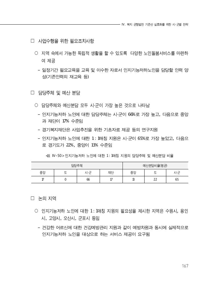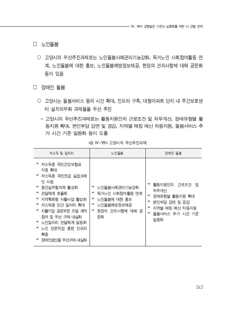 Ⅳ. 복지 균형발전 기준선 실효화를 위한 시·군별 전략 243 □ 노인돌봄 ○ 고양시의 우선추진과제로는 노인돌봄사례관리기능강화, 독거노인 사회참여활동 연 계, 노인돌봄에 대한 홍보, 노인돌봄예방정보제공, 현장의 건의사항에 대해 공문화 등이 있음 □ 장애인 돌봄 ○ 고양시는 돌봄서비스 등의 시간 확대, 인프라 구축, 대형아파트 단지 내 주간보호센 터 설치의무화 과제들을 우선 추진 - 고양시의 우선추진과제로는 활동지원인의 근로조건 및 처우개선, 장애유형별 활 동지원 확대, 본인부담 감면 및 경감, 지역별 매칭 예산 차등지원, 돌봄서비스 추 가 시간 기준 일원화 등이 도출 저소득 및 일자리 노인돌봄 장애인 돌봄  저소득층 국민건강보험료 지원 확대  저소득층 국민연금 실업크레 딧 지원  중간실무협의체 활성화  전달체계 효율화  지역특화형 자활사업 활성화  저소득층 민간 일자리 확대  자활기업 공공부문 조달 계약 참여 및 우선 구매 내실화  노인일자리 전달체계 일원화  노인 전문직업 훈련 인프라 확충  장애인생산품 우선구매 내실화  노인돌봄사례관리기능강화  독거노인 사회참여활동 연계  노인돌봄에 대한 홍보  노인돌봄예방정보제공  현장의 건의사항에 대해 공 문화  활동지원인의 근로조건 및 처우개선  장애유형별 활동지원 확대  본인부담 감면 및 경감  지역별 매칭 예산 차등지원  돌봄서비스 추가 시간 기준 일원화 <표 Ⅳ-99> 고양시의 우선추진과제
