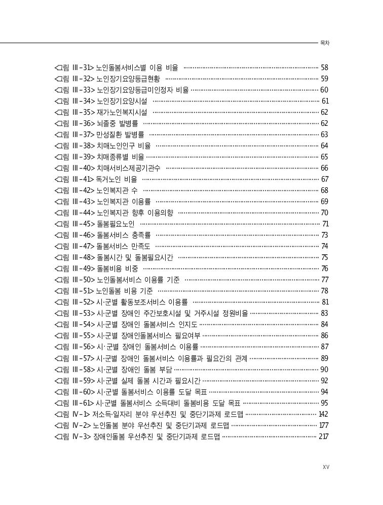 목차 xv <그림 Ⅲ-31> 노인돌봄서비스별 이용 비율 ········································································ 58 <그림 Ⅲ-32> 노인장기요양등급현황 ·················································································· 59 <그림 Ⅲ-33> 노인장기요양등급미인정자 비율 ···································································· 60 <그림 Ⅲ-34> 노인장기요양시설 ·························································································· 61 <그림 Ⅲ-35> 재가노인복지시설 ························································································· 62 <그림 Ⅲ-36> 뇌졸중 발병률 ······························································································ 62 <그림 Ⅲ-37> 만성질환 발병률 ··························································································· 63 <그림 Ⅲ-38> 치매노인인구 비율 ······················································································· 64 <그림 Ⅲ-39> 치매종류별 비율 ···························································································· 65 <그림 Ⅲ-40> 치매서비스제공기관수 ·················································································· 66 <그림 Ⅲ-41> 독거노인 비율 ······························································································· 67 <그림 Ⅲ-42> 노인복지관 수 ······························································································ 68 <그림 Ⅲ-43> 노인복지관 이용률 ······················································································· 69 <그림 Ⅲ-44> 노인복지관 향후 이용의향 ··········································································· 70 <그림 Ⅲ-45> 돌봄필요노인 ································································································· 71 <그림 Ⅲ-46> 돌봄서비스 충족률 ························································································ 73 <그림 Ⅲ-47> 돌봄서비스 만족도 ························································································ 74 <그림 Ⅲ-48> 돌봄시간 및 돌봄필요시간 ············································································ 75 <그림 Ⅲ-49> 돌봄비용 비중 ······························································································ 76 <그림 Ⅲ-50> 노인돌봄서비스 이용률 기준 ········································································ 77 <그림 Ⅲ-51> 노인돌봄 비용 기준 ······················································································ 78 <그림 Ⅲ-52> 시·군별 활동보조서비스 이용률 ···································································· 81 <그림 Ⅲ-53> 시·군별 장애인 주간보호시설 및 거주시설 정원비율 ····································· 83 <그림 Ⅲ-54> 시·군별 장애인 돌봄서비스 인지도 ································································ 84 <그림 Ⅲ-55> 시·군별 장애인돌봄서비스 필요여부 ······························································ 86 <그림 Ⅲ-56> 시・군별 장애인 돌봄서비스 이용률 ································································ 87 <그림 Ⅲ-57> 시·군별 장애인 돌봄서비스 이용률과 필요간의 관계 ····································· 89 <그림 Ⅲ-58> 시·군별 장애인 돌봄 부담 ············································································· 90 <그림 Ⅲ-59> 시·군별 실제 돌봄 시간과 필요시
