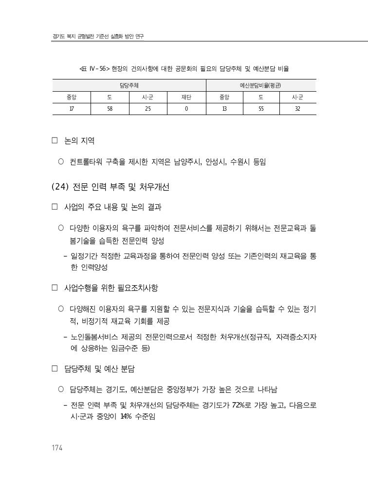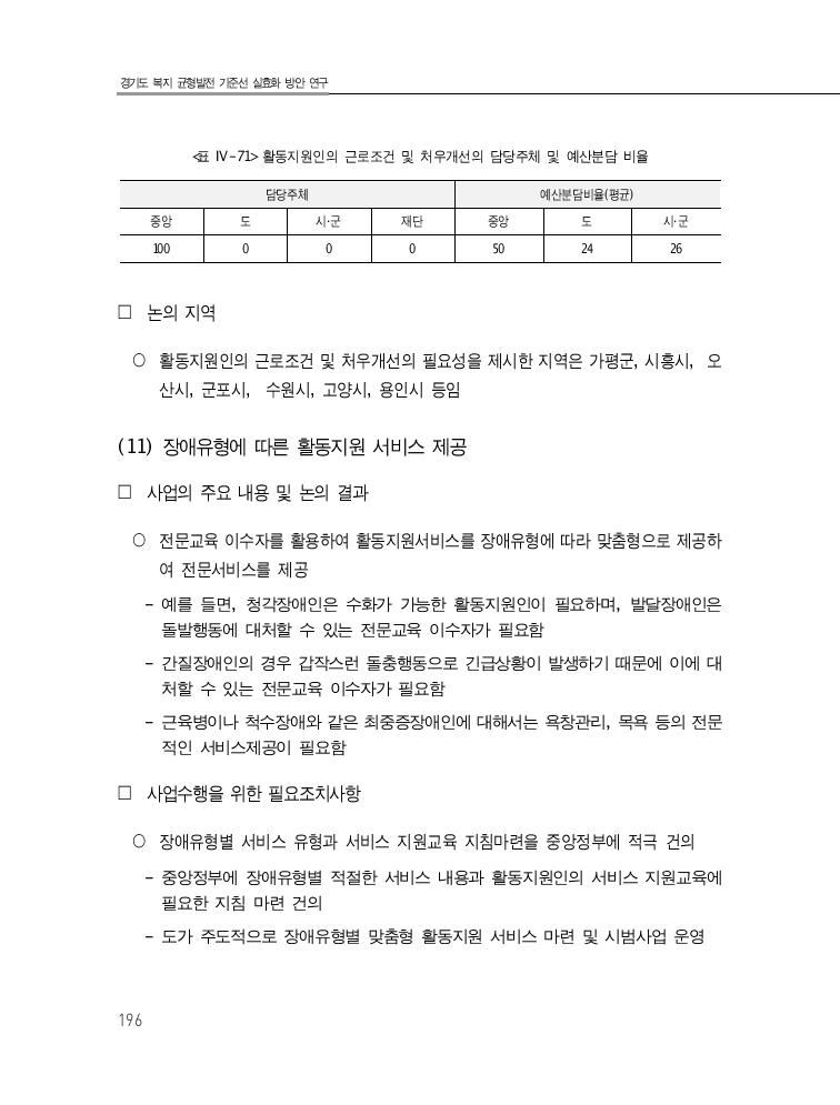 경기도 복지 균형발전 기준선 실효화 방안 연구 196 담당주체 예산분담비율(평균) 중앙 도 시·군 재단 중앙 도 시·군 100 0 0 0 50 24 26 <표 Ⅳ-71> 활동지원인의 근로조건 및 처우개선의 담당주체 및 예산분담 비율 □ 논의 지역 ○ 활동지원인의 근로조건 및 처우개선의 필요성을 제시한 지역은 가평군, 시흥시, 오 산시, 군포시, 수원시, 고양시, 용인시 등임 (11) 장애유형에 따른 활동지원 서비스 제공 □ 사업의 주요 내용 및 논의 결과 ○ 전문교육 이수자를 활용하여 활동지원서비스를 장애유형에 따라 맞춤형으로 제공하 여 전문서비스를 제공 - 예를 들면, 청각장애인은 수화가 가능한 활동지원인이 필요하며, 발달장애인은 돌발행동에 대처할 수 있는 전문교육 이수자가 필요함 - 간질장애인의 경우 갑작스런 돌충행동으로 긴급상황이 발생하기 때문에 이에 대 처할 수 있는 전문교육 이수자가 필요함 - 근육병이나 척수장애와 같은 최중증장애인에 대해서는 욕창관리, 목욕 등의 전문 적인 서비스제공이 필요함 □ 사업수행을 위한 필요조치사항 ○ 장애유형별 서비스 유형과 서비스 지원교육 지침마련을 중앙정부에 적극 건의 - 중앙정부에 장애유형별 적절한 서비스 내용과 활동지원인의 서비스 지원교육에 필요한 지침 마련 건의 - 도가 주도적으로 장애유형별 맞춤형 활동지원 서비스 마련 및 시범사업 운영