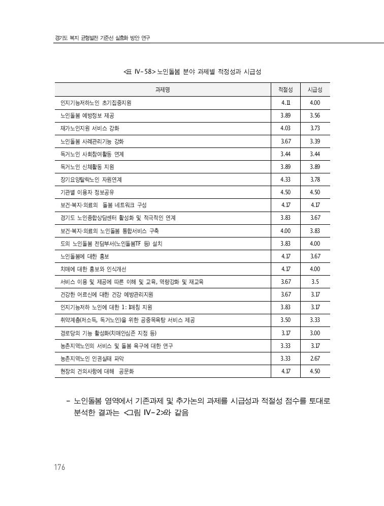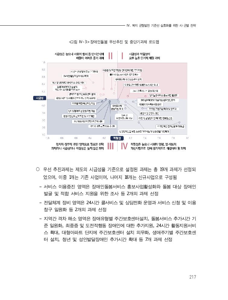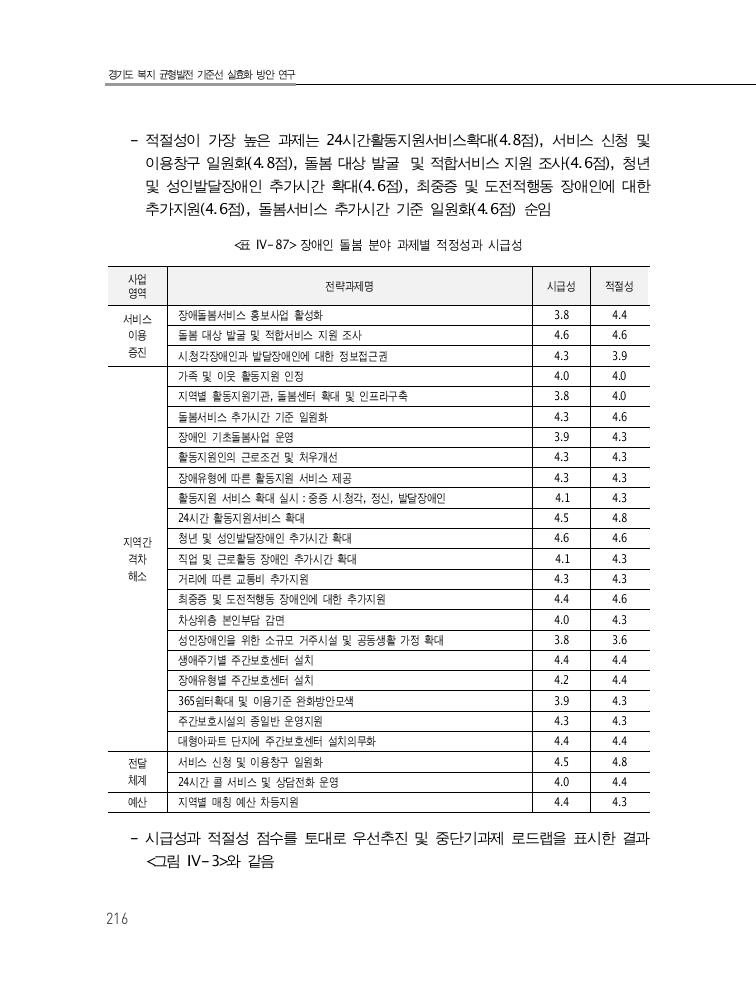 경기도 복지 균형발전 기준선 실효화 방안 연구 216 - 적절성이 가장 높은 과제는 24시간활동지원서비스확대(4.8점), 서비스 신청 및 이용창구 일원화(4.8점), 돌봄 대상 발굴 및 적합서비스 지원 조사(4.6점), 청년 및 성인발달장애인 추가시간 확대(4.6점), 최중증 및 도전적행동 장애인에 대한 추가지원(4.6점), 돌봄서비스 추가시간 기준 일원화(4.6점) 순임 사업 영역 전략과제명 시급성 적절성 서비스 이용 증진 장애돌봄서비스 홍보사업 활성화 3.8 4.4 돌봄 대상 발굴 및 적합서비스 지원 조사 4.6 4.6 시․청각장애인과 발달장애인에 대한 정보접근권 4.3 3.9 지역간 격차 해소 가족 및 이웃 활동지원 인정 4.0 4.0 지역별 활동지원기관, 돌봄센터 확대 및 인프라구축 3.8 4.0 돌봄서비스 추가시간 기준 일원화 4.3 4.6 장애인 기초돌봄사업 운영 3.9 4.3 활동지원인의 근로조건 및 처우개선 4.3 4.3 장애유형에 따른 활동지원 서비스 제공 4.3 4.3 활동지원 서비스 확대 실시:중증 시․청각, 정신, 발달장애인 4.1 4.3 24시간 활동지원서비스 확대 4.5 4.8 청년 및 성인발달장애인 추가시간 확대 4.6 4.6 직업 및 근로활동 장애인 추가시간 확대 4.1 4.3 거리에 따른 교통비 추가지원 4.3 4.3 최중증 및 도전적행동 장애인에 대한 추가지원 4.4 4.6 차상위층 본인부담 감면 4.0 4.3 성인장애인을 위한 소규모 거주시설 및 공동생활 가정 확대 3.8 3.6 생애주기별 주간보호센터 설치 4.4 4.4 장애유형별 주간보호센터 설치 4.2 4.4 365쉼터확대 및 이용기준 완화방안모색 3.9 4.3 주간보호시설의 종일반 운영지원 4.3 4.3 대형아파트 단지에 주간보호센터 설치의무화 4.4 4.4 전달 체계 서비스 신청 및 이용창구 일원화 4.5 4.8 24시간 콜 서비스 및 상담전화 운영 4.0 4.4 예산 지역별 매칭 예산 차등지원 4.4 4.3 <표 Ⅳ-87> 장애인 돌봄 분야 과제별 적정성과 시급성 - 시급성과 적절성 점수를 토대로 우선추진 및 중단기과제 로드랩을 표시한 결과 <그림 Ⅳ-3>와 같음