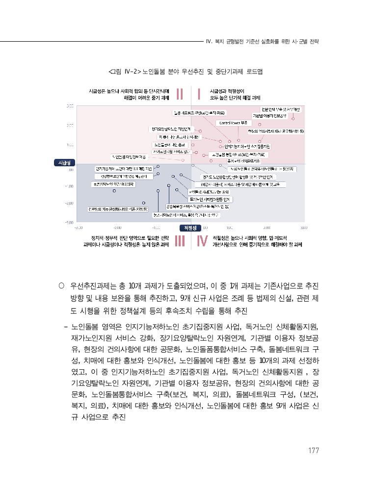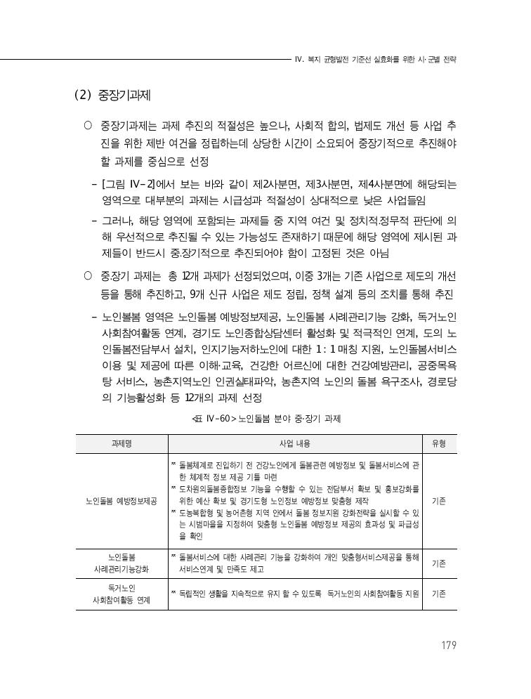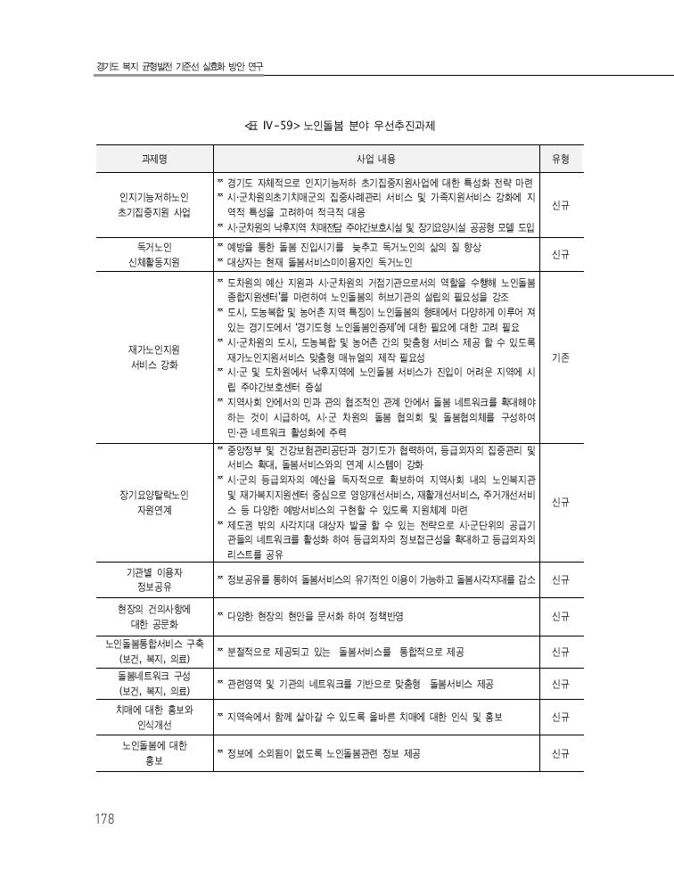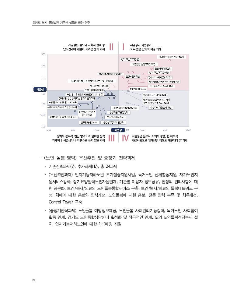 경기도 복지 균형발전 기준선 실효화 방안 연구 iv - (노인 돌봄 영역) 우선추진 및 중장기 전략과제 ・ 기존전략과제(7), 추가과제(17), 총 24과제 ・ (우선추진과제) 인지기능저하노인 초기집중지원사업, 독거노인 신체활동지원, 재가노인지 원서비스강화, 장기요양탈락노인자원연계, 기관별 이용자 정보공유, 현장의 건의사항에 대 한 공문화, 보건/복지/의료의 노인돌봄통합서비스 구축, 보건/복지/의료의 돌봄네트워크 구 성, 치매에 대한 홍보와 인식개선, 노인돌봄에 대한 홍보, 전문 인력 부족 및 처우개선, Control Tower 구축 ・ (중장기전략과제) 노인돌봄 예방정보제공, 노인돌봄 사례관리기능강화, 독거노인 사회참여 활동 연계, 경기도 노인종합상담센터 활성화 및 적극적인 연계, 도의 노인돌봄전담부서 설 치, 인지기능저하노인에 대한 1:1매칭 지원