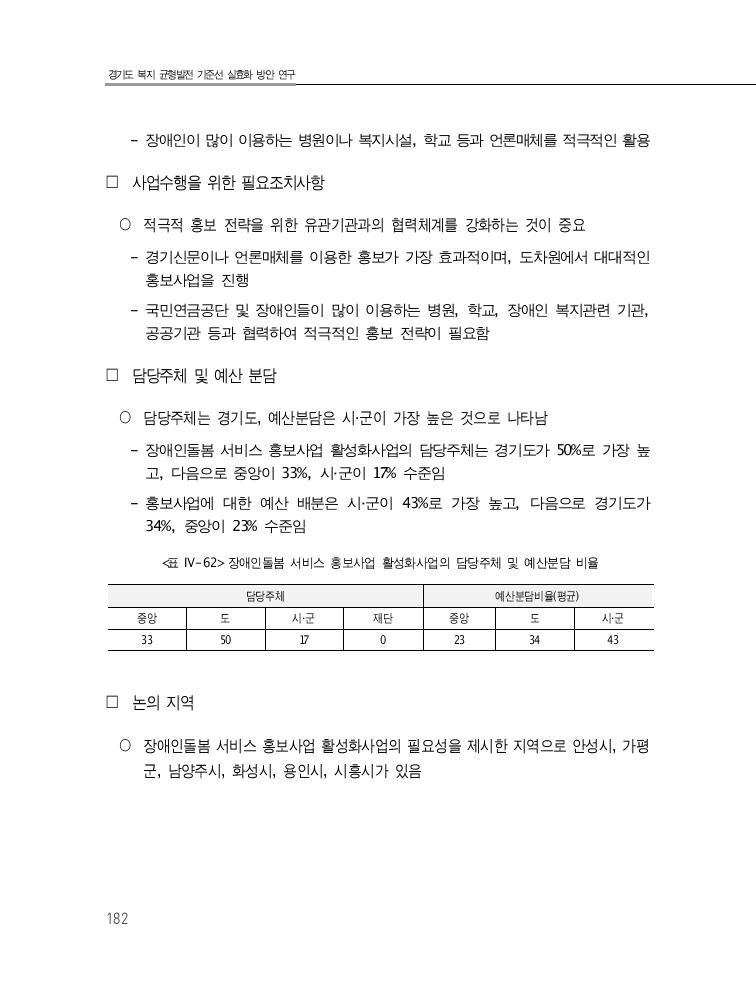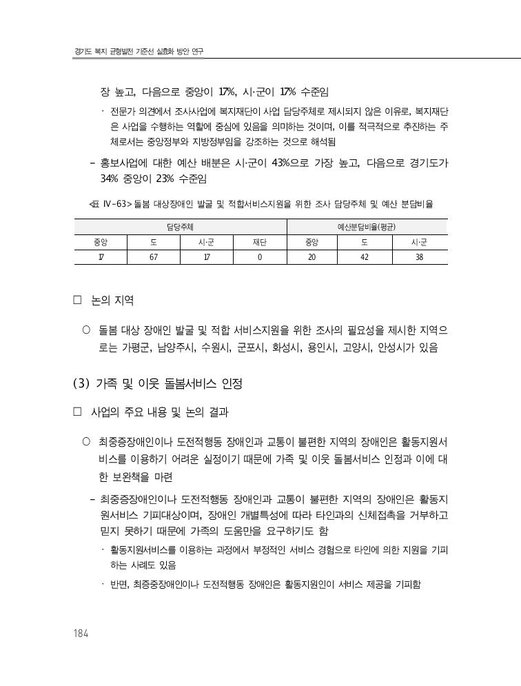 경기도 복지 균형발전 기준선 실효화 방안 연구 184 장 높고, 다음으로 중앙이 17%, 시·군이 17% 수준임 ・ 전문가 의견에서 조사사업에 복지재단이 사업 담당주체로 제시되지 않은 이유로, 복지재단 은 사업을 수행하는 역할에 중심에 있음을 의미하는 것이며, 이를 적극적으로 추진하는 주 체로서는 중앙정부와 지방정부임을 강조하는 것으로 해석됨 - 홍보사업에 대한 예산 배분은 시·군이 43%으로 가장 높고, 다음으로 경기도가 34% 중앙이 23% 수준임 담당주체 예산분담비율(평균) 중앙 도 시·군 재단 중앙 도 시·군 17 67 17 0 20 42 38 <표 Ⅳ-63> 돌봄 대상장애인 발굴 및 적합서비스지원을 위한 조사 담당주체 및 예산 분담비율 □ 논의 지역 ○ 돌봄 대상 장애인 발굴 및 적합 서비스지원을 위한 조사의 필요성을 제시한 지역으 로는 가평군, 남양주시, 수원시, 군포시, 화성시, 용인시, 고양시, 안성시가 있음 (3) 가족 및 이웃 돌봄서비스 인정 □ 사업의 주요 내용 및 논의 결과 ○ 최중증장애인이나 도전적행동 장애인과 교통이 불편한 지역의 장애인은 활동지원서 비스를 이용하기 어려운 실정이기 때문에 가족 및 이웃 돌봄서비스 인정과 이에 대 한 보완책을 마련 - 최중증장애인이나 도전적행동 장애인과 교통이 불편한 지역의 장애인은 활동지 원서비스 기피대상이며, 장애인 개별특성에 따라 타인과의 신체접촉을 거부하고 믿지 못하기 때문에 가족의 도움만을 요구하기도 함 ・ 활동지원서비스를 이용하는 과정에서 부정적인 서비스 경험으로 타인에 의한 지원을 기피 하는 사례도 있음 ・ 반면, 최증중장애인이나 도전적행동 장애인은 활동지원인이 서비스 제공을 기피함