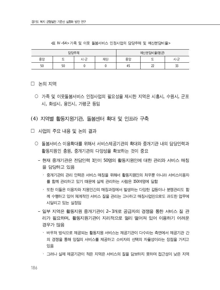 경기도 복지 균형발전 기준선 실효화 방안 연구 186 담당주체 예산분담비율(평균) 중앙 도 시·군 재단 중앙 도 시·군 50 50 0 0 45 22 33 <표 Ⅳ-64> 가족 및 이웃 돌봄서비스 인정사업의 담당주체 및 예산분담비율> □ 논의 지역 ○ 가족 및 이웃돌봄서비스 인정사업의 필요성을 제시한 지역은 시흥시, 수원시, 군포 시, 화성시, 용인시, 가평군 등임 (4) 지역별 활동지원기관, 돌봄센터 확대 및 인프라 구축 □ 사업의 주요 내용 및 논의 결과 ○ 돌봄서비스 이용확대를 위해서 서비스제공기관의 확대와 중개기관 내의 담당인력과 활동지원인 충원, 중개기관의 다양성을 확보하는 것이 중요 - 현재 중개기관은 전담인력 1인이 50명의 활동지원인에 대한 관리와 서비스 매칭 을 담당하고 있음 ・ 중개기관의 관리 인력은 서비스 매칭을 위해서 활동지원인의 처우뿐 아니라 서비스이용자 를 함께 관리하고 있기 때문에 실제 관리하는 사람은 150여명에 달함 ・ 또한 이들은 이용자와 지원인간의 매칭과정에서 발생하는 다양한 갈등이나 분쟁관리도 함 께 수행하고 있어 체계적인 서비스 질을 관리는 고사하고 매칭사업만으로도 과도한 업무에 시달리고 있는 실정임 - 일부 지역은 활동지원 중개기관이 2~3개로 공급자의 경쟁을 통한 서비스 질 관 리가 필요하며, 활동지원기관이 지리적으로 멀리 떨어져 있어 이용하기 어려운 경우가 많음 ・ 바우처 방식으로 제공되는 활동지원 서비스는 제공기관이 다수라는 측면에서 제공기관 간 의 경쟁을 통해 양질의 서비스를 제공하고 소비자의 선택의 자율성이라는 장점을 가지고 있음 ・ 그러나 실제 제공기관이 적은 지역은 서비스의 질을 담보하지 못하며 접근성이 낮은 지역