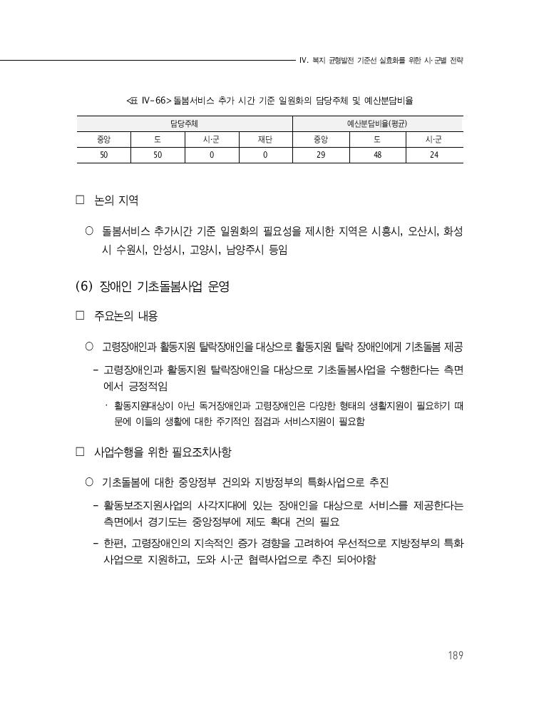 Ⅳ. 복지 균형발전 기준선 실효화를 위한 시·군별 전략 189 담당주체 예산분담비율(평균) 중앙 도 시·군 재단 중앙 도 시·군 50 50 0 0 29 48 24 <표 Ⅳ-66> 돌봄서비스 추가 시간 기준 일원화의 담당주체 및 예산분담비율 □ 논의 지역 ○ 돌봄서비스 추가시간 기준 일원화의 필요성을 제시한 지역은 시흥시, 오산시, 화성 시 수원시, 안성시, 고양시, 남양주시 등임 (6) 장애인 기초돌봄사업 운영 □ 주요논의 내용 ○ 고령장애인과 활동지원 탈락장애인을 대상으로 활동지원 탈락 장애인에게 기초돌봄 제공 - 고령장애인과 활동지원 탈락장애인을 대상으로 기초돌봄사업을 수행한다는 측면 에서 긍정적임 ・ 활동지원대상이 아닌 독거장애인과 고령장애인은 다양한 형태의 생활지원이 필요하기 때 문에 이들의 생활에 대한 주기적인 점검과 서비스지원이 필요함 □ 사업수행을 위한 필요조치사항 ○ 기초돌봄에 대한 중앙정부 건의와 지방정부의 특화사업으로 추진 - 활동보조지원사업의 사각지대에 있는 장애인을 대상으로 서비스를 제공한다는 측면에서 경기도는 중앙정부에 제도 확대 건의 필요 - 한편, 고령장애인의 지속적인 증가 경향을 고려하여 우선적으로 지방정부의 특화 사업으로 지원하고, 도와 시·군 협력사업으로 추진 되어야함