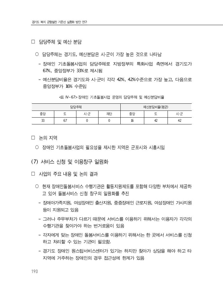 경기도 복지 균형발전 기준선 실효화 방안 연구 190 □ 담당주체 및 예산 분담 ○ 담당주체는 경기도, 예산분담은 시·군이 가장 높은 것으로 나타남 - 장애인 기초돌봄사업의 담당주체로 지방정부의 특화사업 측면에서 경기도가 67%, 중앙정부가 33%로 제시됨 - 예산분담비율은 경기도와 시·군이 각각 42%, 42%수준으로 가장 높고, 다음으로 중앙정부가 16% 수준임 담당주체 예산분담비율(평균) 중앙 도 시·군 재단 중앙 도 시·군 33 67 0 0 16 42 42 <표 Ⅳ-67> 장애인 기초돌봄사업 운영의 담당주체 및 예산분담비율 □ 논의 지역 ○ 장애인 기초돌봄사업의 필요성을 제시한 지역은 군포시와 시흥시임 (7) 서비스 신청 및 이용창구 일원화 □ 사업의 주요 내용 및 논의 결과 ○ 현재 장애인돌봄서비스 수행기관은 활동지원제도를 포함해 다양한 부처에서 제공하 고 있어 돌봄서비스 신청 창구의 일원화를 추진 - 장애아가족지원, 여성장애인 출산지원, 중증장애인 근로지원, 여성장애인 가사지원 등이 지원되고 있음 - 그러나 주무부처가 다르기 때문에 서비스를 이용하기 위해서는 이용자가 각각의 수행기관을 찾아가야 하는 번거로움이 있음 - 각자에게 맞는 장애인 돌봄서비스를 이용하기 위해서는 한 곳에서 서비스를 신청 하고 처리할 수 있는 기관이 필요함. - 경기도 장애인 원스탑서비스센터가 있기는 하지만 찾아가 상담을 해야 하고 타 지역에 거주하는 장애인의 경우 접근성에 한계가 있음